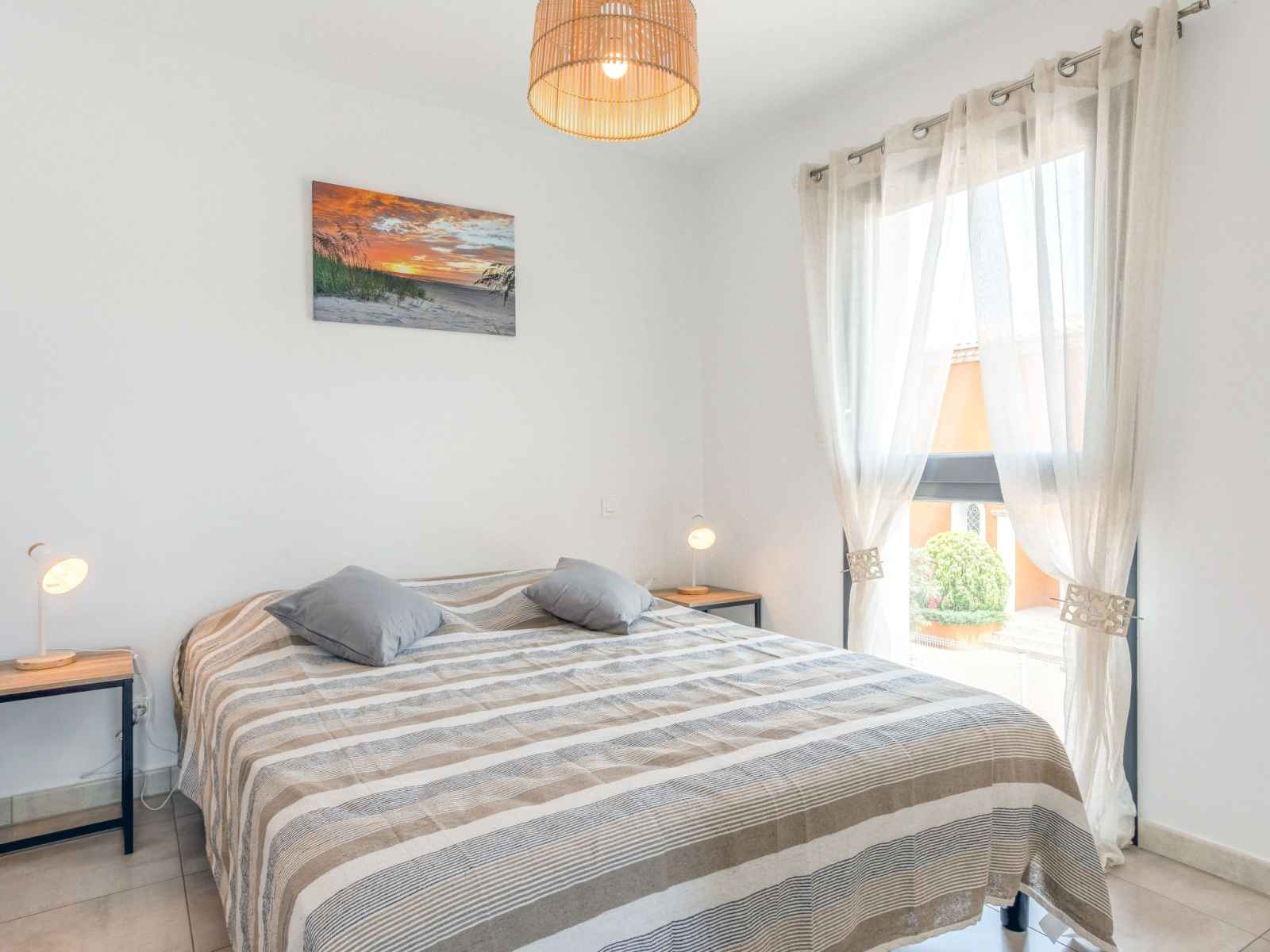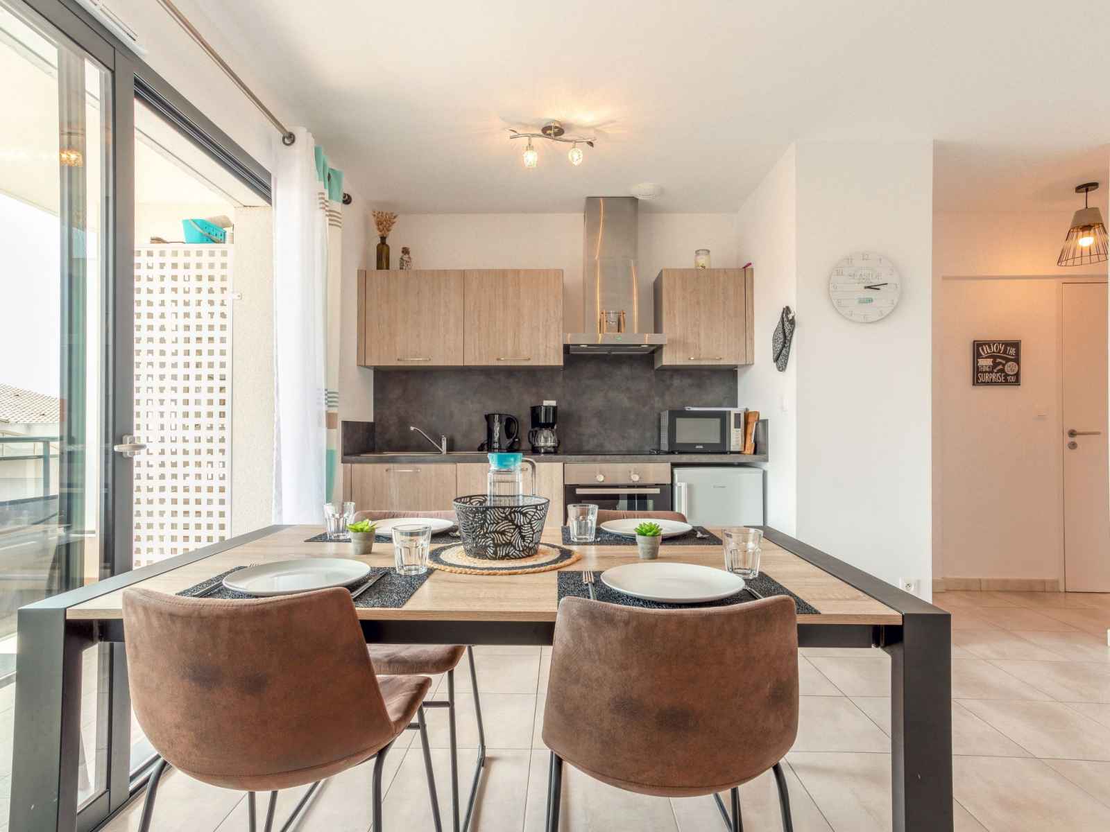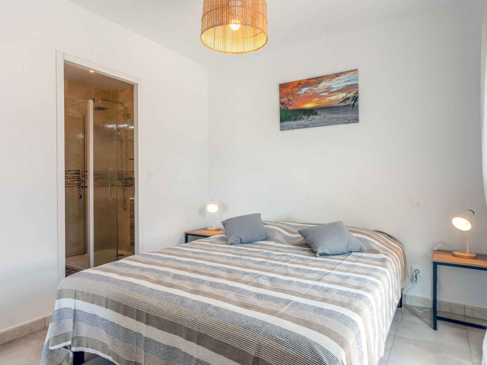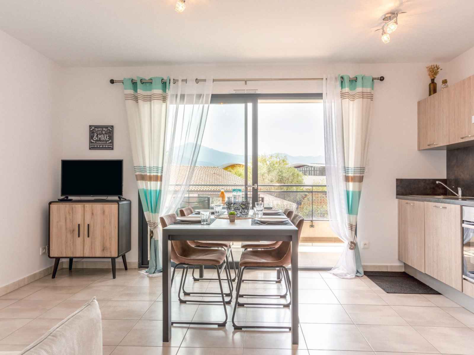 Apt 2 pièces 33 m2 au 1er étage. aménagement agréable: séjour/salle à manger avec 1 divan-lit double (140 cm, longueur 190 cm), tv (écran plat). sortie sur la terrasse. 1 chambre avec 1 grand-lit (160 cm, longueur 200 cm), lavabo et douche. cuisine ouverte (four, lave-vaisselle, 4 plaques vitrocéramiques, grille-pain, micro-ondes,