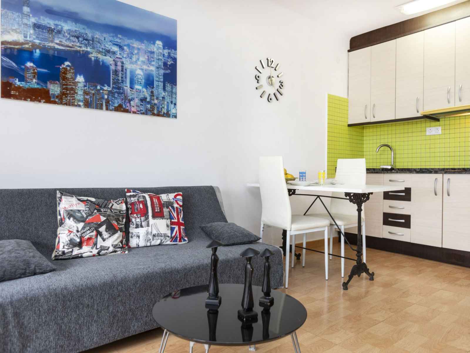 "memling", apt 2 pièces 45 m2 au 1er étage. aménagement simple: séjour/salle à manger avec table pour les repas et télévision numérique. sortie sur la loggia. 1 chambre avec 1 grand-lit (135 cm, longueur 190 cm), radiateur électrique et ventilateur. cuisine ouverte (3 plaques vitrocéramiques, bouilloire électrique, micro-ondes,