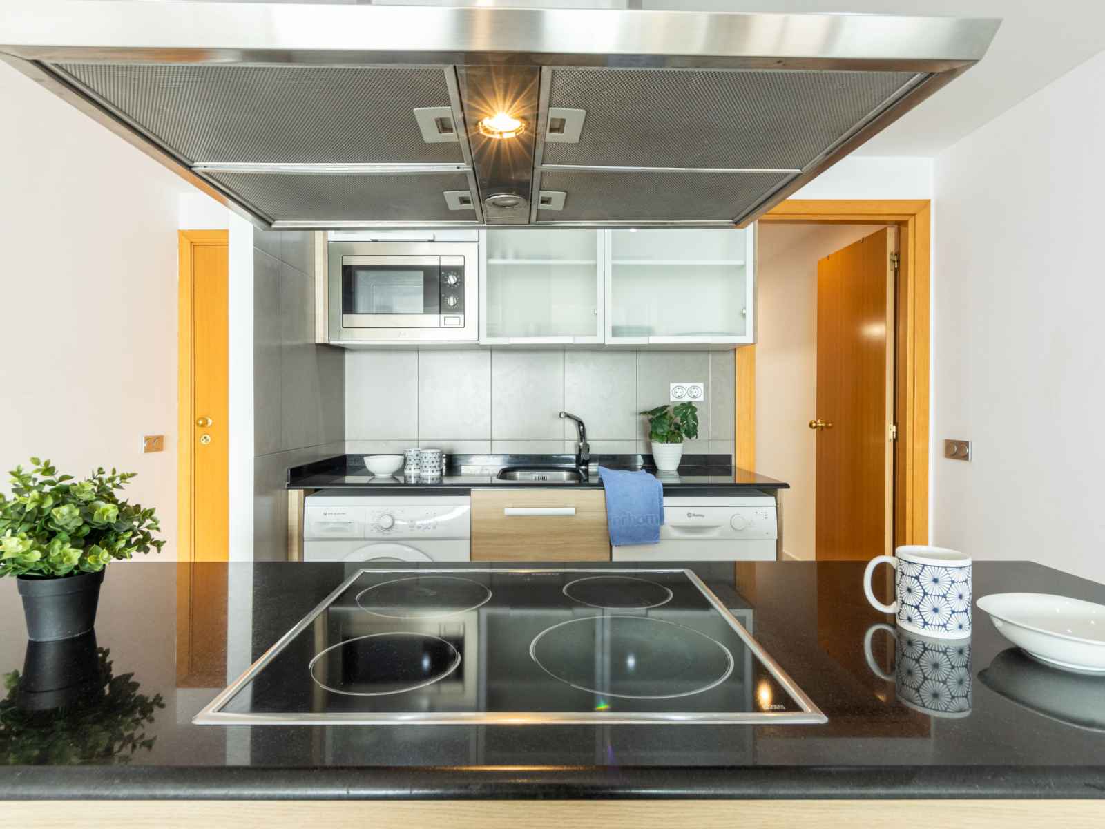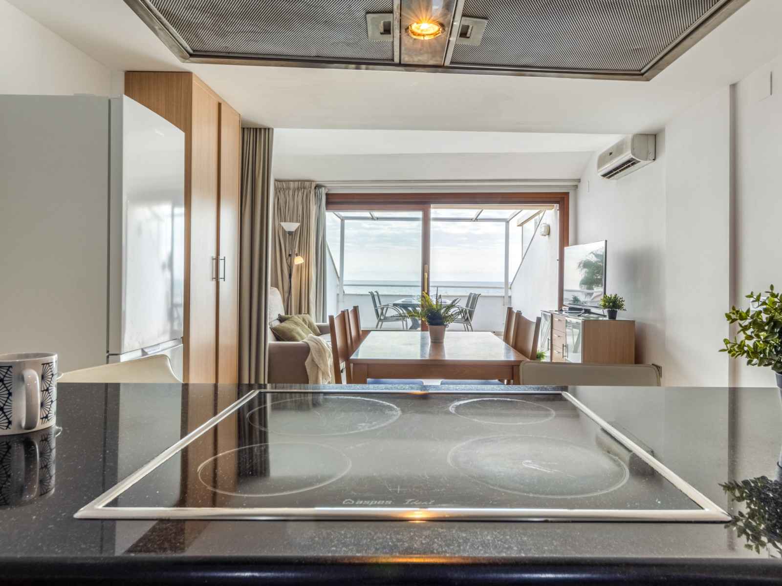 ouverte (four, lave-vaisselle, 3 plaques vitrocéramiques, grille-pain, bouilloire électrique, micro-ondes, cafetière électrique, Capsules pour machine à café (Nespresso)) avec table pour les repas, chauffe eau (100 litres). Douche/WC. Chauffage pas dans toutes les pièces. Balcon. Mobilier de balcon. Très belle vue panoramique sur la mer. A disposition: lave-linge, fer à repasser, chaise haute pour enfant, lit bébé, sèche-cheveux. Adapté(e) aux familles. Maximum 1 animal/ chien autorisé. HUTT-008873 // Reg. Nr.: ESFCTU00004303100042064700000000000000HUTT-008873-498