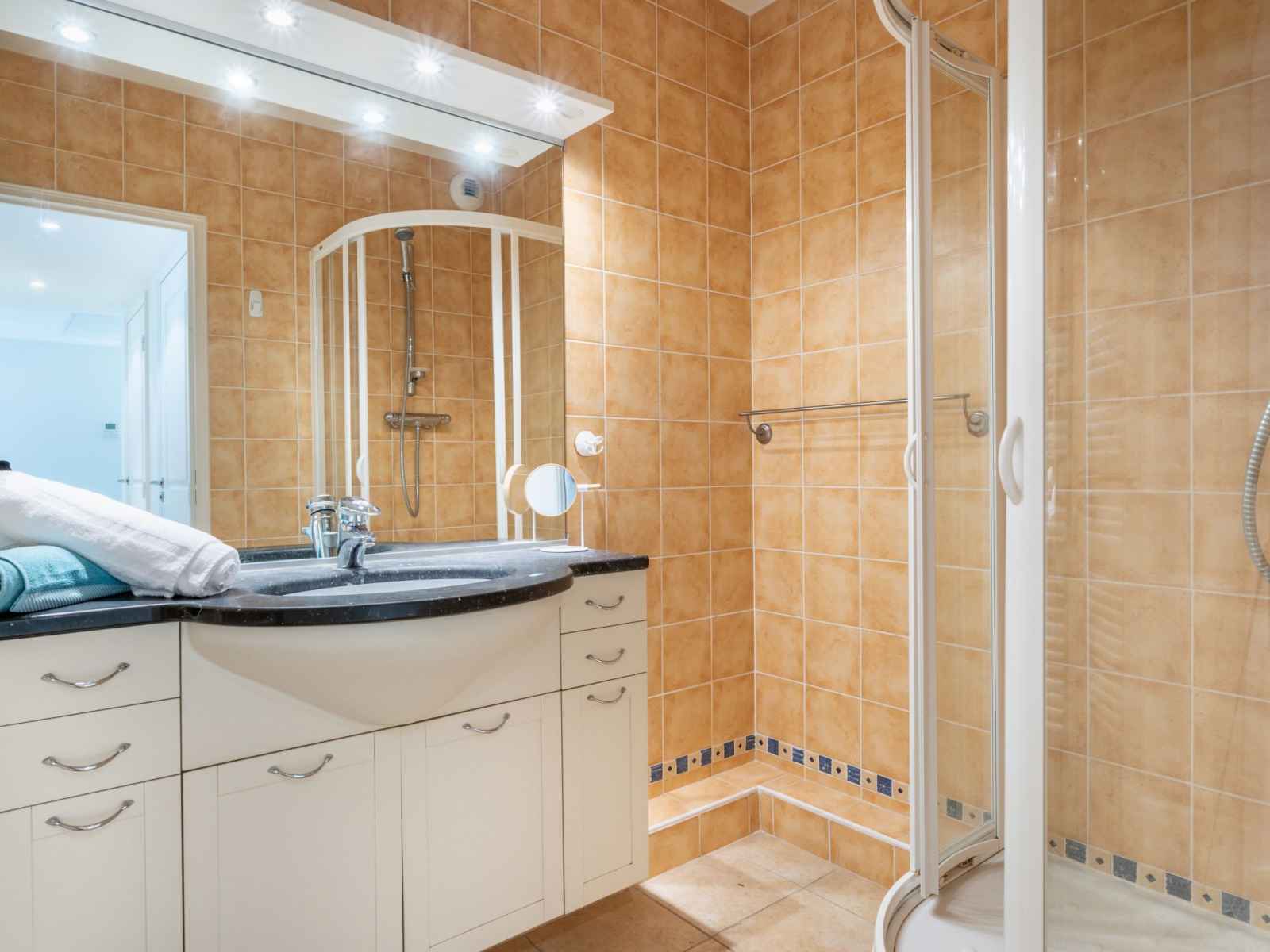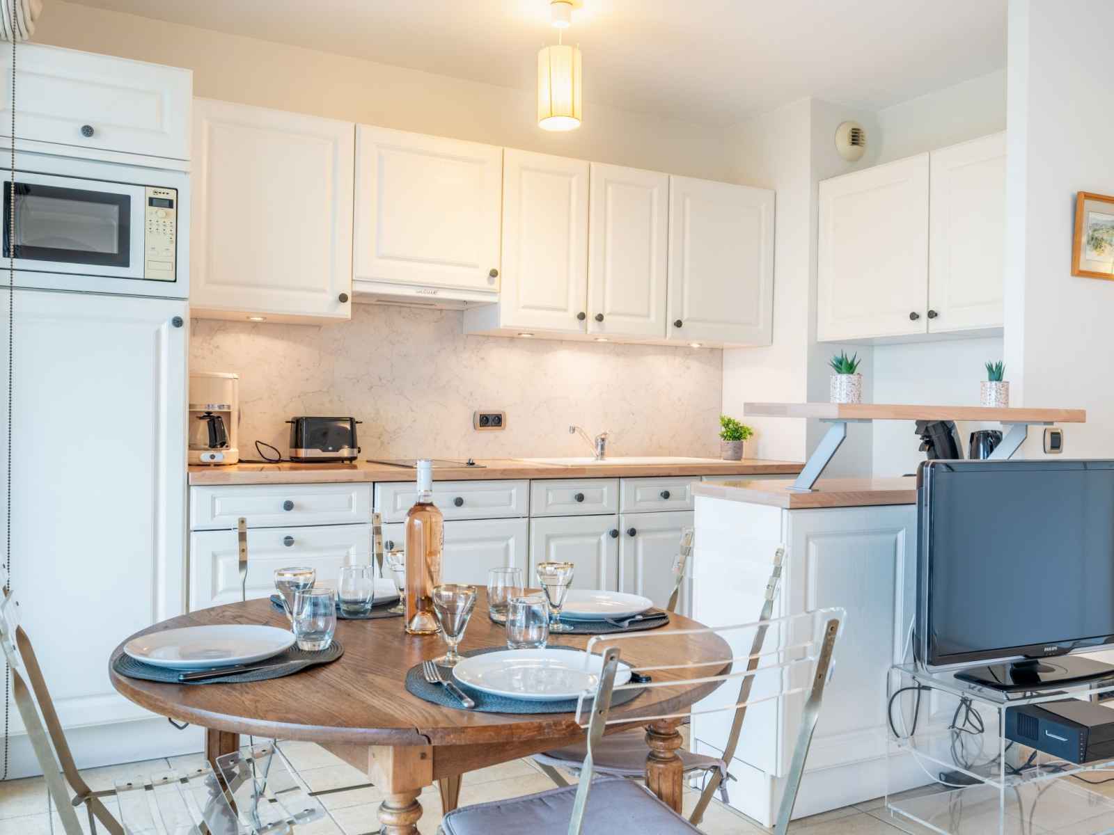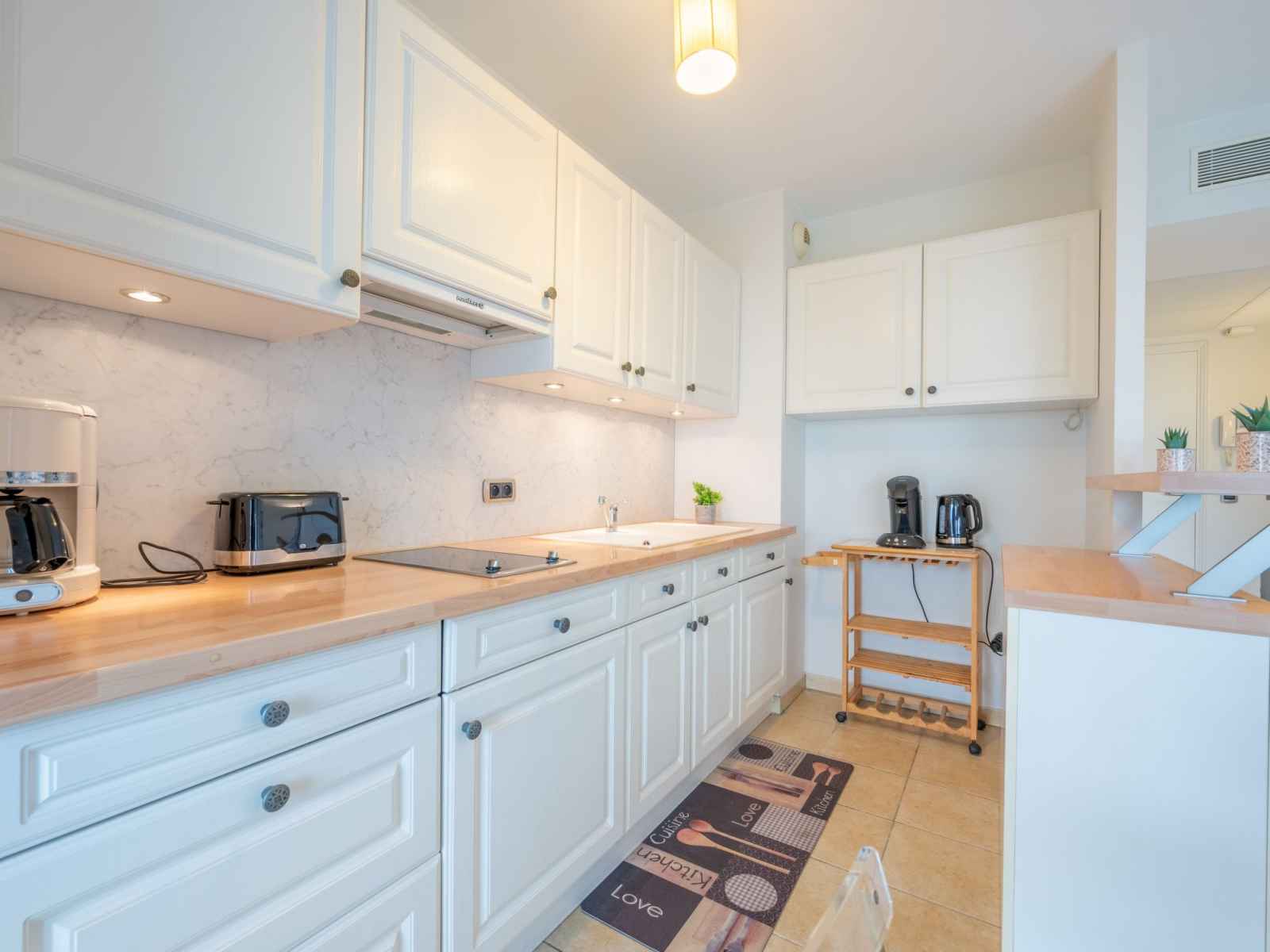 plaques vitrocéramiques, grille-pain, micro-ondes, cafetière électrique, Capsules pour machine à café (Senseo) (NON INCLUSES)). Sortie sur la terrasse. Douche, WC séparé. Chauffage à air chaud. Grande terrasse 20 m2, couverte, situation ouest. Meubles de terrasse. Vue sur le jardin. A disposition: lave-linge. Internet (Connexion WIFI, gratuit). Garage No 50. Veuillez noter: détecteur de fumée. Annonce d'un particulier (art 155, IV du CGI). 06029022197WF