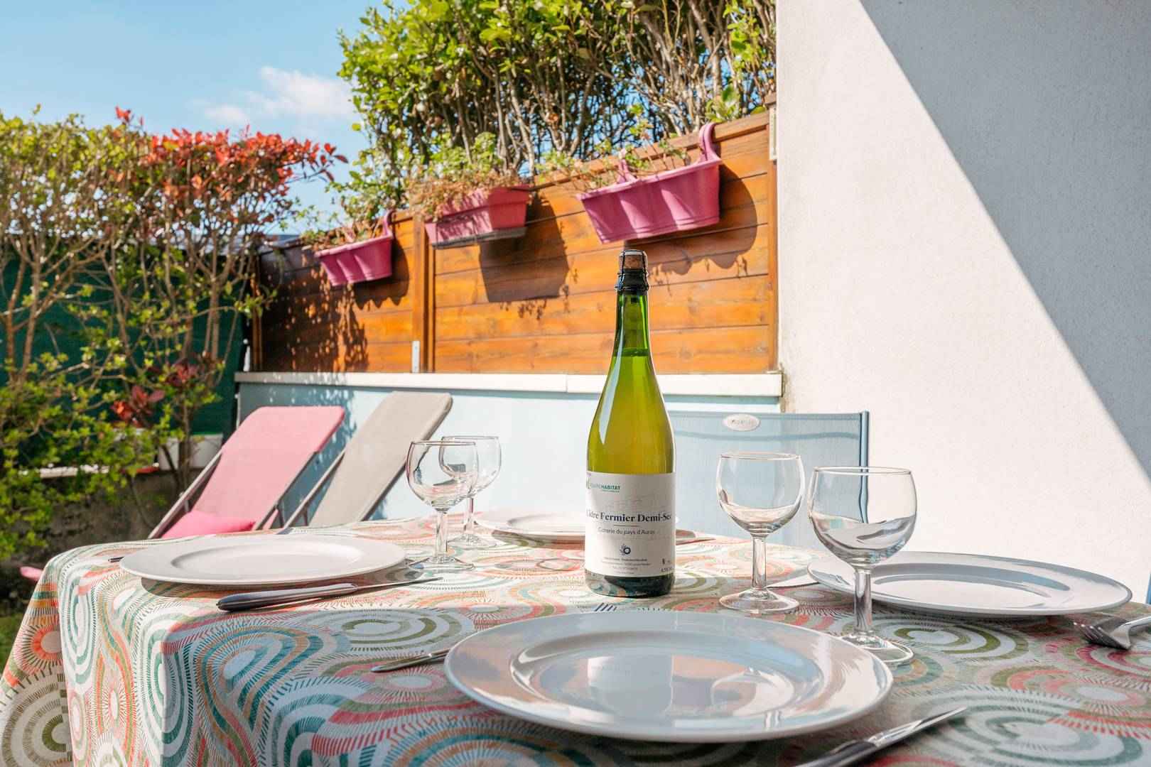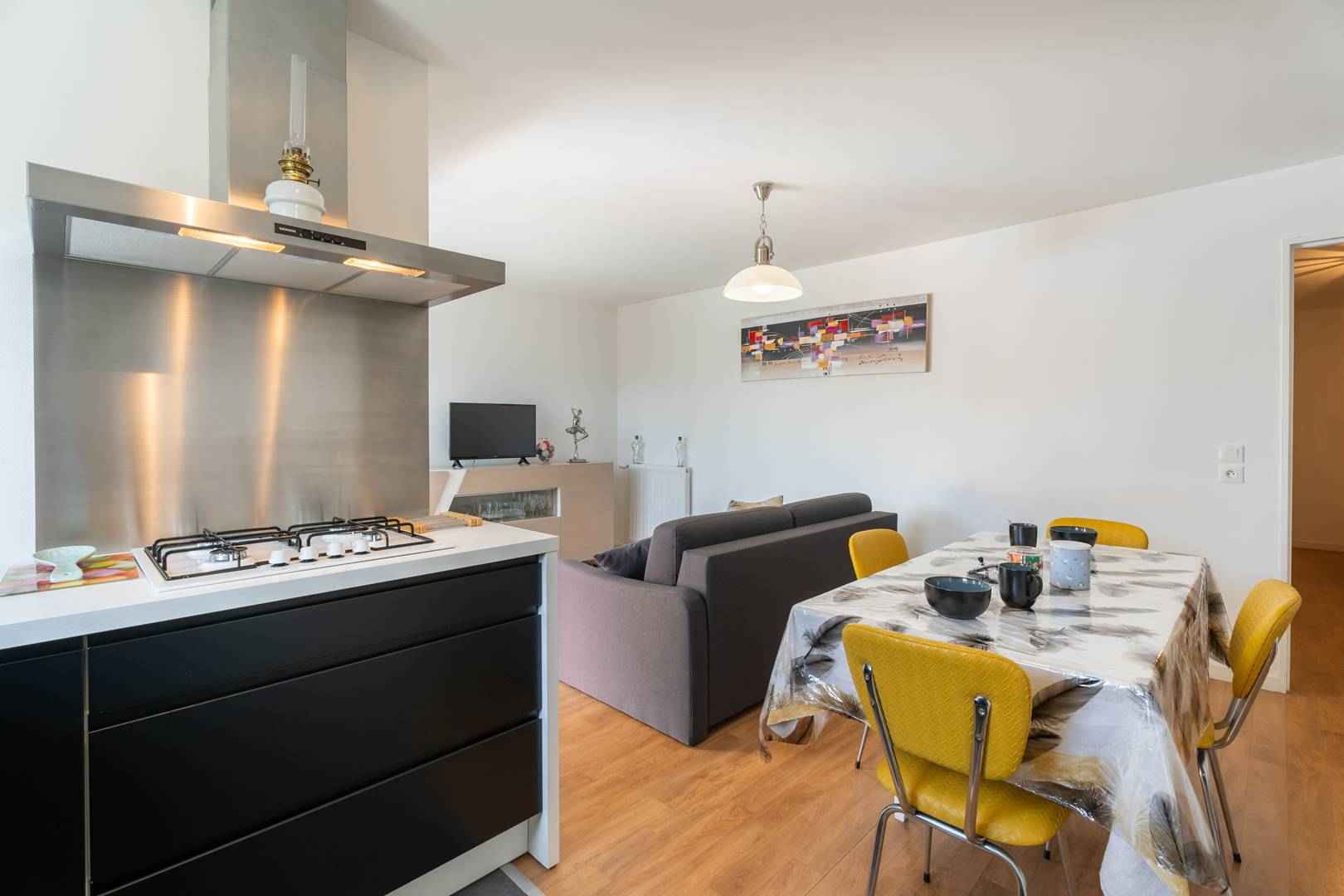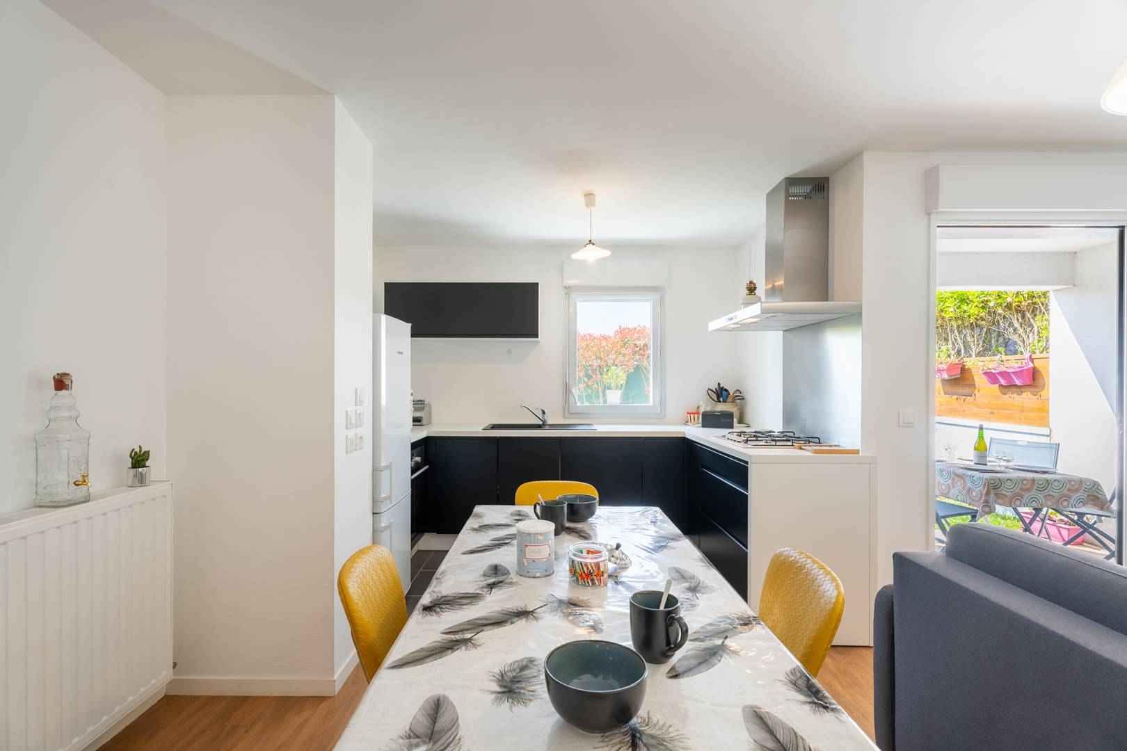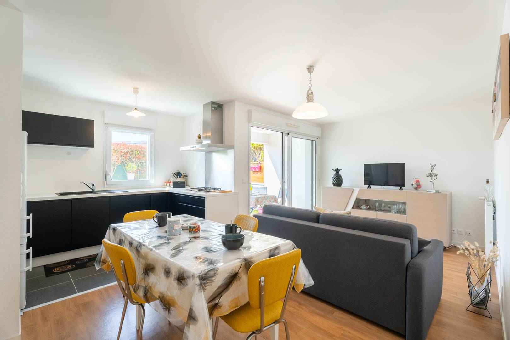 - Séjour avec partie repas (table et chaises) et partie salon (TV, canapé) donnant sur la terrasse exposée Ouest (salon de jardin)