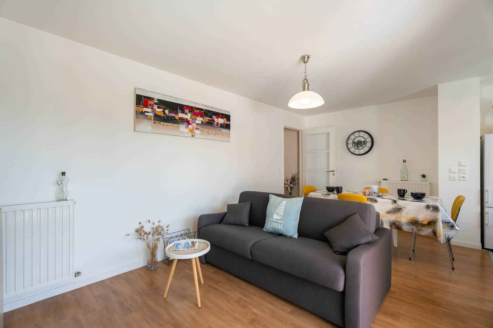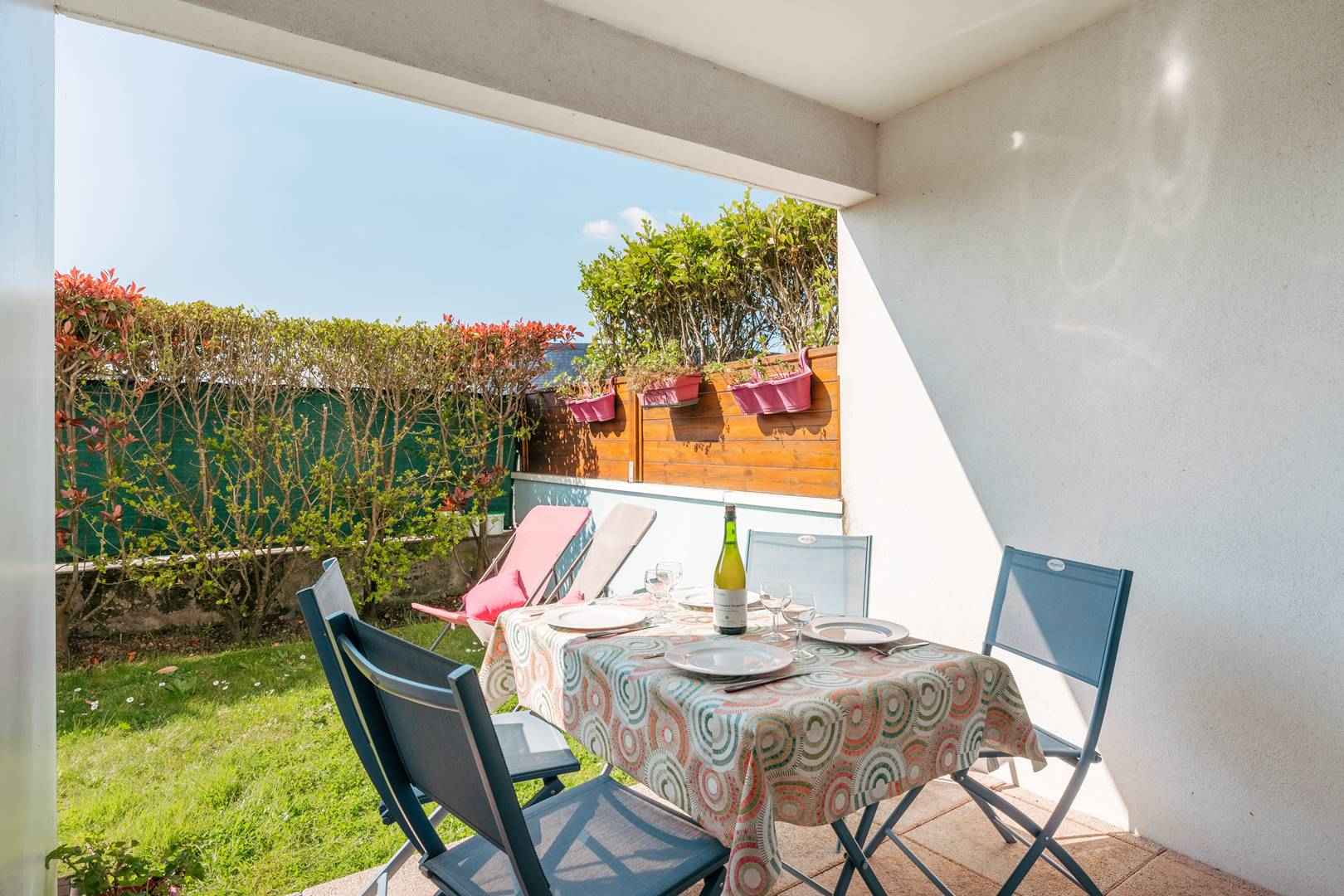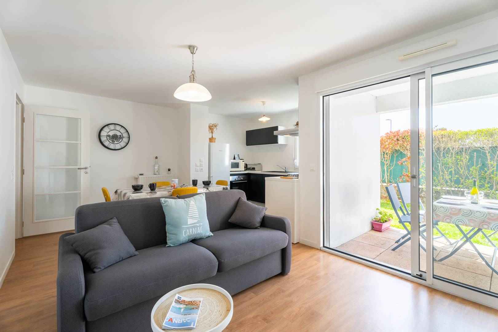 Dans le bourg de carnac, à 800 m de la place du marché et à environ 2 km de carnac plage et la grande plage, bel appartement 2 pièces (env. 50m²) pour 2 personnes, situé dans la résidence de standing le clos de telenn (bâtiment 40d, rdc, porte 102) :