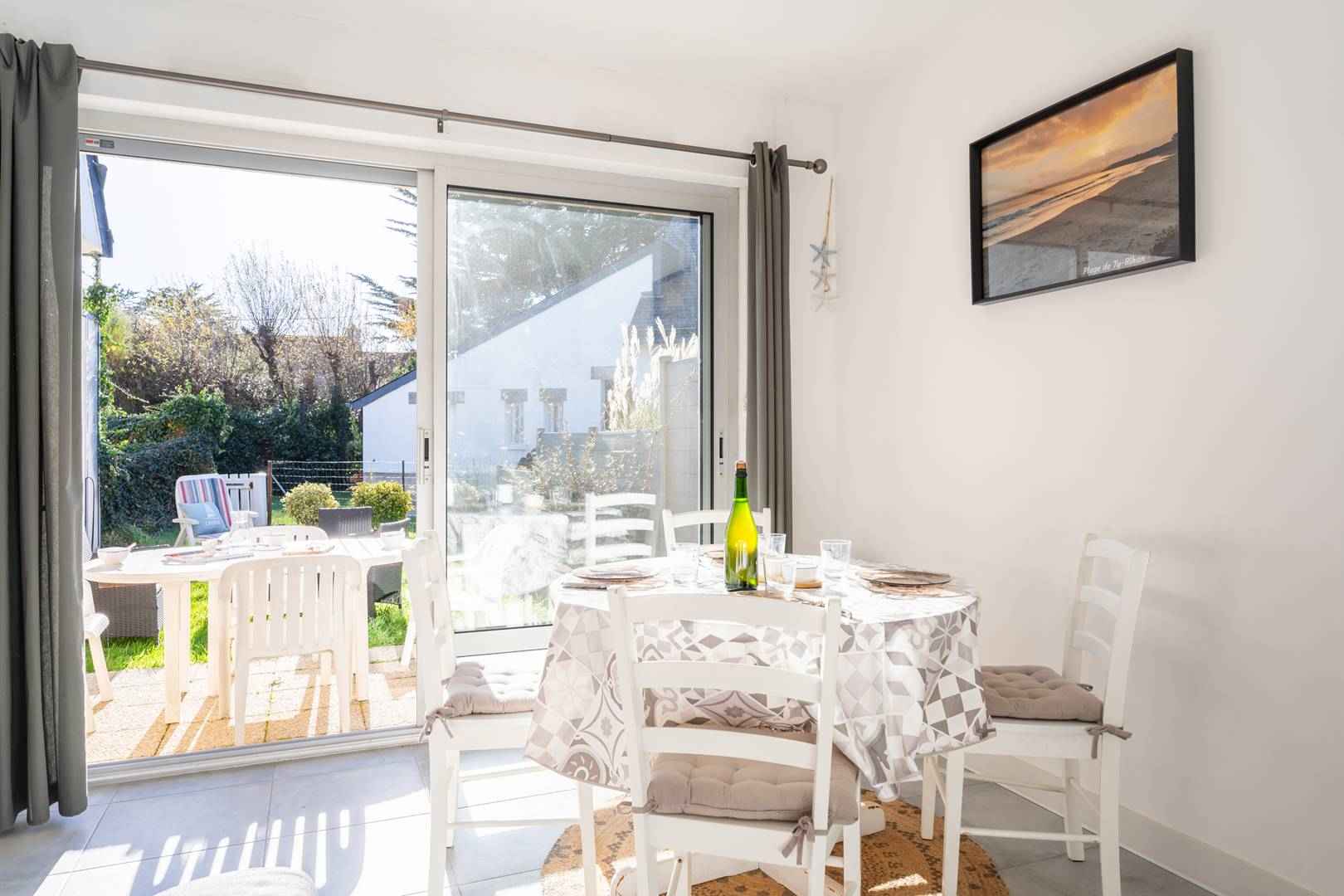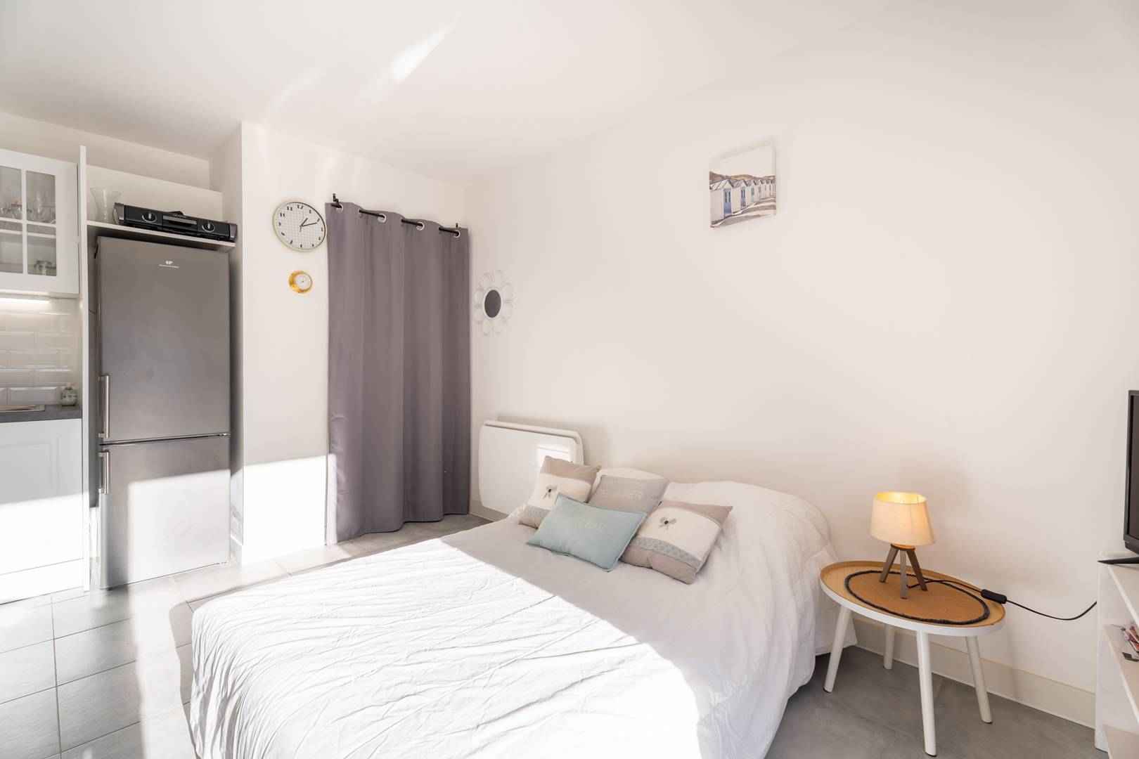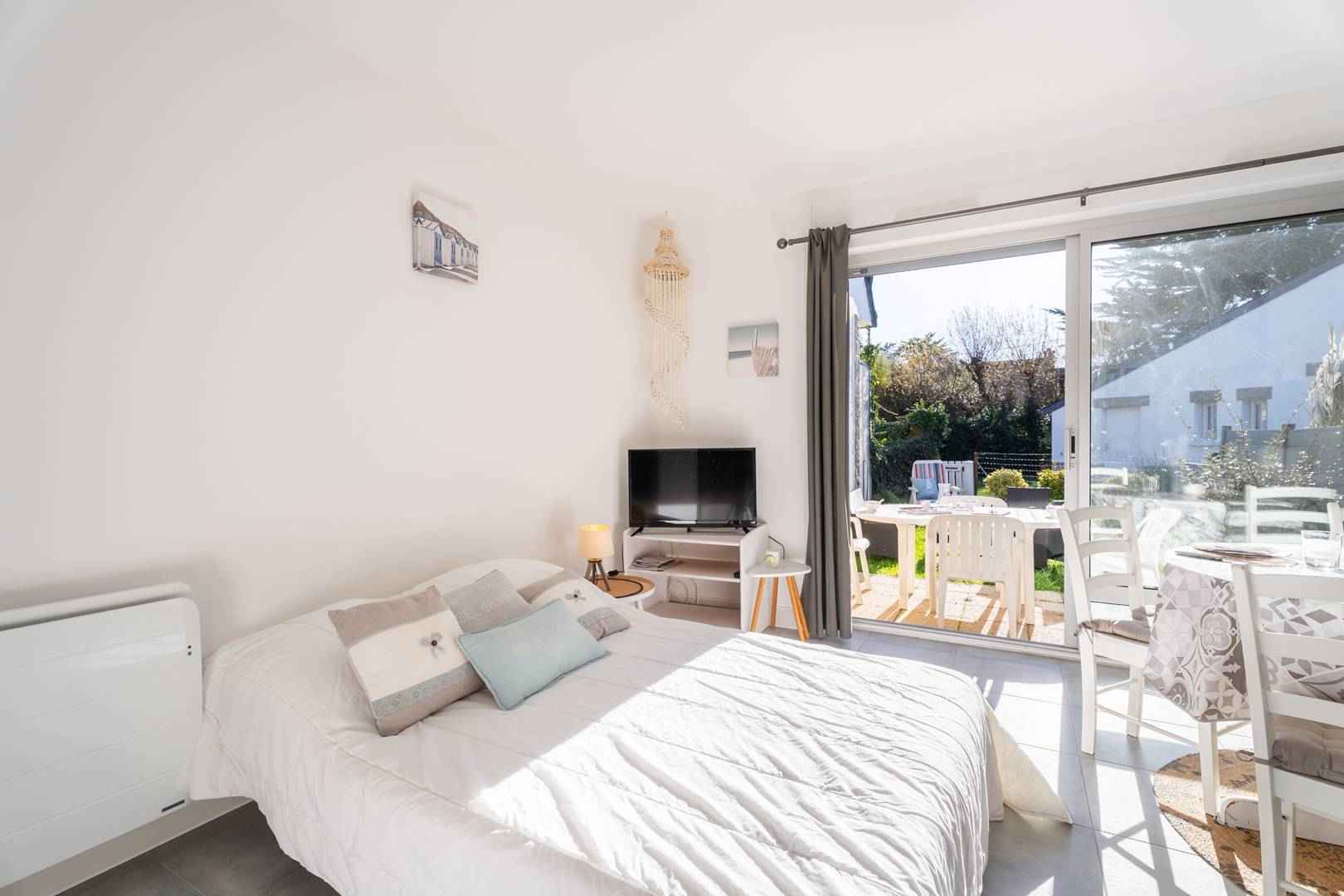 - séjour avec partie repas (table et chaises) et partie salon (tv, canapé convertible : couchage 2 personnes, 140, couette) donnant sur la terrasse