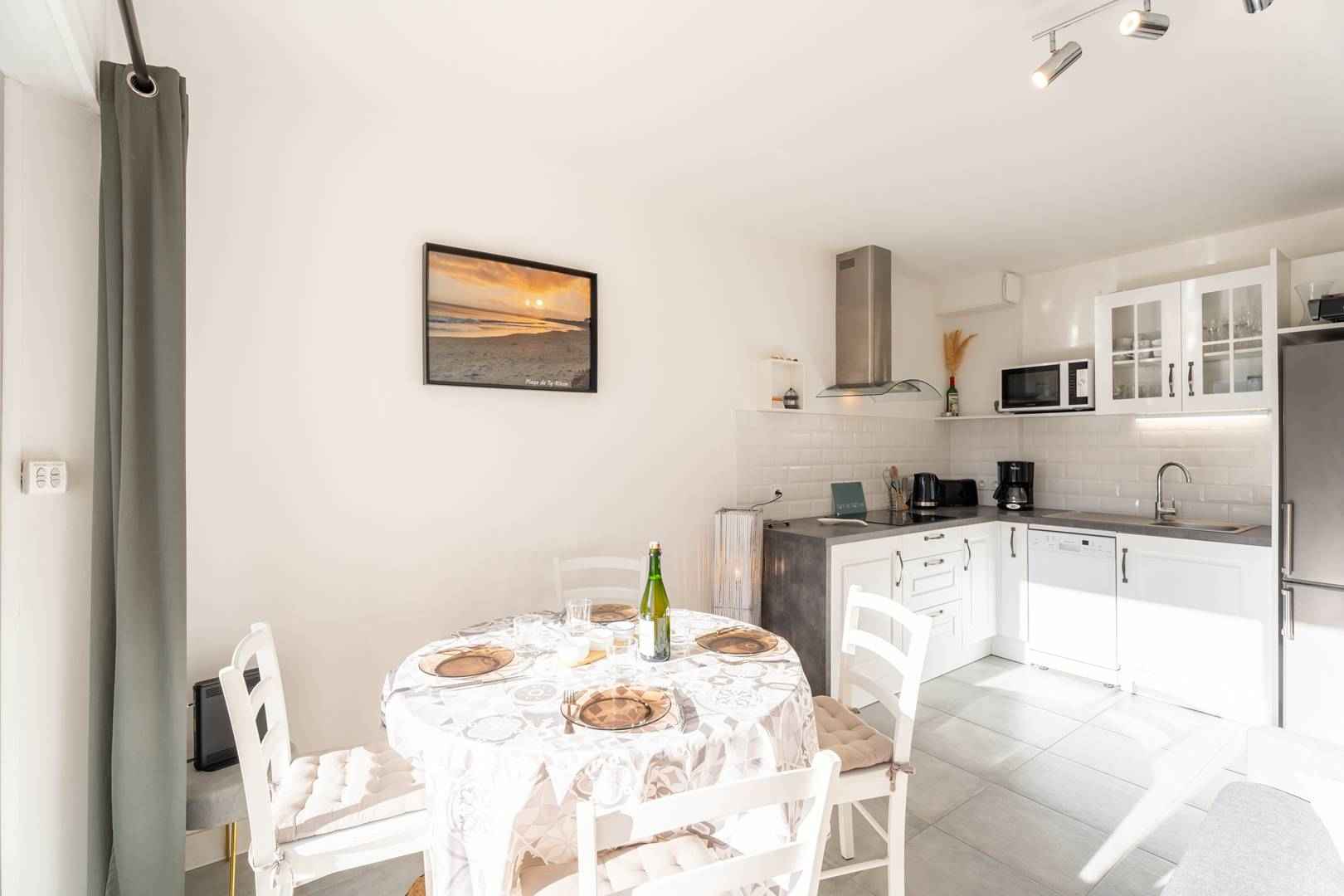 - Coin-cuisine équipé (réfrigérateur/congélateur, lave-vaisselle, plaque à induction 4 feux, micro-ondes)