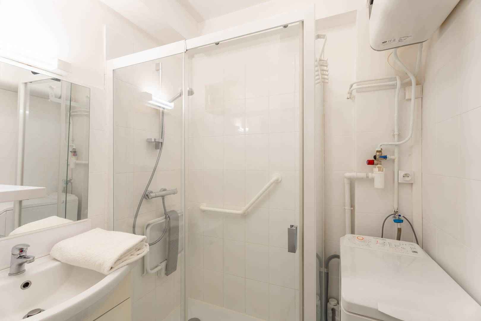 - Salle d'eau avec grande douche plate (siège de douche) et lave-linge