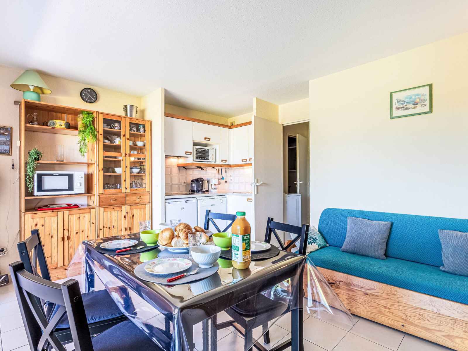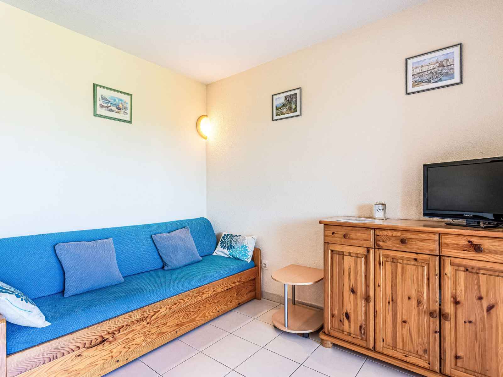 "les marines de gassin 16", apt 2 pièces 32 m2 au 1er étage. aménagement plaisant: séjour/salle à manger avec 2 lits gigognes (2 x 80 cm, longueur 190 cm), tv (écran plat). sortie sur la terrasse. 1 petite chambre avec 1 grand-lit (140 cm, longueur 190 cm). coin cuisine (mini-four, lave-vaisselle, 3 plaques vitrocéramiques, grille-pain,