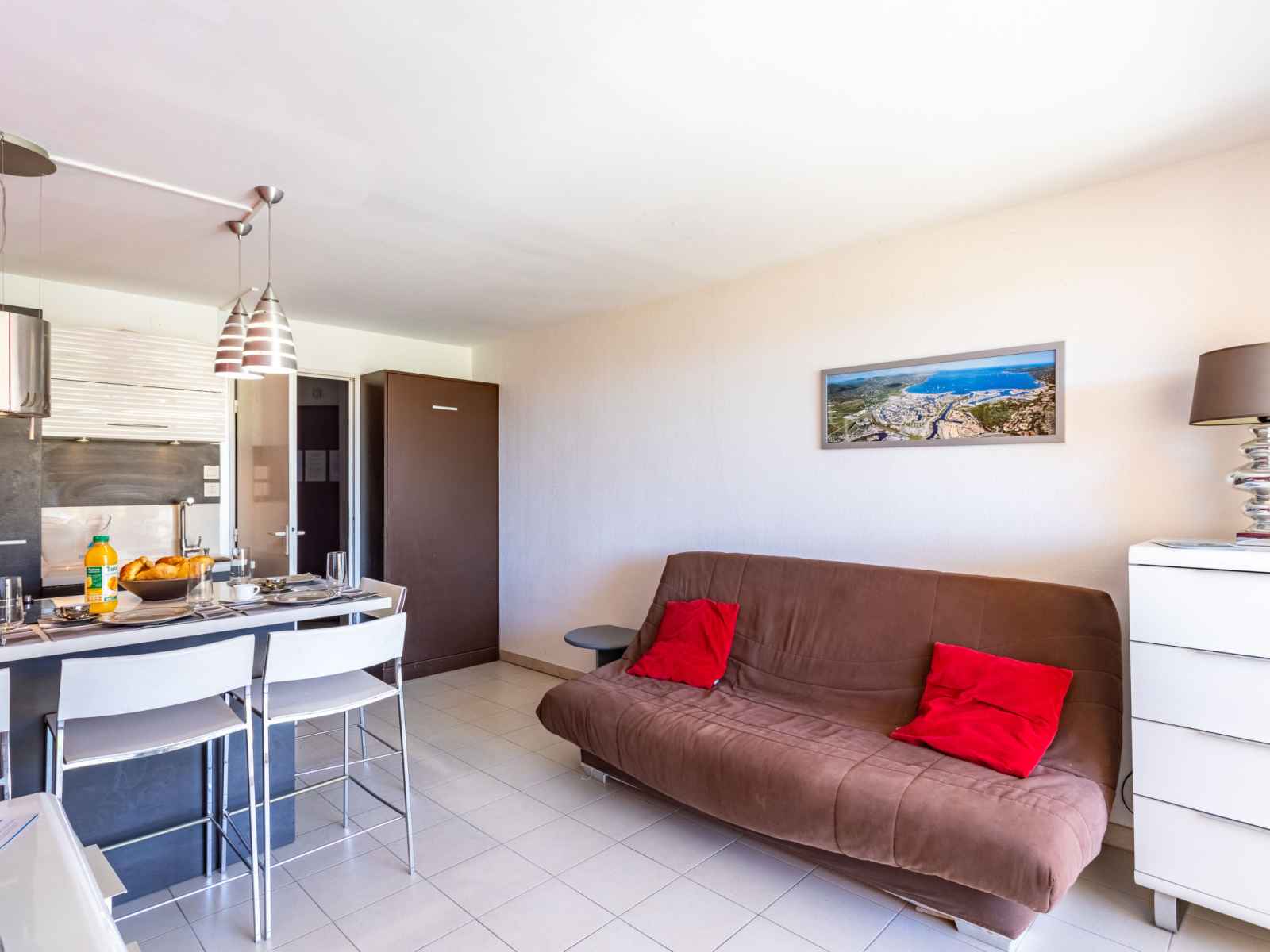 "les marines de gassin 1", apt 2 pièces 32 m2 au 2ème étage. logement idéal pour 2 adultes + 2 enfants. rénové en 2016, aménagement confortable et agréable: séjour/salle à manger avec 1 divan-lit double (120 cm, longueur 190 cm), tv (écran plat), air-conditionné. sortie sur la terrasse. 1 chambre avec 1 grand-lit (140 cm, longueur 190