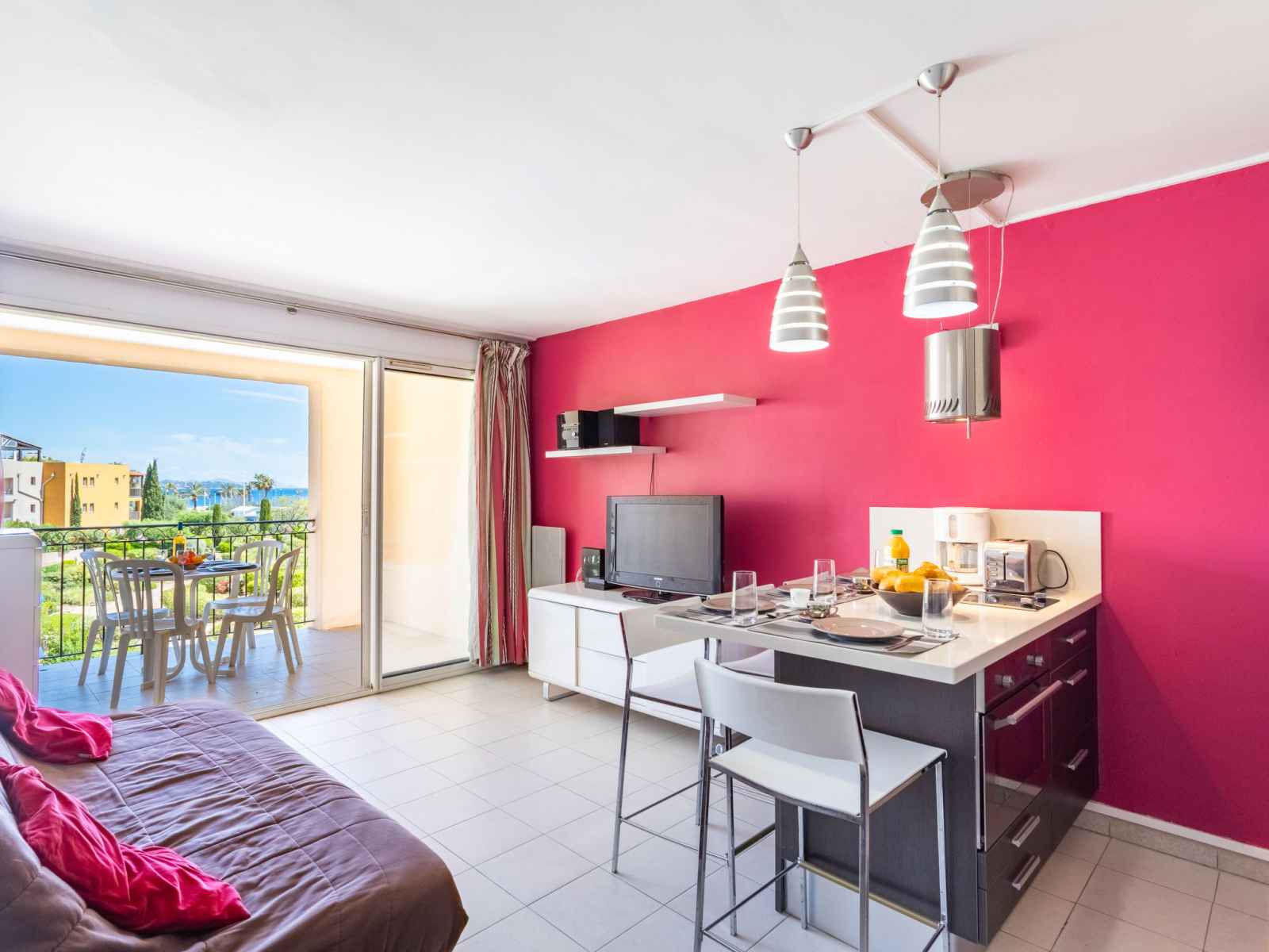 cm). Coin cuisine (2 plaques de cuisson, four, lave-vaisselle, cafetière électrique, ilot de cuisine). Salle de bains, WC séparé. Chauffage électrique. Terrasse 9 m2. Meubles de terrasse. Vue sur la mer. A disposition: Internet (Connexion WIFI, gratuit). Veuillez noter: maximum 1 animal/ chien de petite taille autorisé. Détecteur de fumée. 83065000069LG