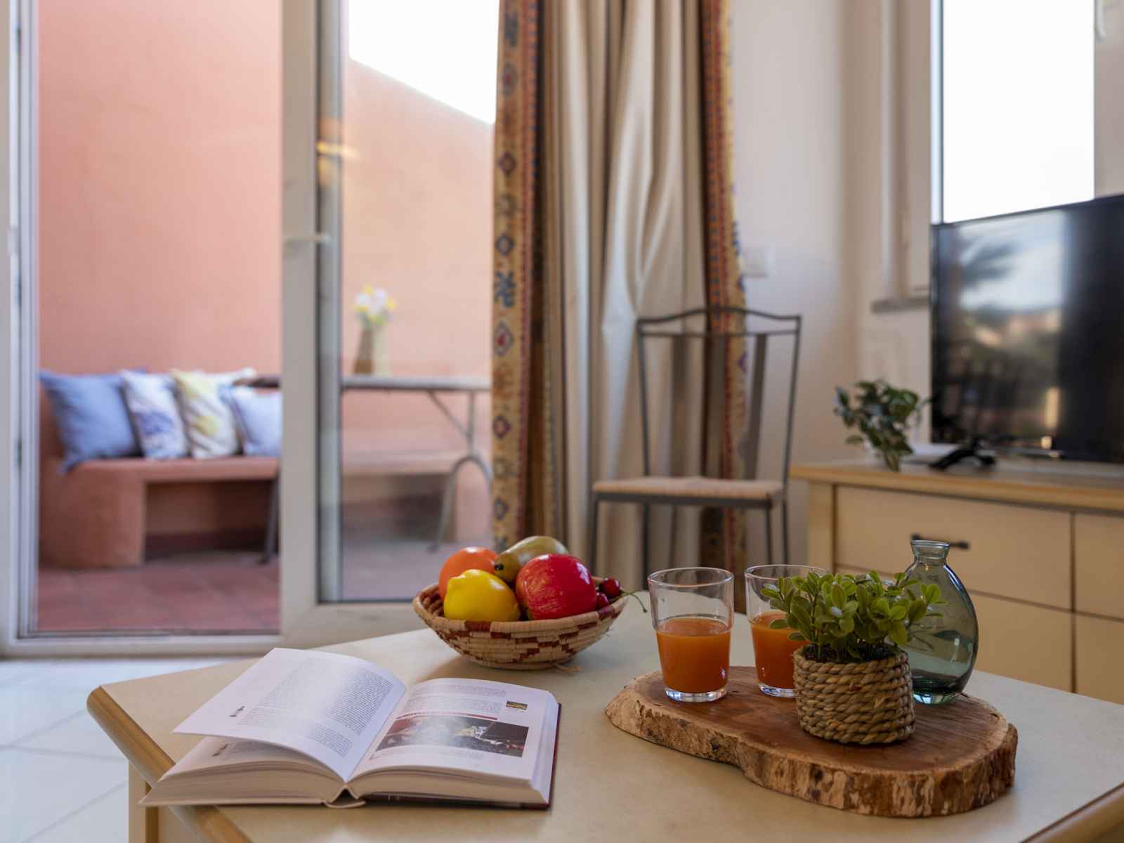 "cala rossa 1505", apt 2 pièces 45 m2, à l'étage supérieur. aménagement confortable: séjour/salle à manger avec 2 divans-lits et tv (satellite) (écran plat), air-conditionné. sortie sur la terrasse. 1 chambre double. coin cuisine (lave-vaisselle, grille-pain, micro-ondes). douche/bidet/wc. air-conditionné, chauffage à air chaud.