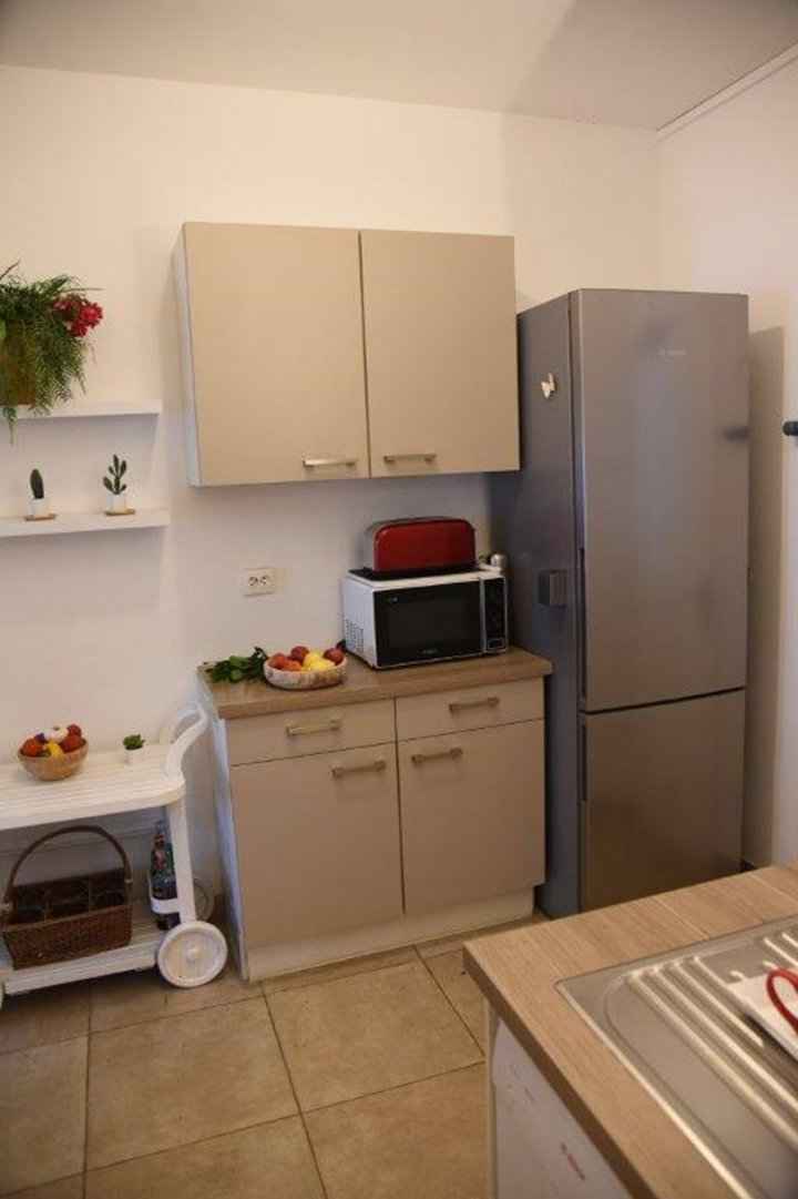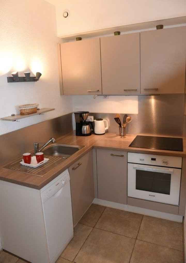 une cuisine équipée avec réfrigérateur- congélateur, plaques à induction, lave-vaisselle, micro-ondes,
