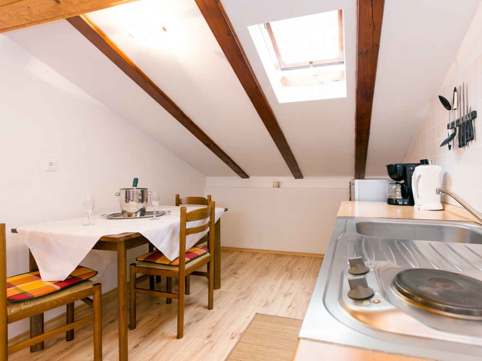 "teodora", apt 2 pièces 40 m2, sous le toit. séjour/salle à manger mansardé hauteur plafond 80 - 220 cm avec fenêtre sous le toit avec 1 divan-lit, tv (satellite) et air-conditionné. sortie sur la terrasse. 1 chambre mansardée hauteur plafond 80 - 220 cm avec 1 lit et 1 lit double. cuisine ouverte (2 plaques de cuisson, grille-pain,