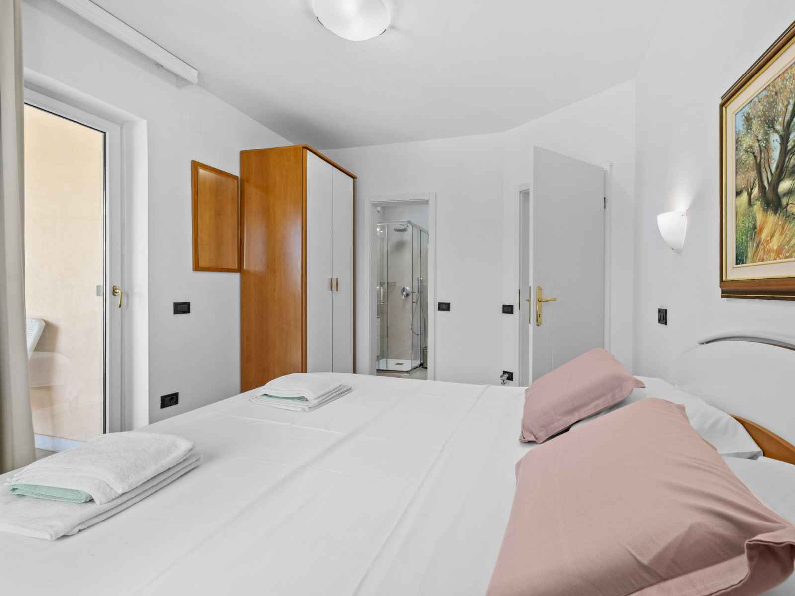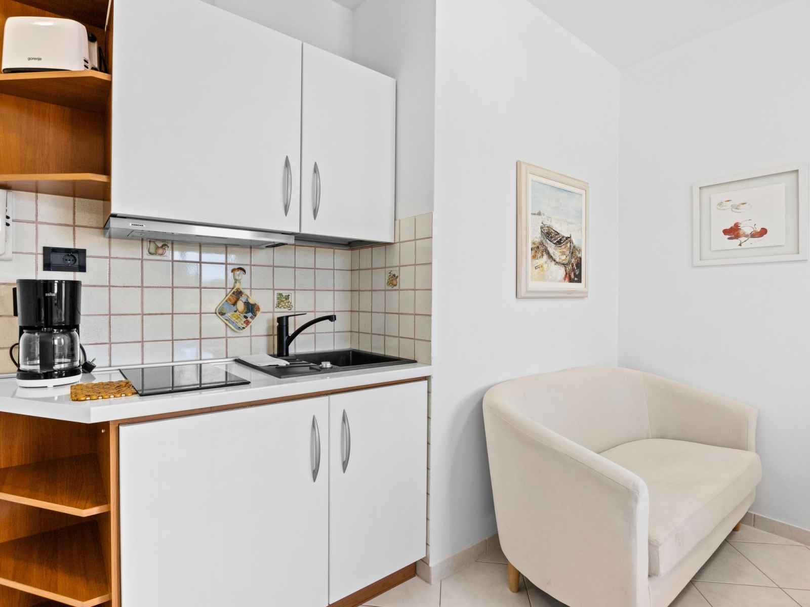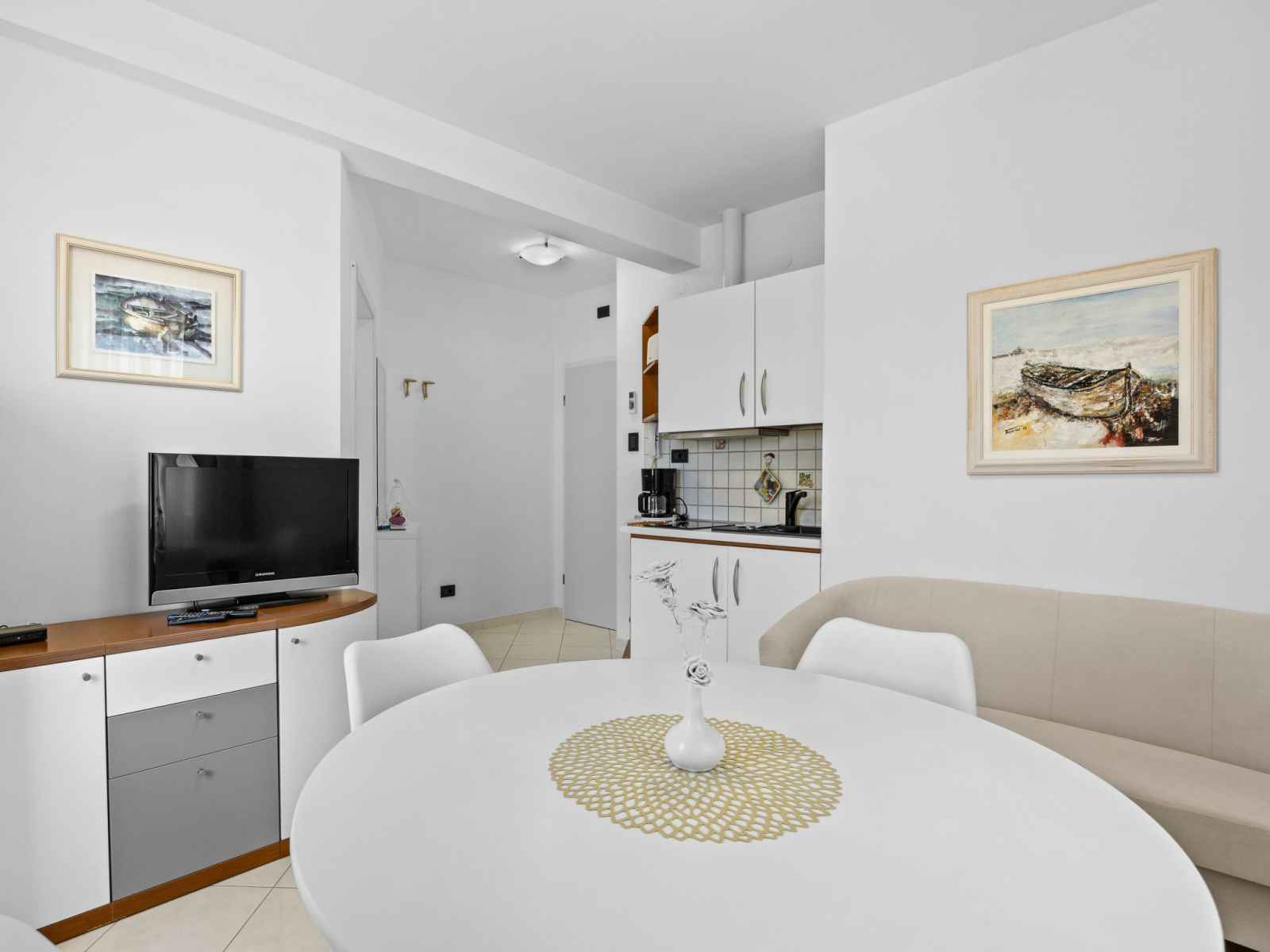 "white", apt 2 pièces 30 m2 au 1er étage. aménagement agréable et plaisant: séjour/salle à manger avec tv (satellite) (écran plat), air-conditionné. sortie sur le balcon. 1 chambre avec 1 grand-lit (160 cm, longueur 200 cm). cuisine ouverte (2 plaques vitrocéramiques, grille-pain, bouilloire électrique, congélateur, cafetière