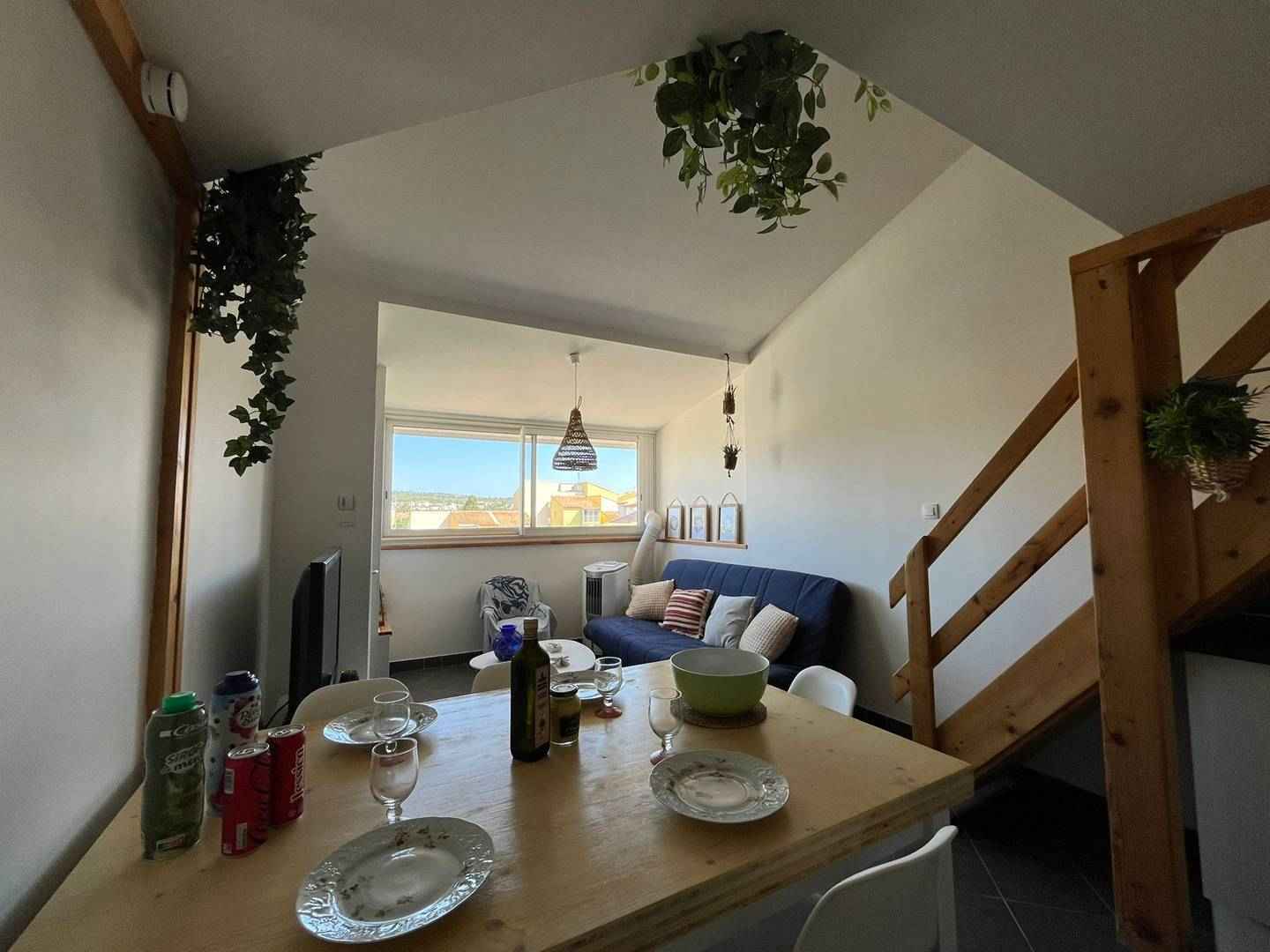 Espace Vie : Un séjour lumineux avec canapé, TV et un coin repas convivial.