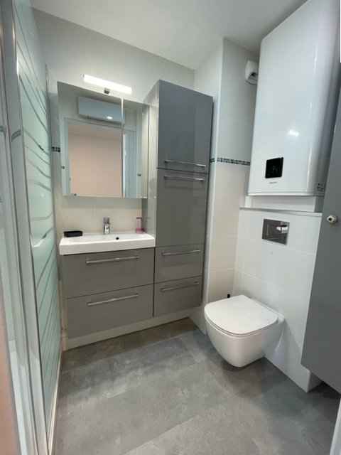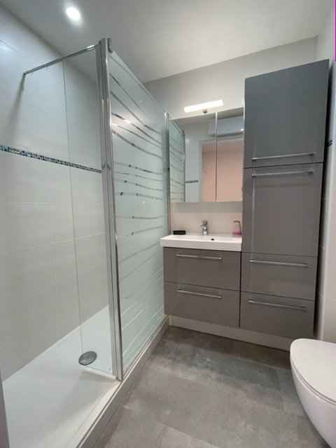 Confort Moderne : Une salle d'eau élégante avec douche à l'italienne, pour un moment de détente absolue après la plage.