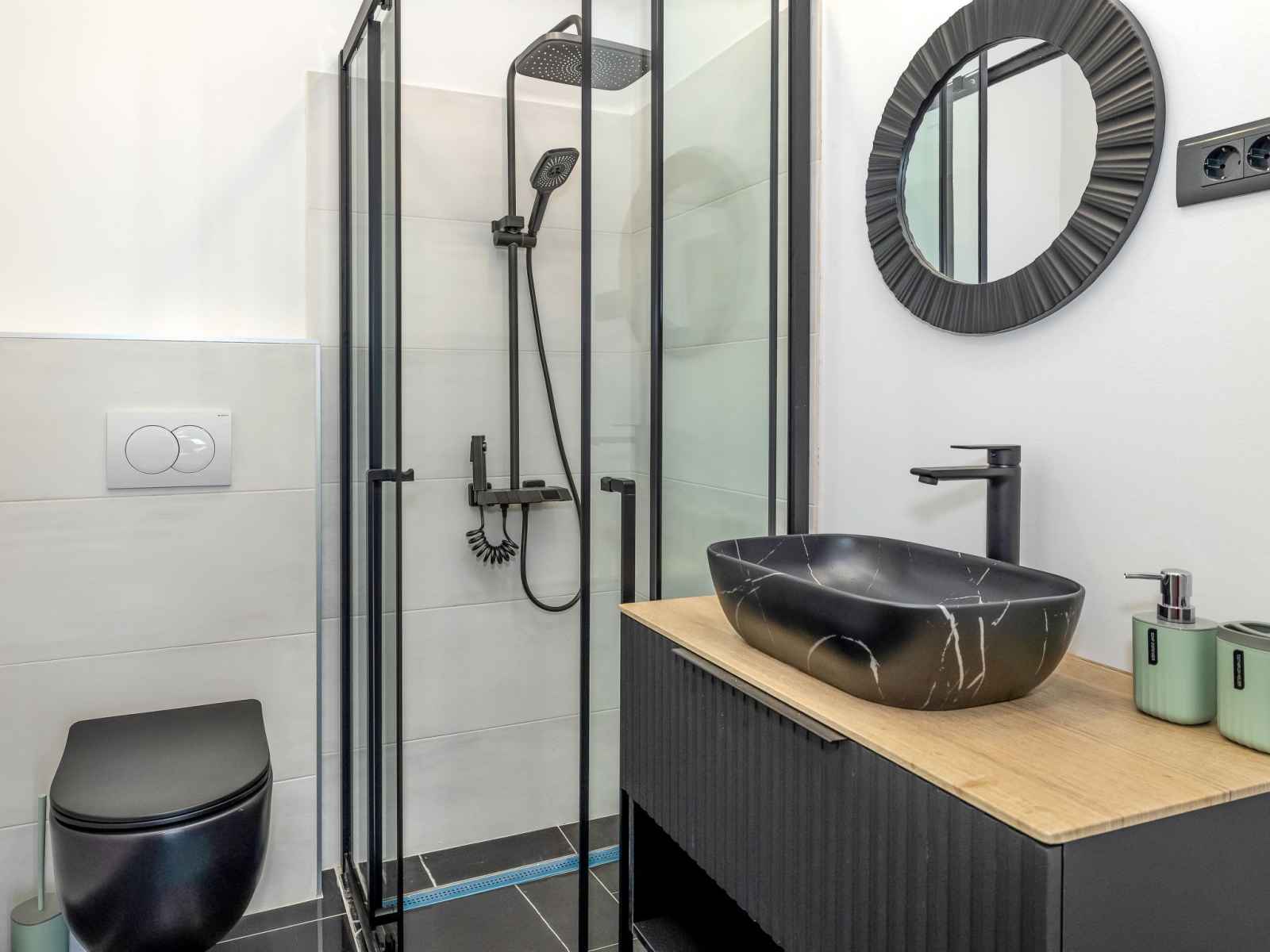 supermarché 1 km, café 1 km, zone piétonne 1 km, arrêt de bus 1.5 km, plage de graviers 1.2 km, plage de rochers 1.2 km. marina 1 km.