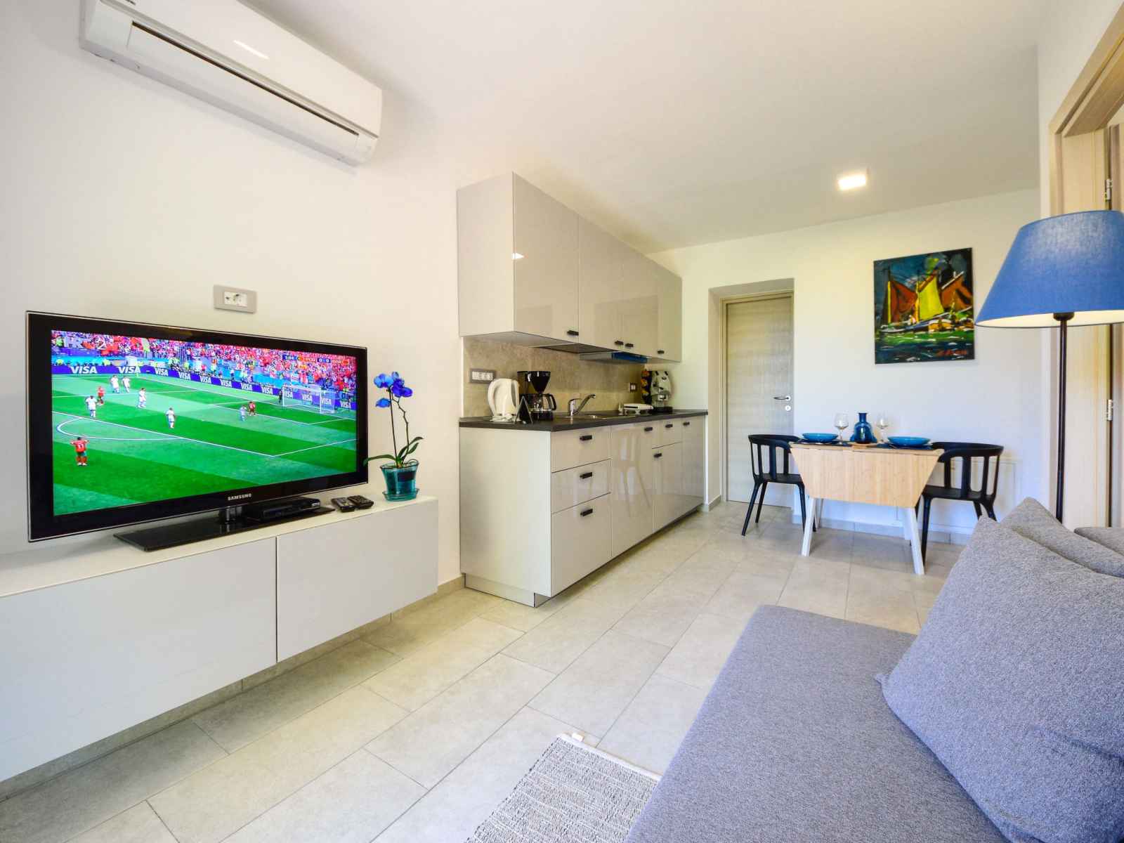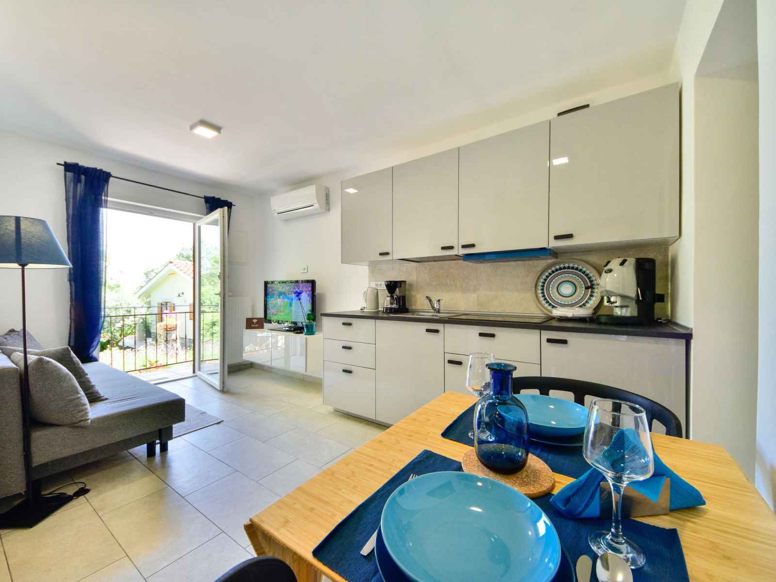 Apt 2 pièces 25 m2, rez-de-chaussée surélevé, situation sud-est. complètement rénové en 2018, aménagement agréable et moderne: séjour/salle à manger 12 m2 avec tv (satellite) (écran plat), air-conditionné. sortie sur la terrasse. 1 chambre avec 1 grand-lit (160 cm, longueur 200 cm). cuisine ouverte (4 plaques vitrocéramiques,