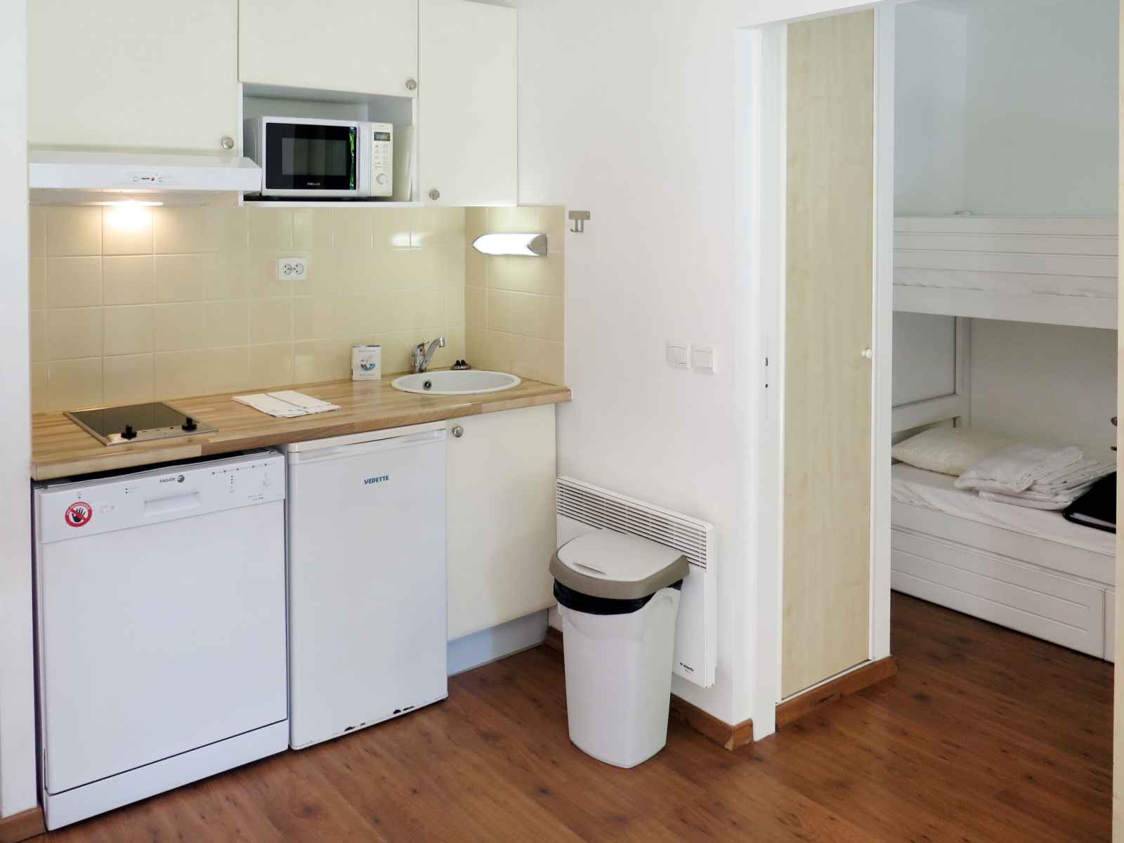 "les cottages du lac t1 tradition", apt 2 pièces 30 m2. clair, aménagement plaisant: séjour/chambre à coucher avec 1 divan-lit double (140 cm, longueur 190 cm), table pour les repas et tv (satellite) (écran plat). sortie sur le balcon, sur la terrasse. 1 chambre avec 1 x 2 lits superposés (80 cm, longueur 180 cm). cuisine ouverte