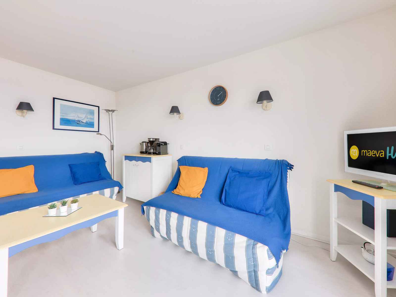Équipements séjour : 2 lits-banquettes avec lit-gigogne (3 couchages). coté repas : 1 table avec 4 chaises.