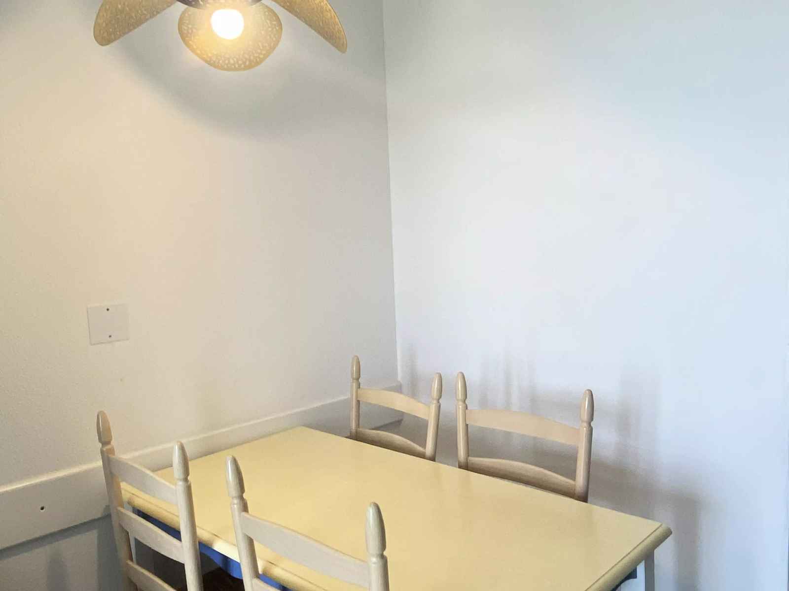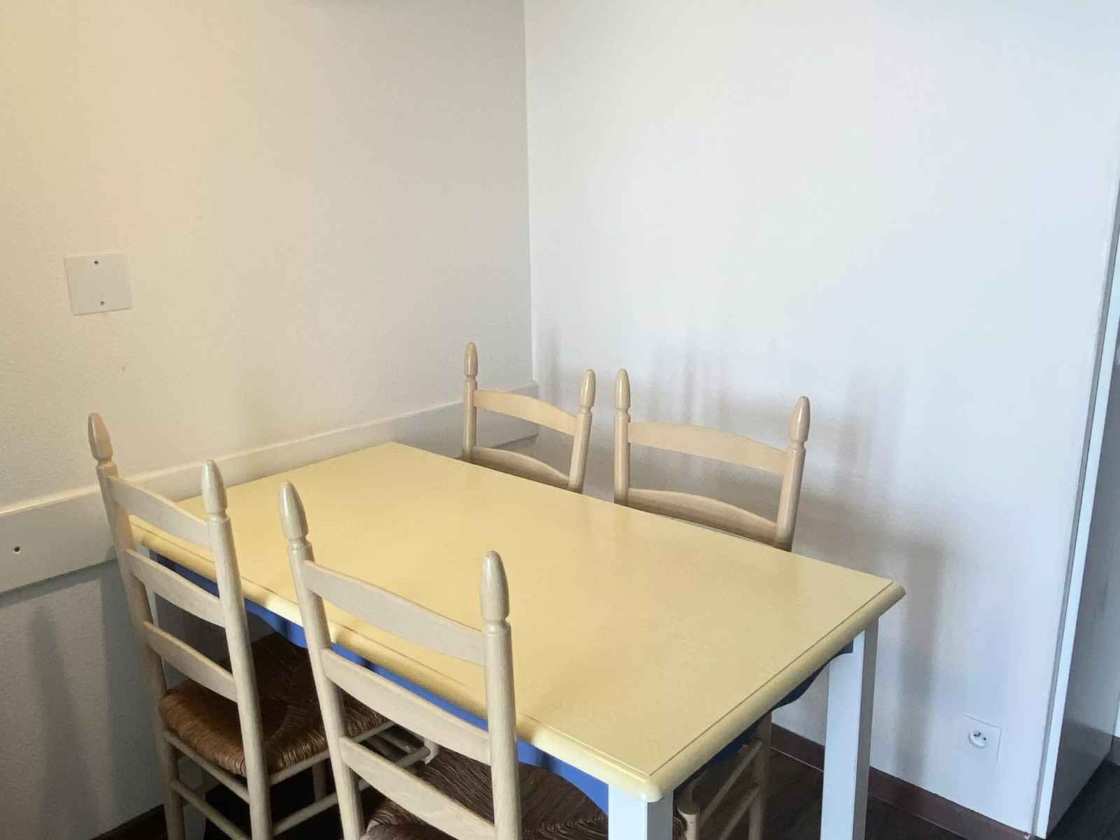 côté repas : 1 table avec 4 chaises + 1 tabouret.