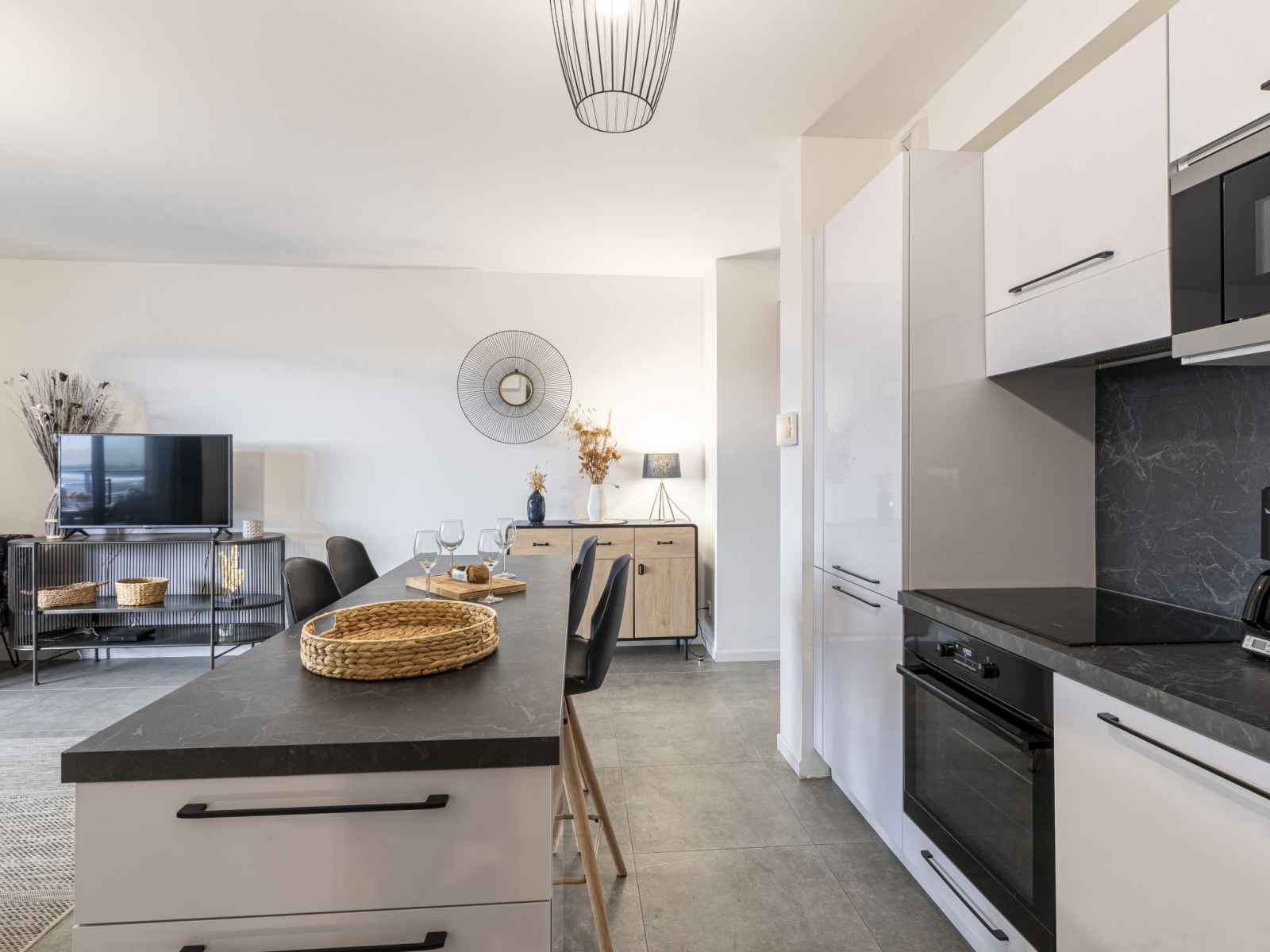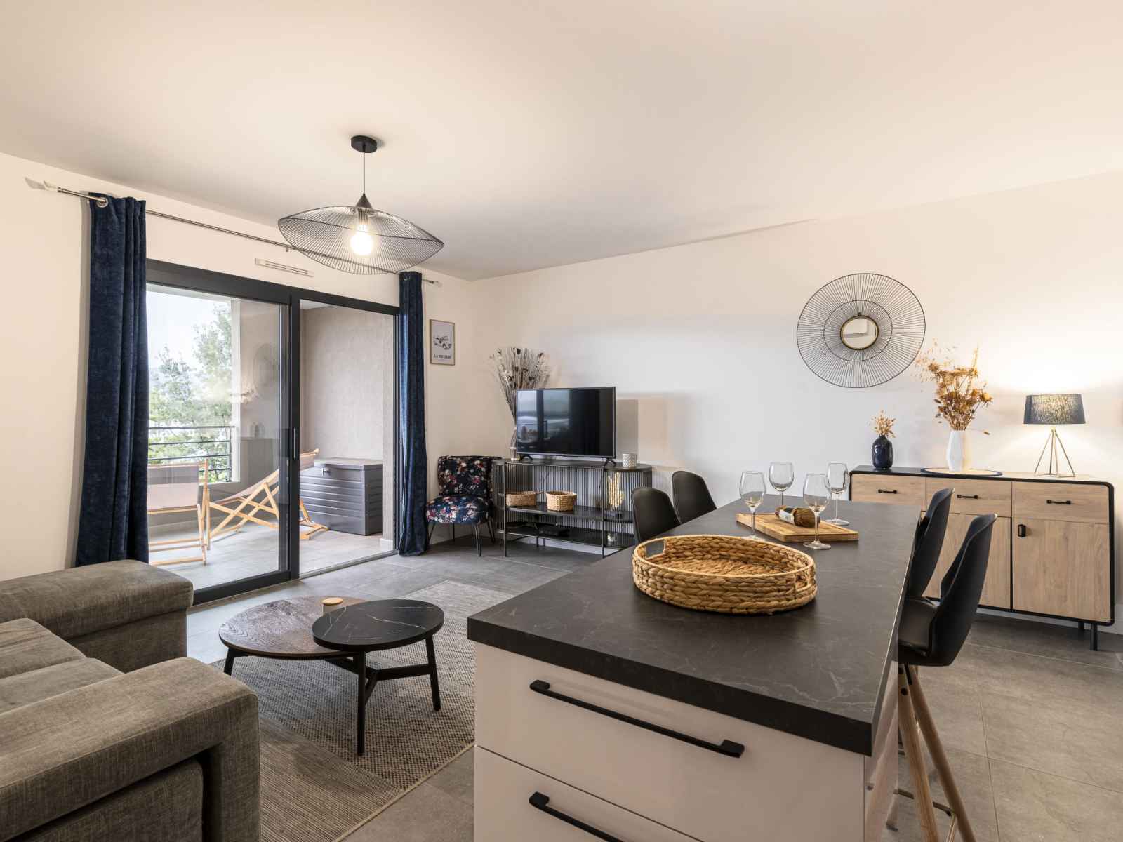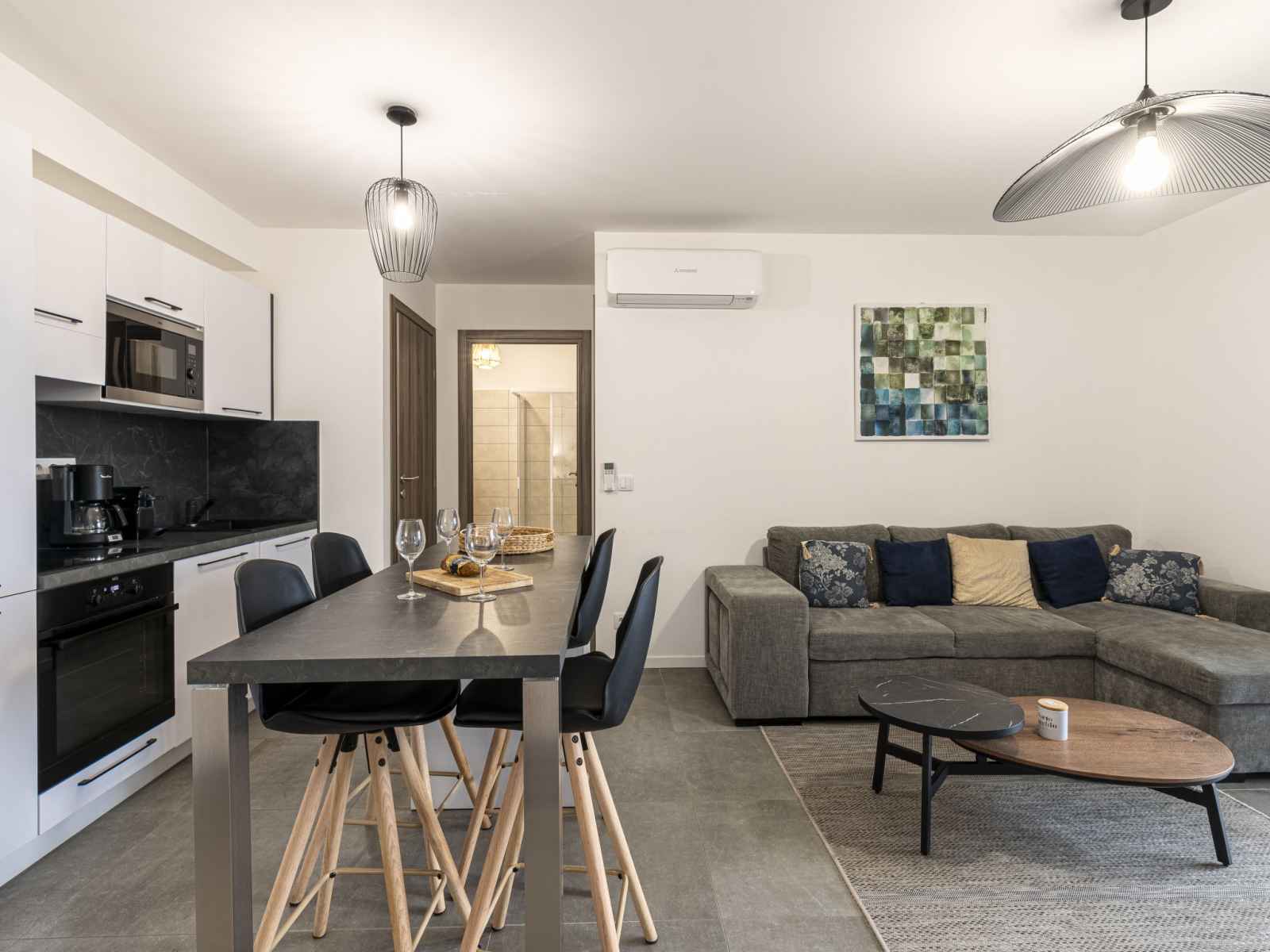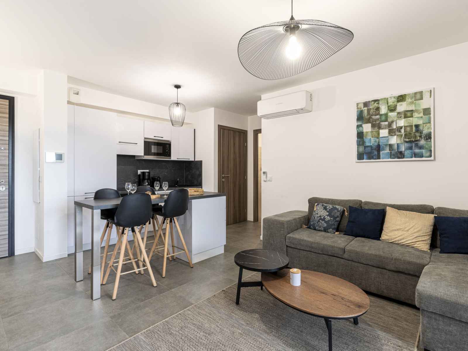 Apt 2 pièces 45 m2 au 2ème étage. aménagement moderne: séjour/salle à manger avec baie vitrée avec 1 divan-lit double (140 cm, longueur 190 cm), tv (écran plat). sortie sur le balcon, sur la terrasse. 1 chambre avec 1 grand-lit (160 cm, longueur 200 cm). sortie sur le balcon, sur la terrasse. cuisine ouverte (four, lave-vaisselle, 1
