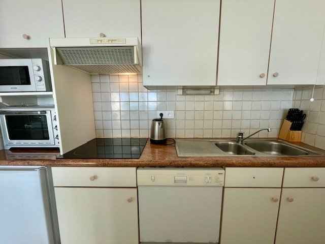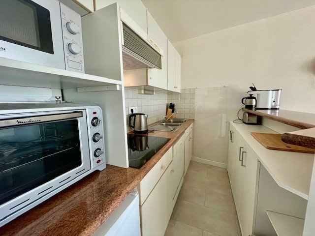 - D’une cuisine ouverte et équipée (mini-four, micro-ondes, plaque électrique, lave-vaisselle, réfrigérateur avec petit congélateur, bouilloire, grille-pain et cafetière Senseo à dosette + classique),