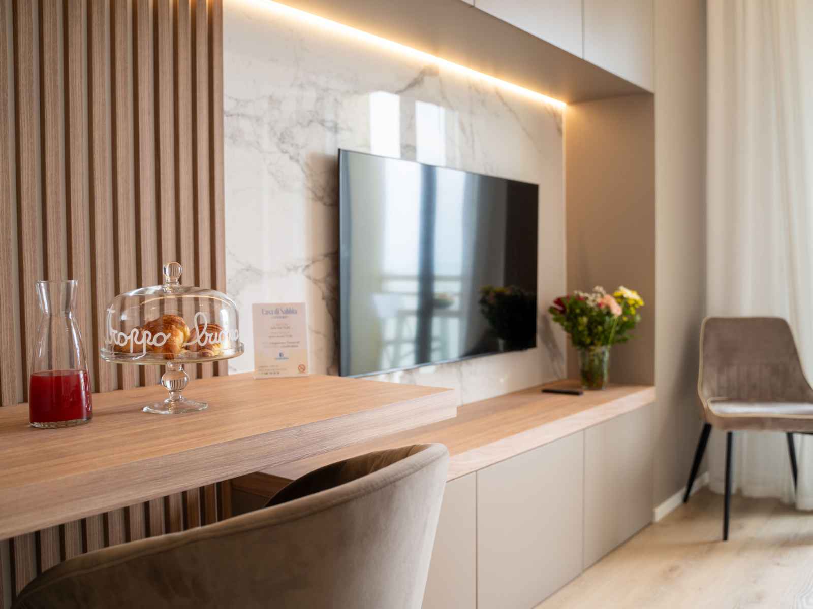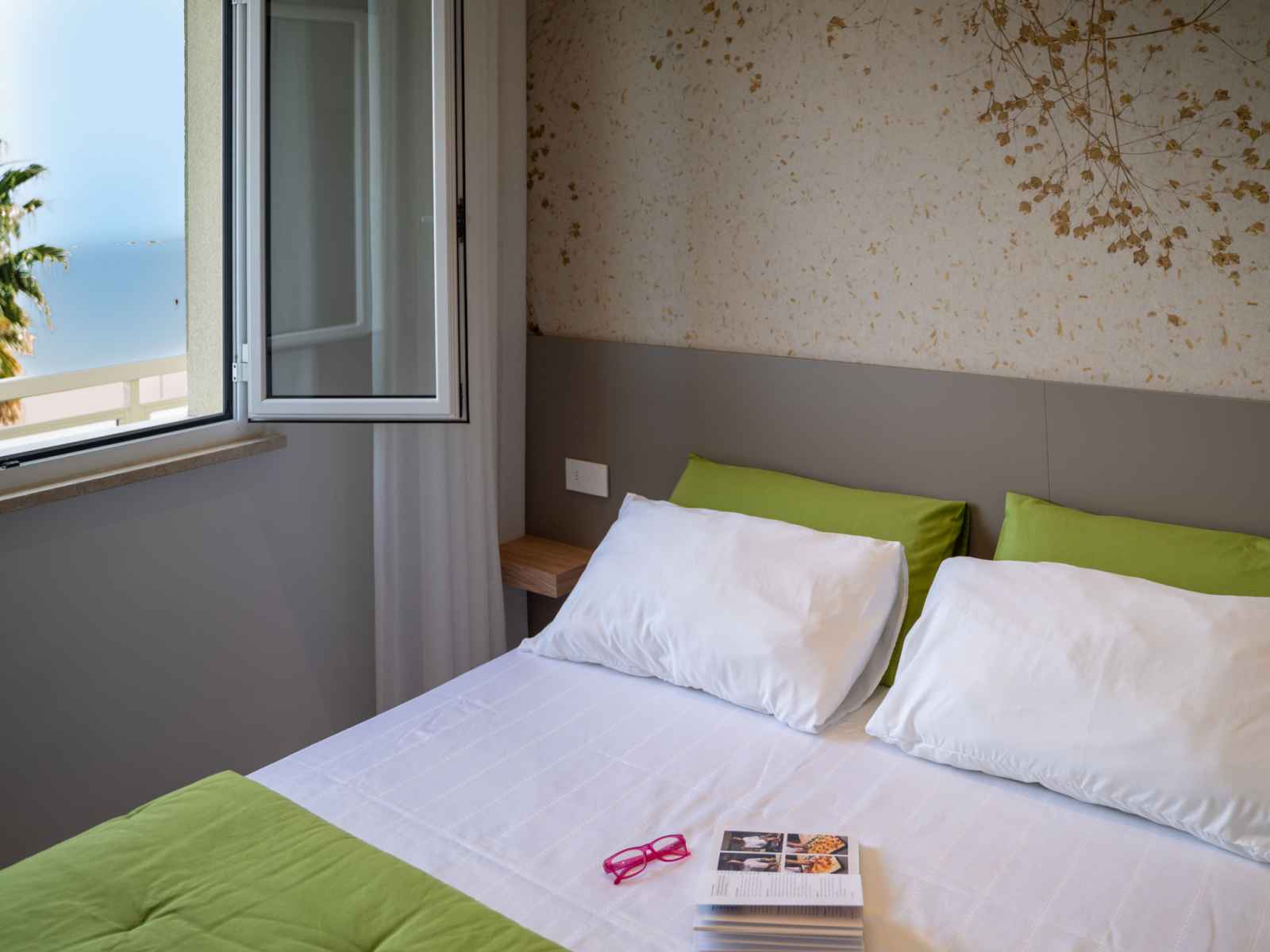 "mar di roseto", apt sous les toits 2 pièces 50 m2 au 4ème étage. spacieux et clair, aménagement plaisant: séjour/salle à manger avec 1 divan-lit, tv et air-conditionné. sortie sur le balcon. 1 chambre avec baie vitrée avec 1 divan-lit double. coin cuisine (poêle à gaz, 4 feux, bouilloire électrique, cafetière électrique). sortie sur