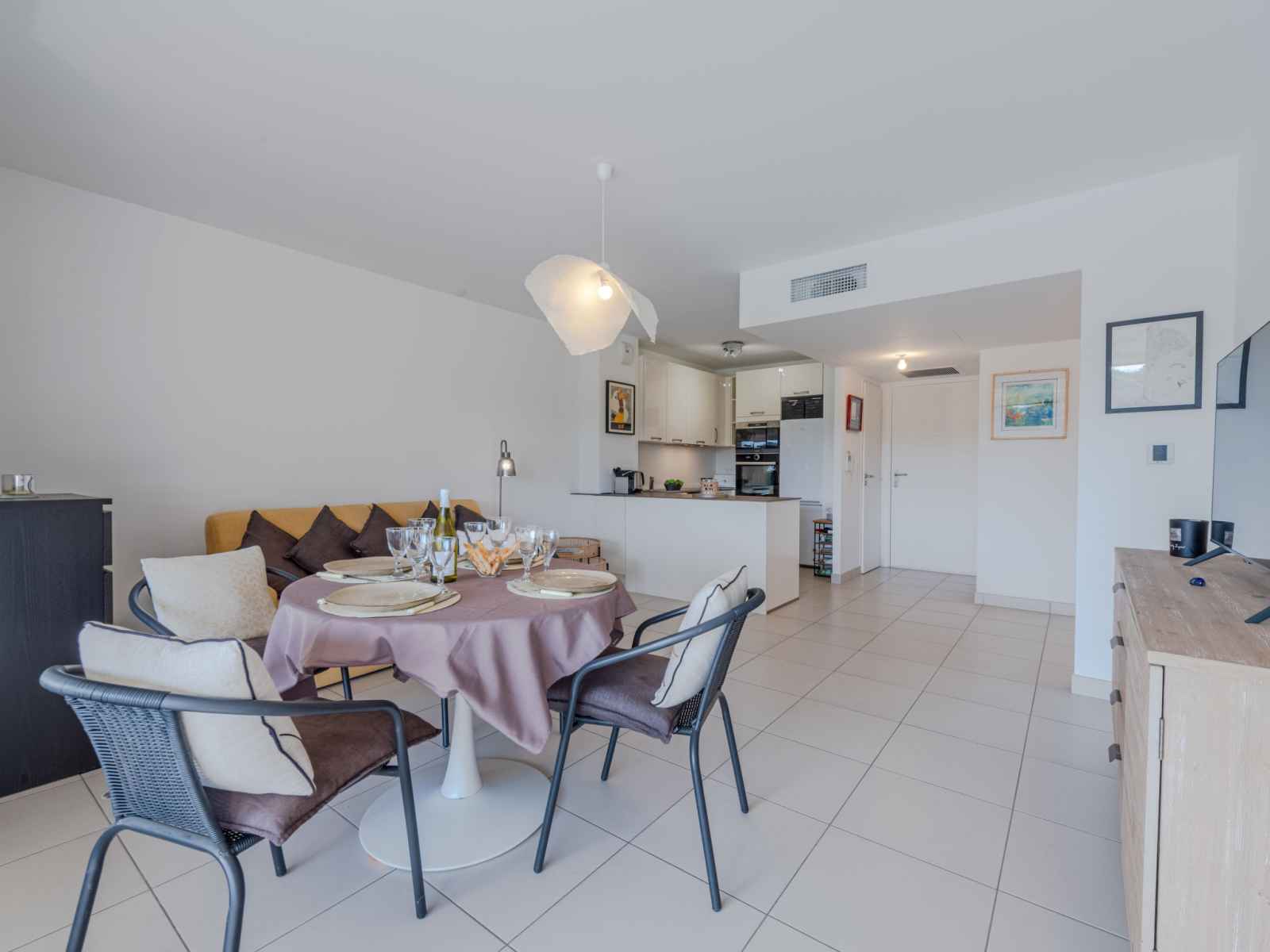 Apt 2 pièces 47 m2 au 1er étage. aménagement agréable: séjour/salle à manger avec 1 divan-lit double (140 cm, longueur 190 cm), table pour les repas et tv (écran plat), air-conditionné. sortie sur la loggia. 1 grande chambre avec 1 grand-lit (160 cm, longueur 200 cm), tv. coin cuisine (four, lave-vaisselle, 2 plaques vitrocéramiques,