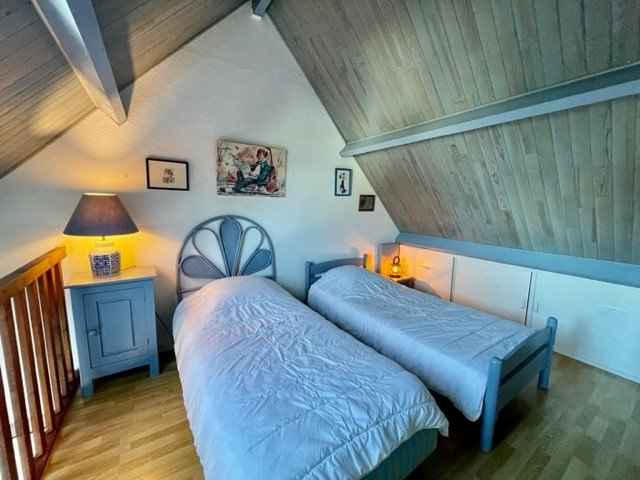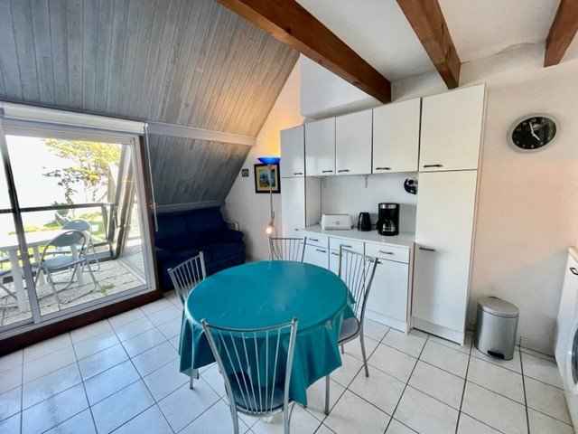 Cet appartement de type 2 pièces + mezzanine avec vue mer d'environ 40 m² pour 4 personnes se situe au 1er étage du bâtiment b, porte n°8 de la résidence "la plage" à kerhostin.