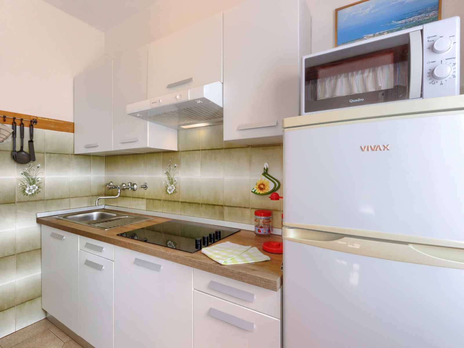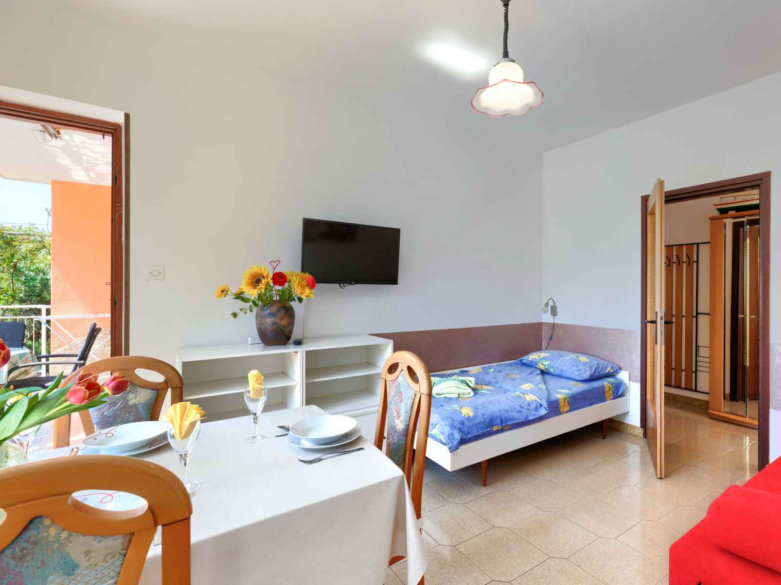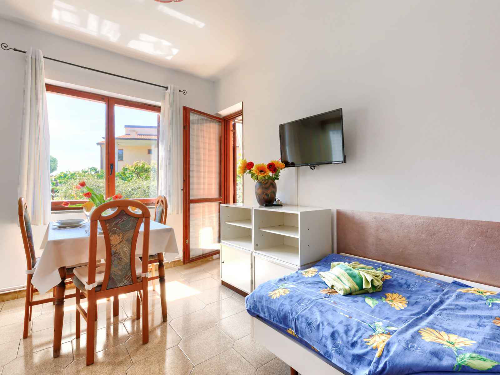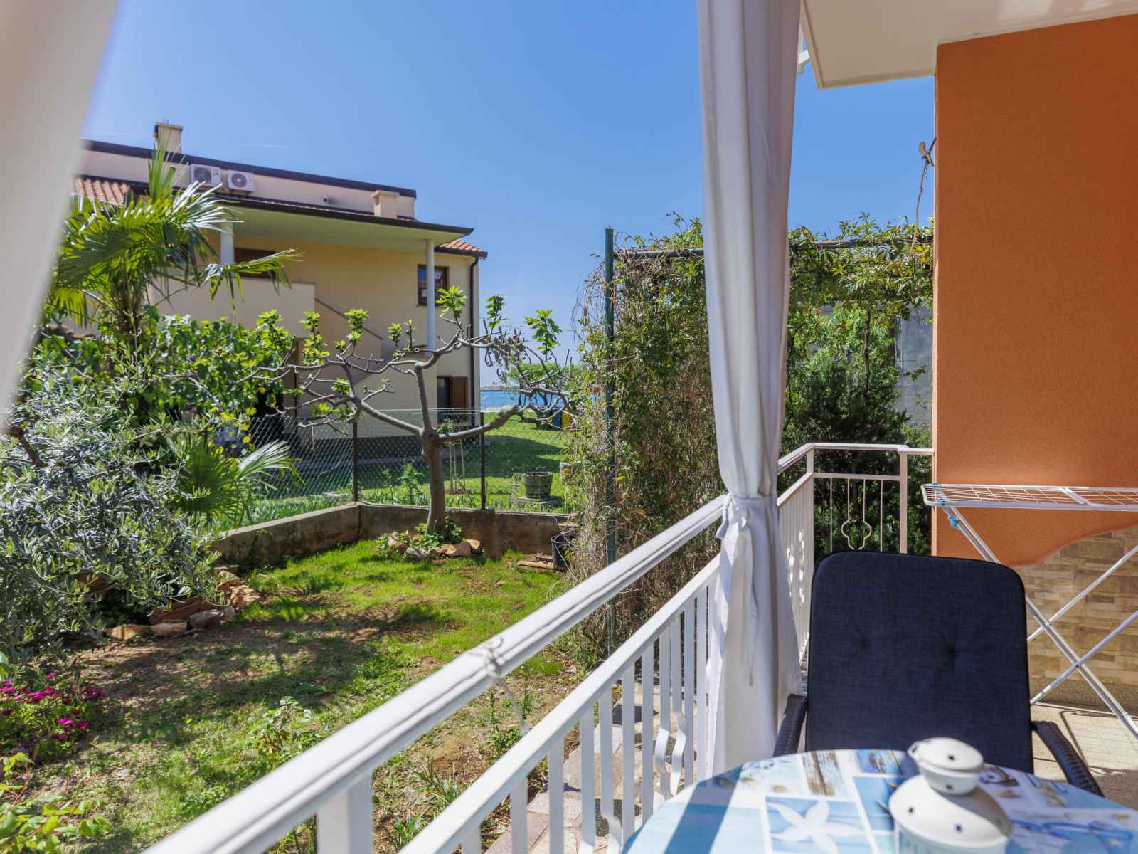 "elvi", apt 2 pièces 45 m2, au rez-de-chaussée. séjour/chambre à coucher avec 1 lit, table pour les repas, tv (satellite) et air-conditionné. sortie sur le balcon. 1 chambre avec 1 lit double (2 x 90 cm, longueur 200 cm). sortie sur le balcon. cuisine ouverte (4 plaques de cuisson, grille-pain, bouilloire électrique, micro-ondes, cafetière