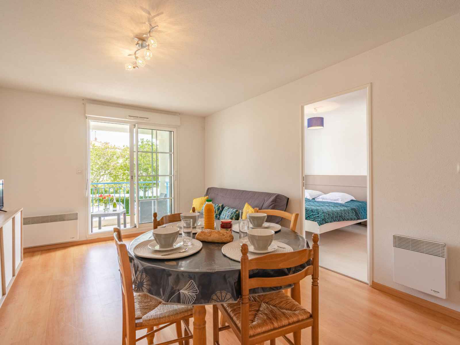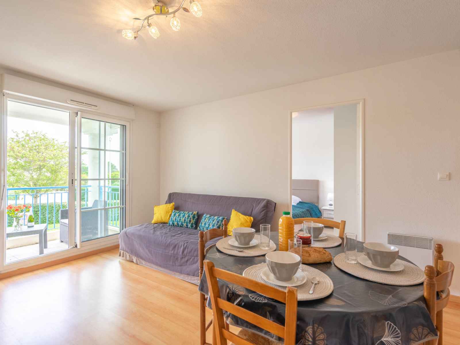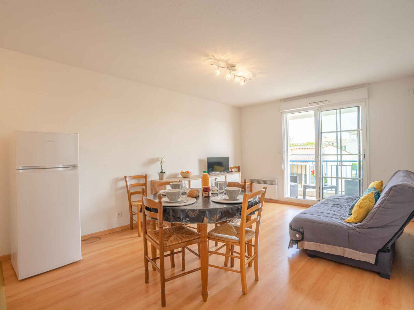 Apt 2 pièces 36 m2 au 1er étage, situation est. séjour avec 1 divan-lit double (1 x 140 cm, longueur 190 cm), tv (écran plat). sortie sur le balcon. 1 chambre avec 2 lits (90 cm, longueur 190 cm). coin cuisine (lave-vaisselle, 2 plaques à induction, congélateur, cafetière électrique, combiné micro-ondes). douche, wc séparé. chauffage