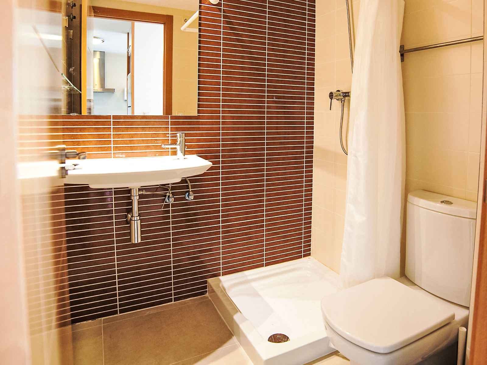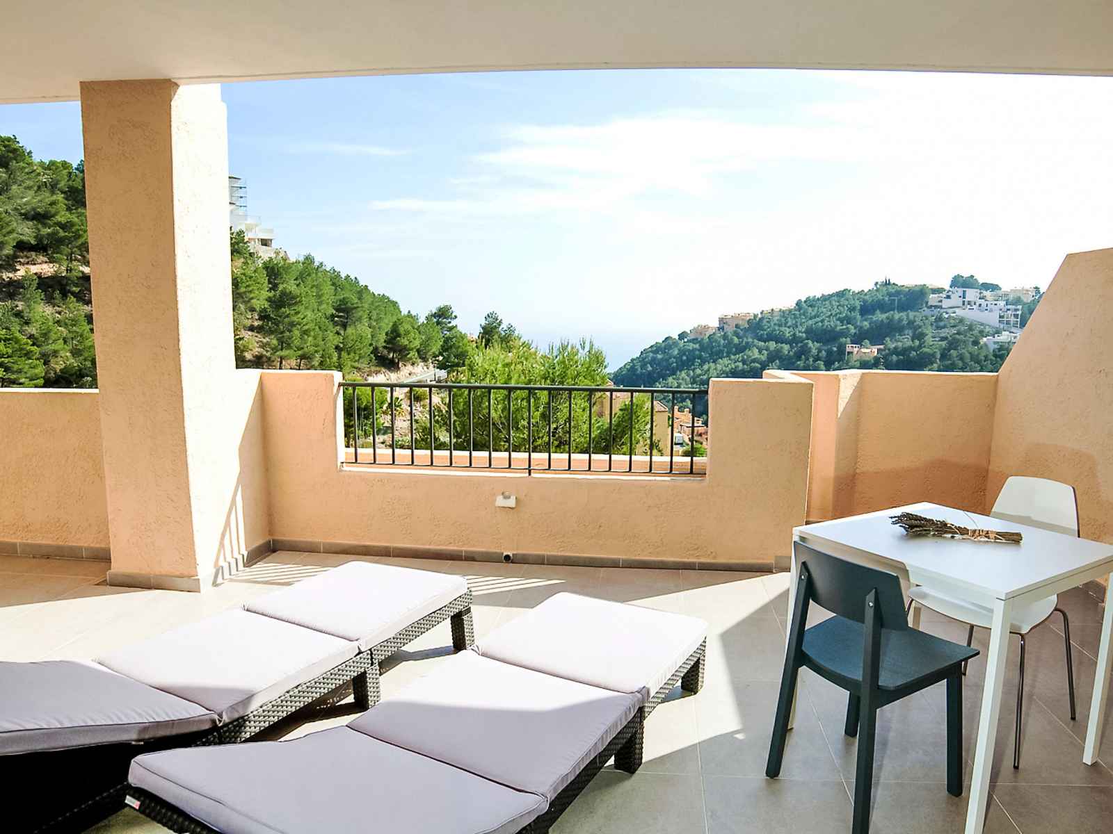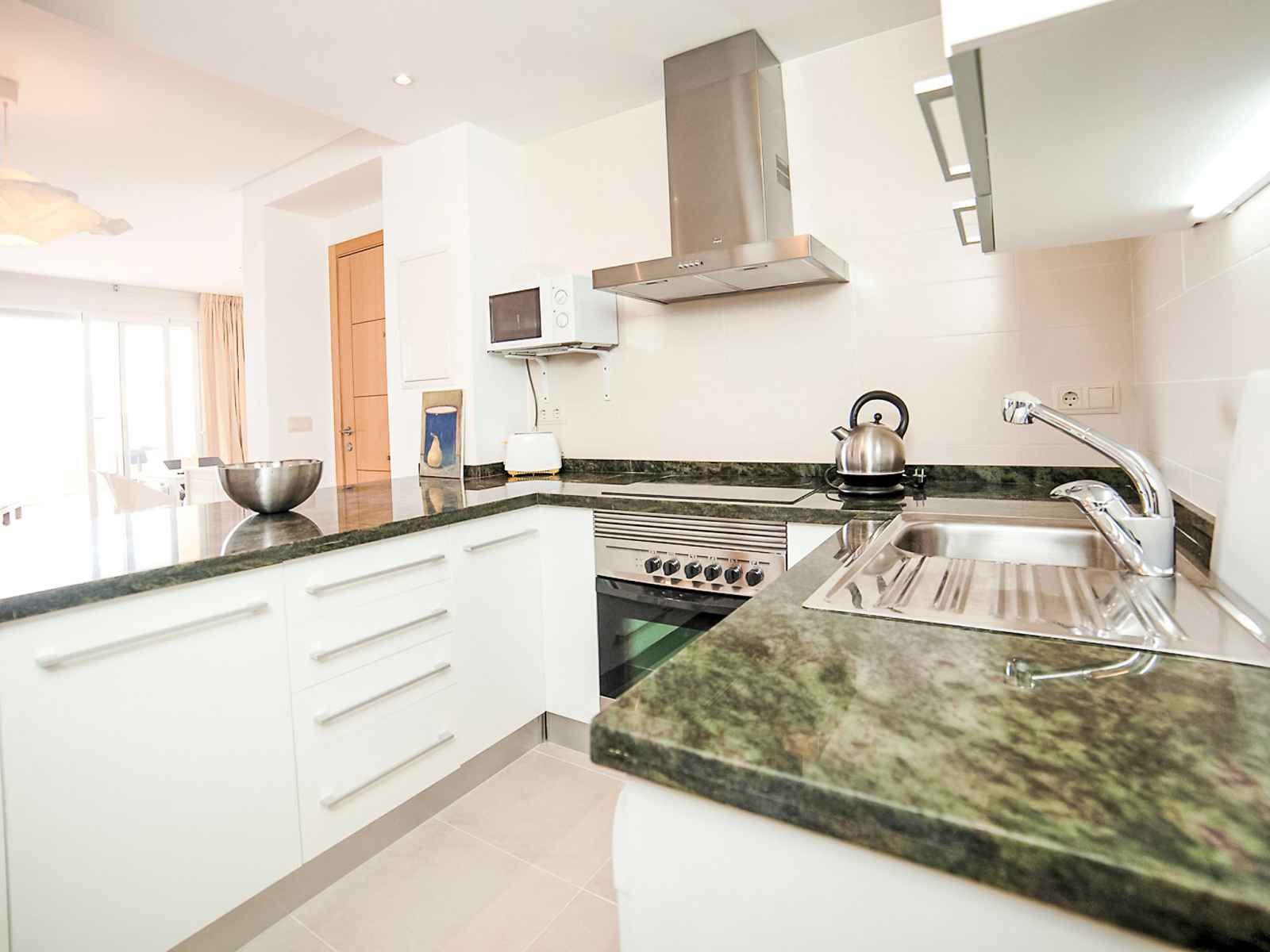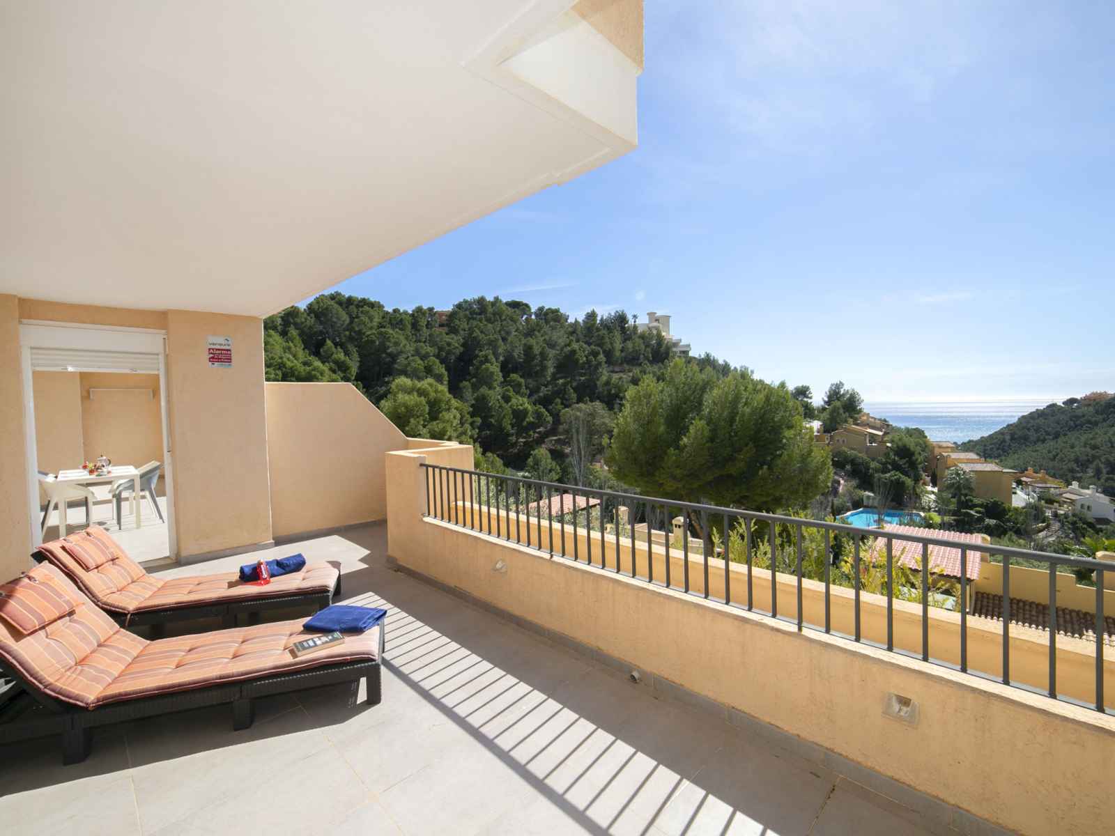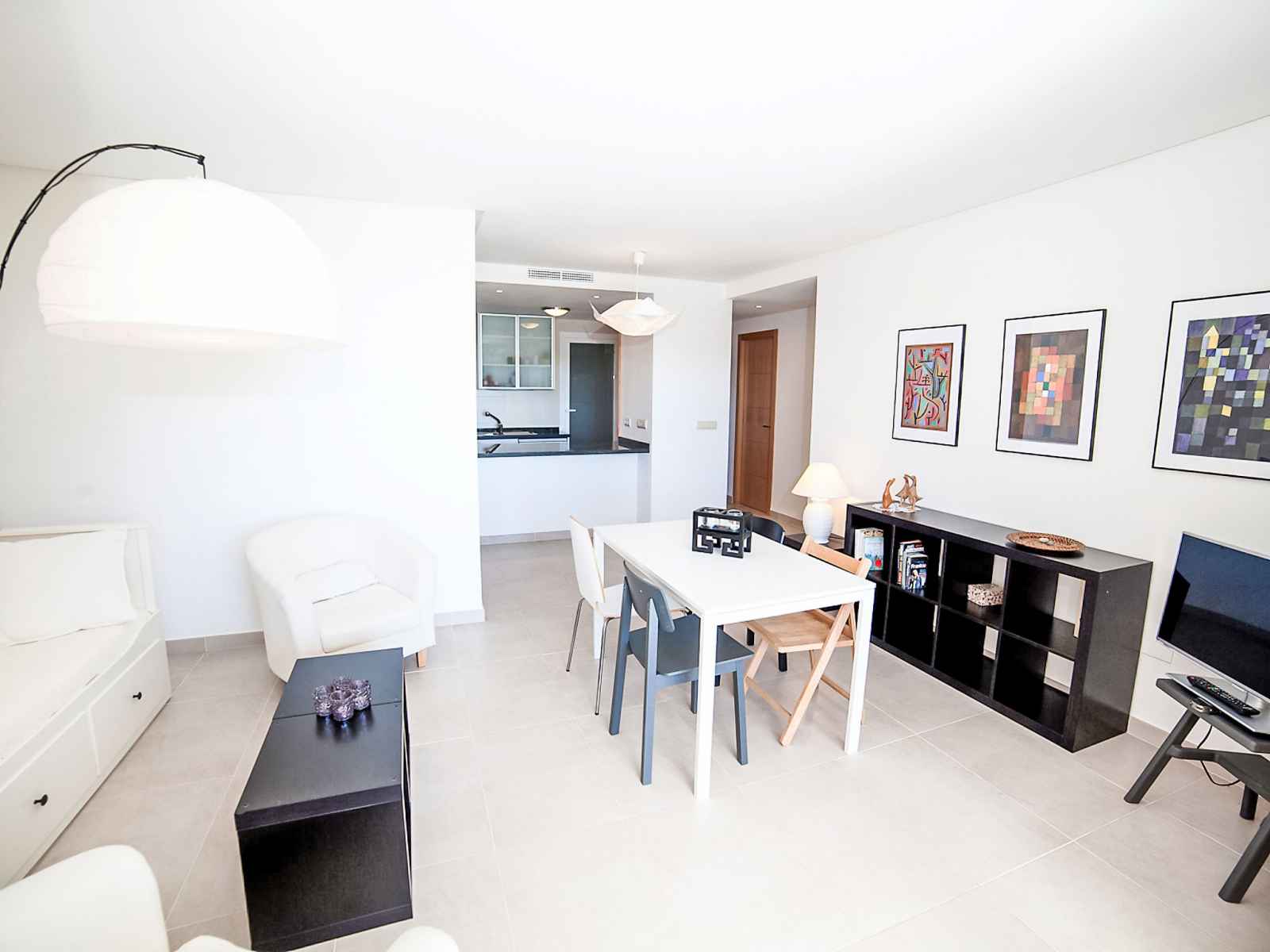 chaud. Sortie sur la loggia. 1 chambre double avec 2 lits (80 cm, longueur 200 cm), air-conditionné et chauffage à air chaud. Cuisine ouverte (four, lave-vaisselle, 4 plaques vitrocéramiques, grille-pain, bouilloire électrique, micro-ondes, congélateur, cafetière électrique) avec coin repas. Douche/bidet/WC. Chauffage électrique. Grande terrasse. Meubles de terrasse, chaises longues (2). Vue sur la mer et les montagnes. A disposition: lave-linge, fer à repasser. Internet (Connexion WIFI, gratuit). Place de parking No 26 (couvert, cloturée). Veuillez noter: adapté(e) aux familles. TV seulement ES. AT-440249-A // Reg. Nr.: ESFCTU00000305300055041600000000000000000AT-440249-A5