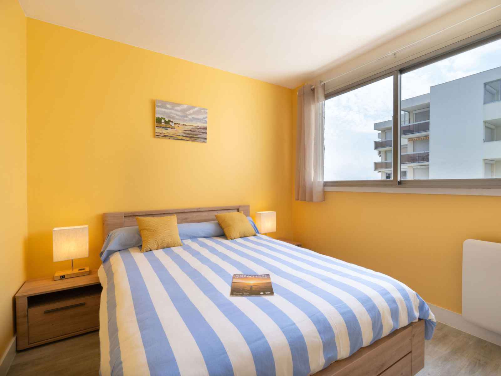 Apt 3 pièces 45 m2 au 9ème étage. aménagement agréable et de bon goût: séjour/salle à manger avec tv (écran plat). sortie sur le balcon. 1 chambre avec 1 grand-lit (1 x 140 cm, longueur 190 cm). 1 chambre avec 2 lits (90 cm, longueur 190 cm). cuisine ouverte (four, lave-vaisselle, 2 plaques à induction, grille-pain, bouilloire