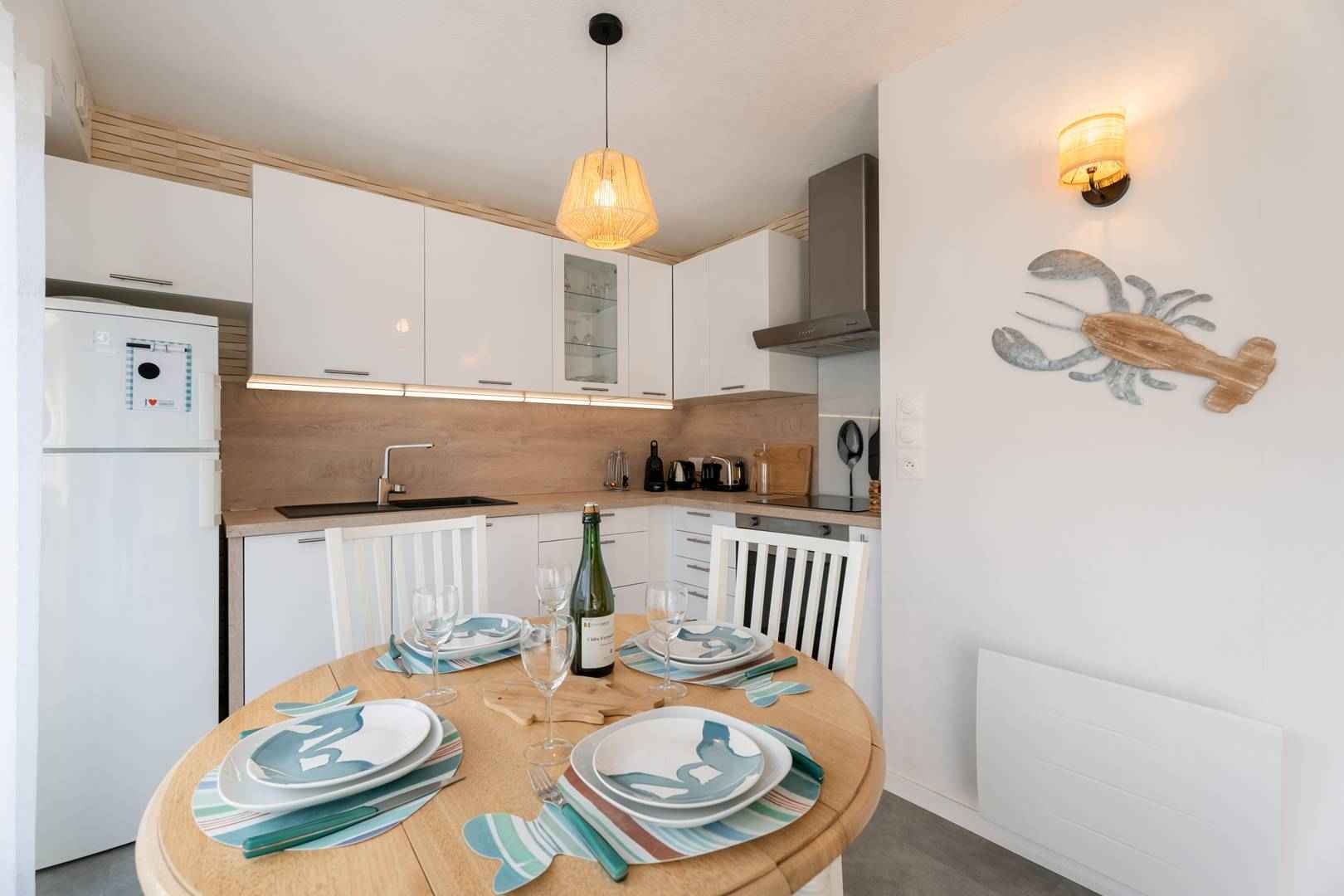 - Cuisine ouverte et équipée (plaque induction 4 feux, four, micro-ondes, lave-vaisselle, réfrigérateur-congélateur) avec partie repas (table et chaises)