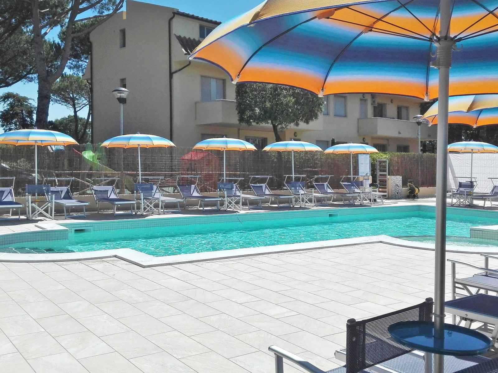 Petite résidence "riviera", de 3 étages, environnée par les arbres et prés. 10 appartements dans la résidence. À 600 m du centre de cecina mare, en bordure de la localité, à 650 m de la mer. en commun: terrain 4'500 m2 (clôturé), arbres, piscine (12 x 5 m, disponibilité saisonnière: 23.mai. - 30.sep. horaires d'ouverture de la piscine: