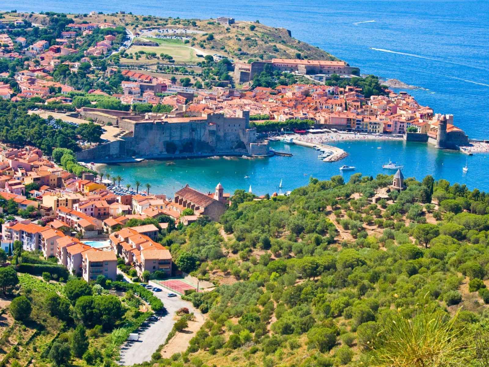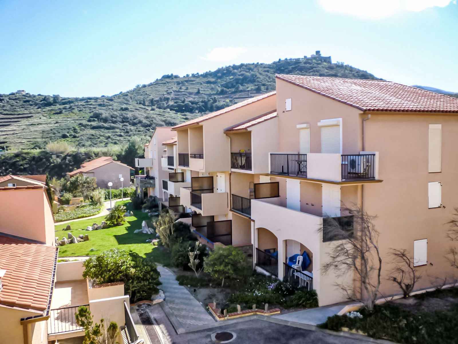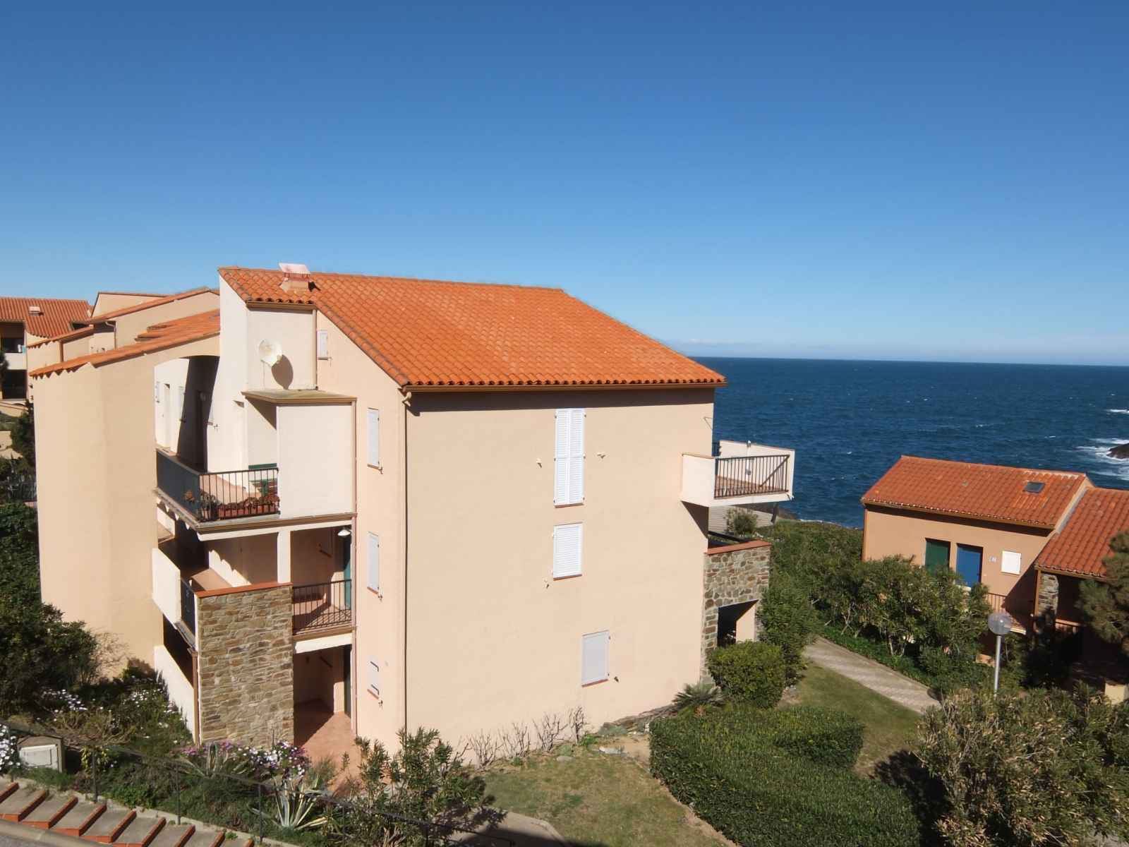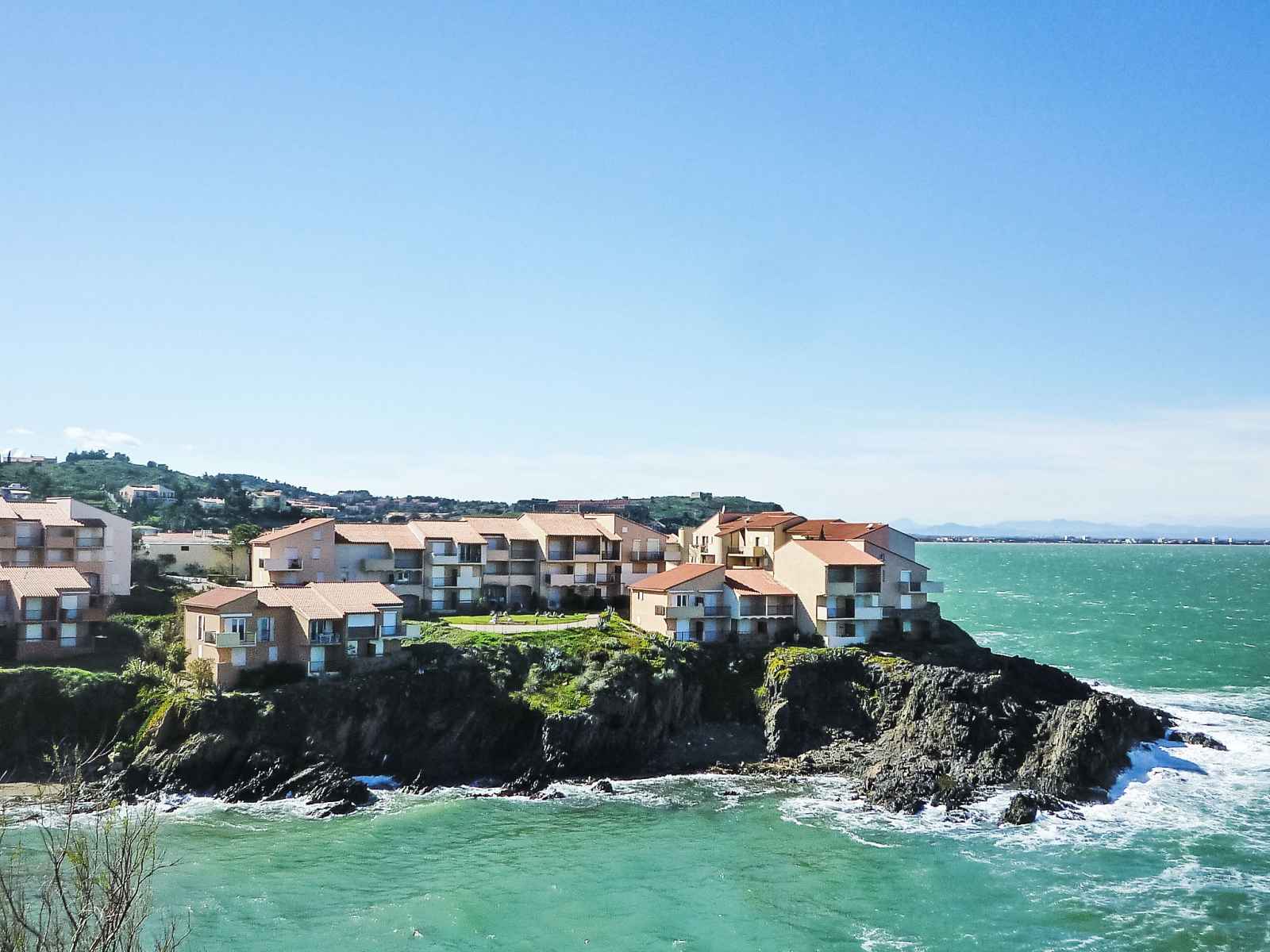 A flanc de falaise et dominant la baie avec accès direct à une crique (petite plage de sable et graviers) résidence "les roches bleues". en bordure de la localité, à 1.5 km du centre de collioure, à 200 m de la mer, à 200 m de la plage. magasins 1 km, supermarché 400 m, restaurant 500 m, arrêt de bus 300 m, gare ferroviaire "collioure"