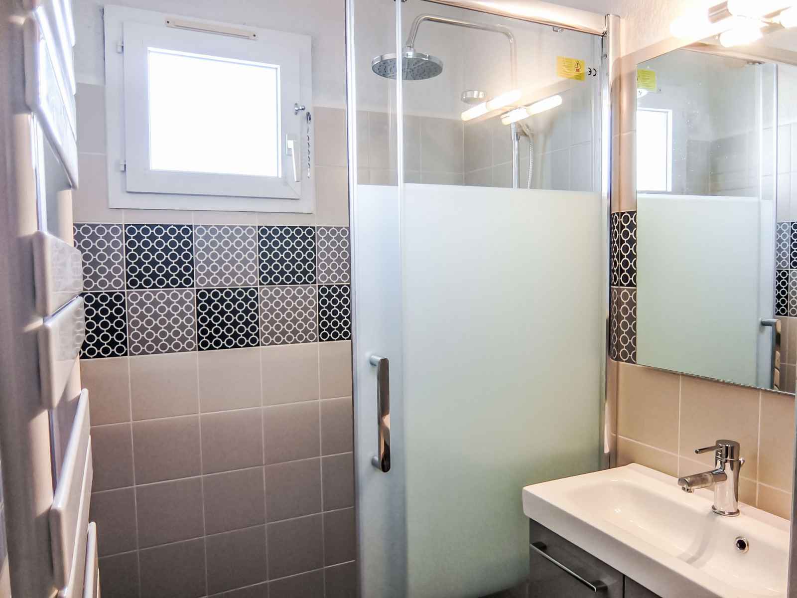 Douche, WC séparé. Chauffage électrique. À l'étage supérieur: (escalier raide) galerie avec 1 lit (80 cm, longueur 190 cm), 1 grand-lit (140 cm, longueur 190 cm). Chauffage électrique. Balcon 6 m2, situation sud-est. Mobilier de balcon. Belle vue sur la mer. A disposition: lave-linge. Garage. Veuillez noter: détecteur de fumée. Au lieu d'une chambre fermée, des espaces de couchage sont situés dans une zone ouverte (galerie, alcôve...).