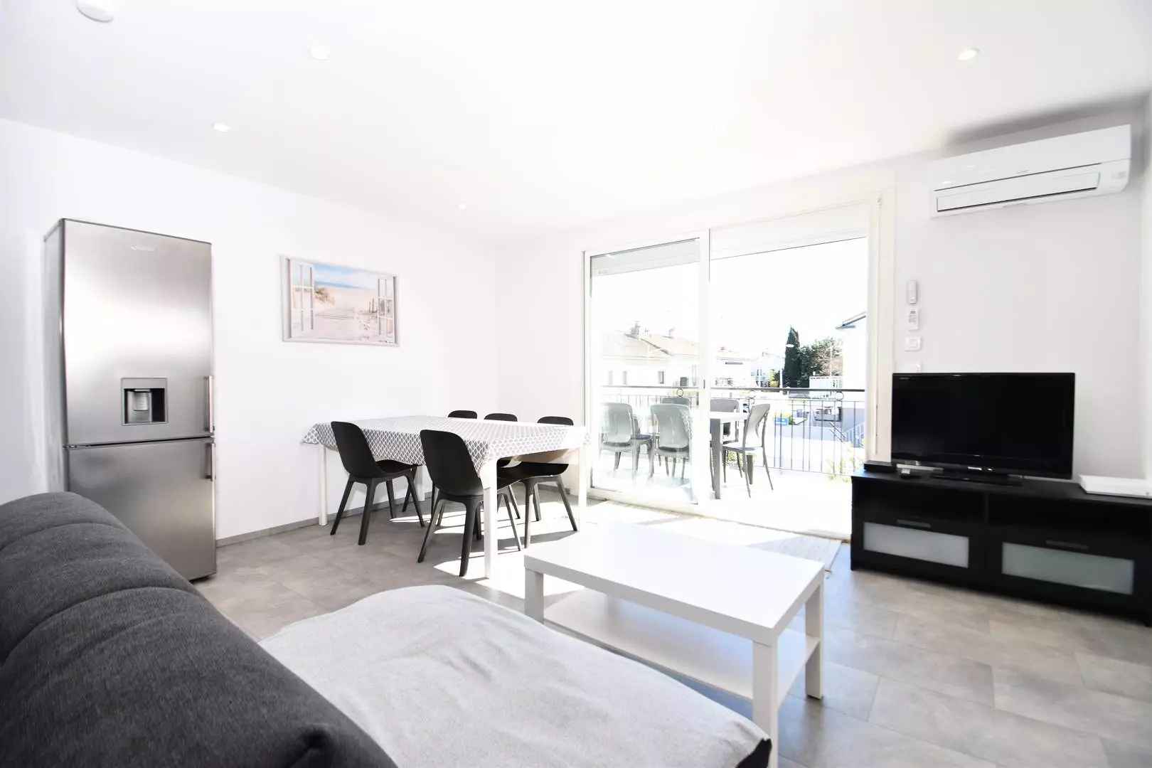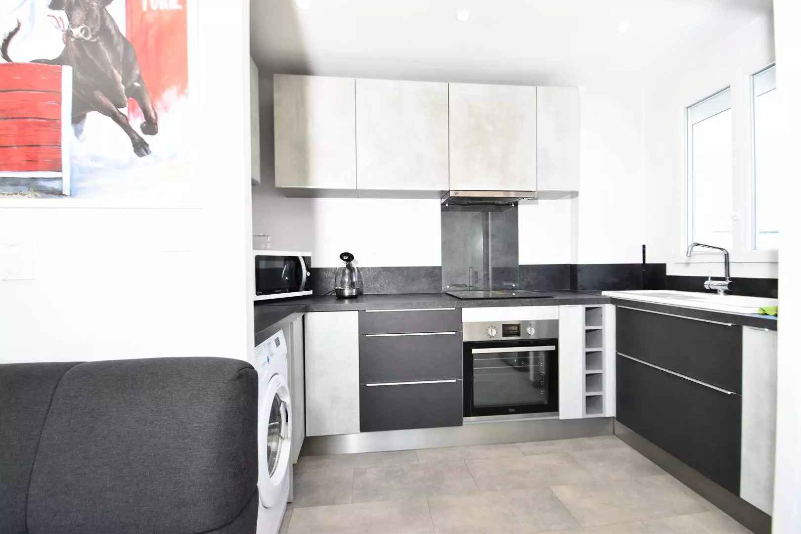 ce superbe appartement entièrement rénové de 59m², vous offre une grande cuisine américaine toute équipée, deux chambres avec lits doubles, une salle d eau avec douche à l italienne. sa grande pièce à vivre avec sa belle terrasse