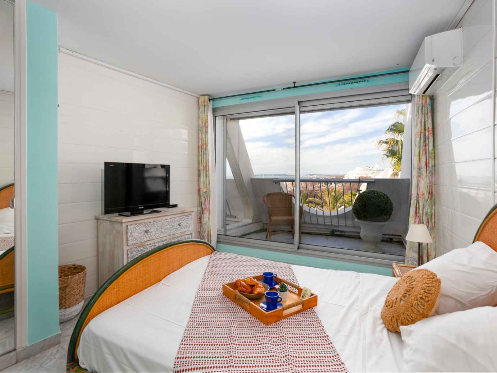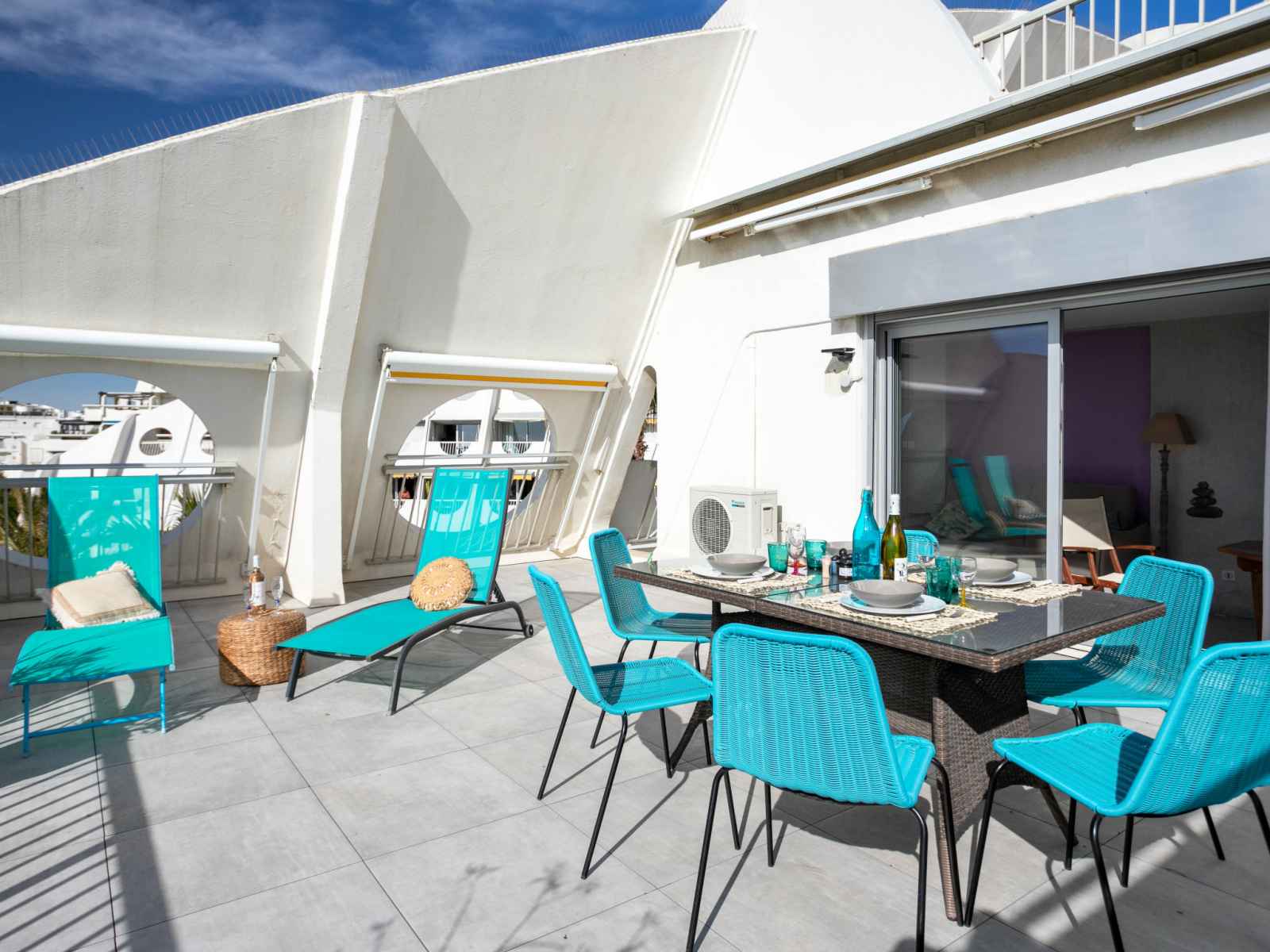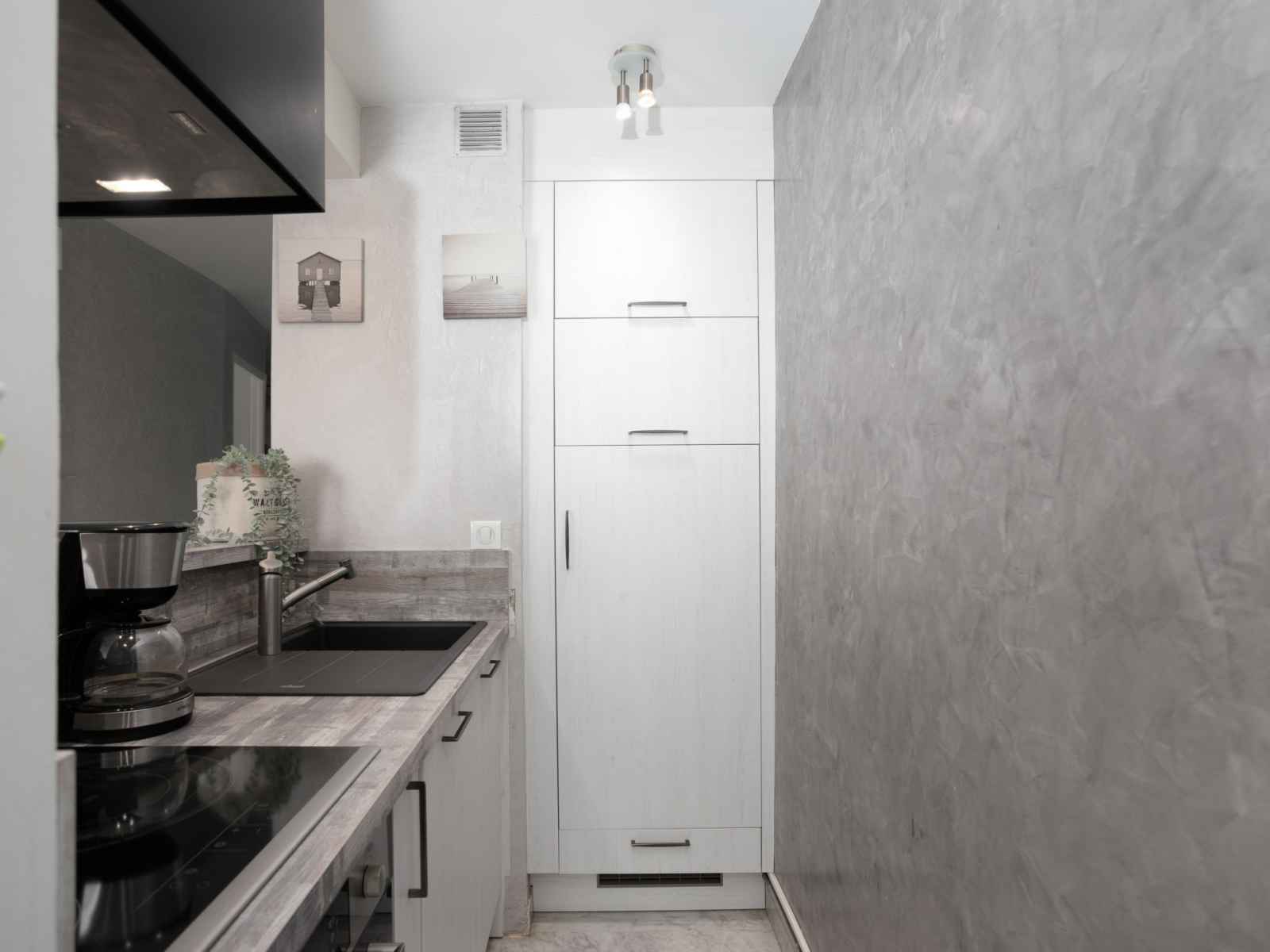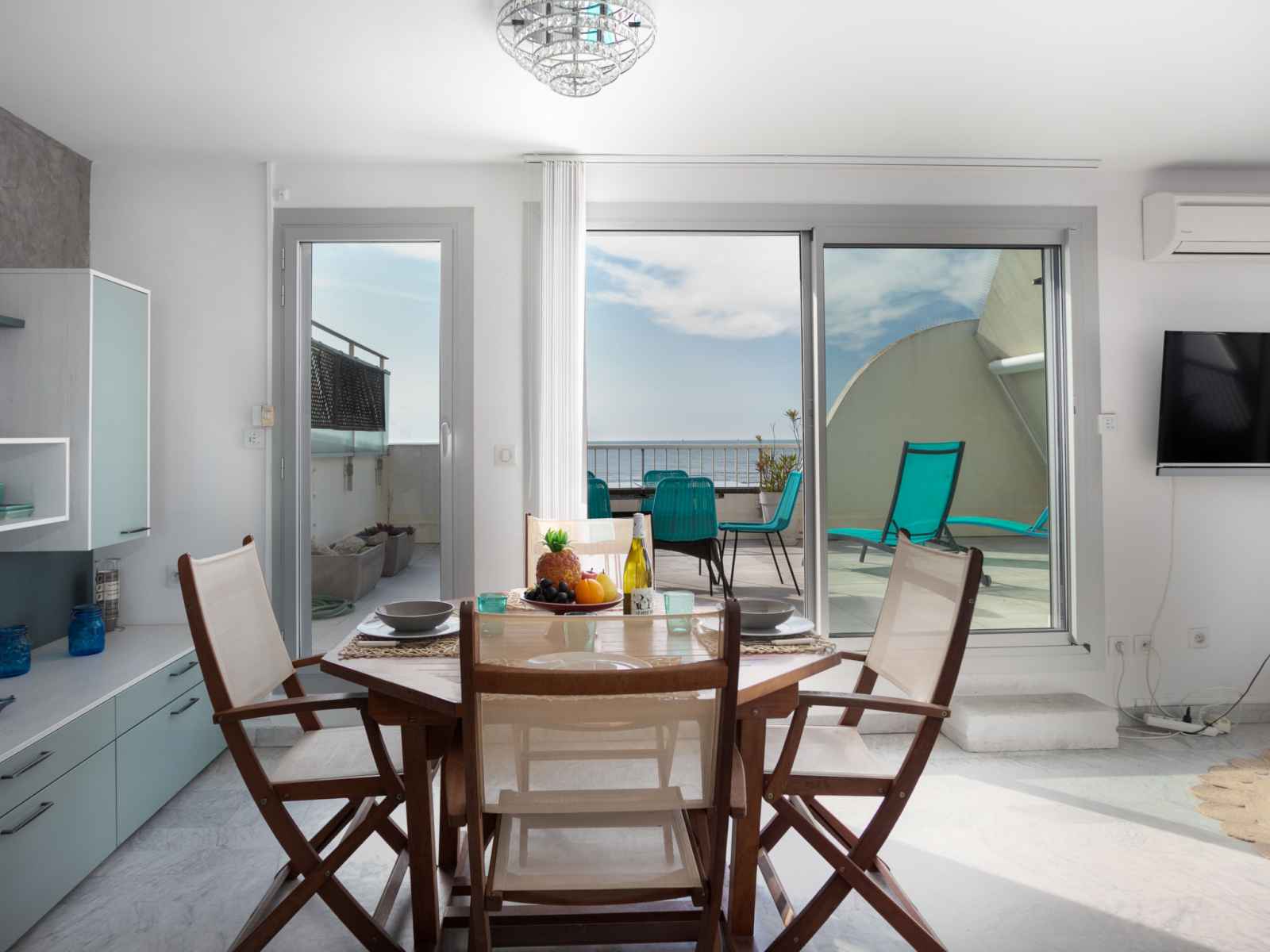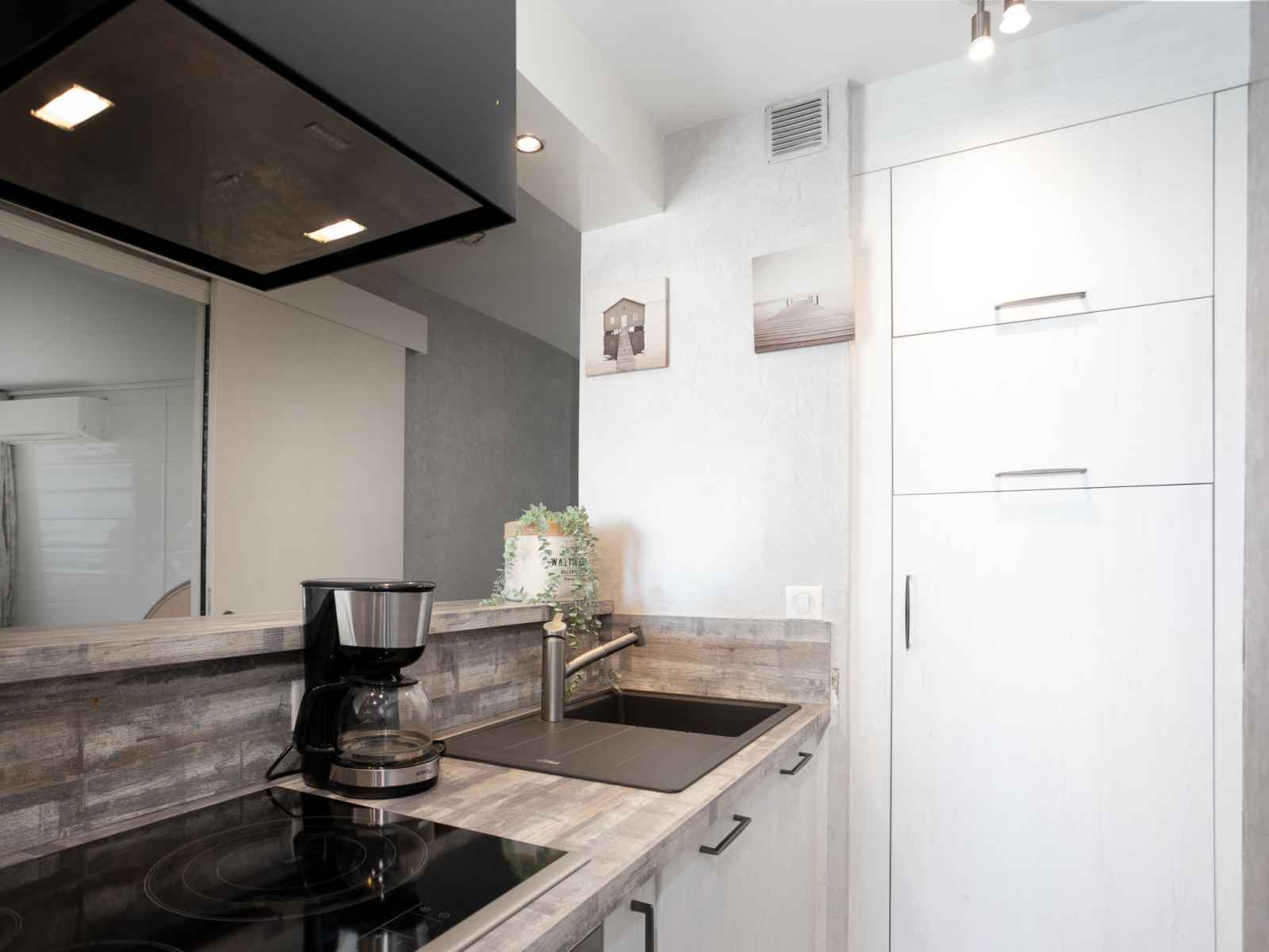 ouverte (lave-vaisselle, 3 plaques vitrocéramiques, grille-pain, bouilloire électrique, congélateur, cafetière électrique, combiné micro-ondes) avec passe-plat. Salle de bains, douche, WC séparé. Air-conditionné. 3 balcons 10 m2, situation sud-ouest, grande terrasse 40 m2, situation sud. Meubles de terrasse, chaises longues. Superbe vue sur la mer. A disposition: lave-linge. Internet (Connexion WIFI, en sus). Garage No voiture standard (1 Voiture), hauteur 180 cm, largeur 220 cm. Veuillez noter: maximum 1 animal/ chien autorisé. Détecteur de fumée.