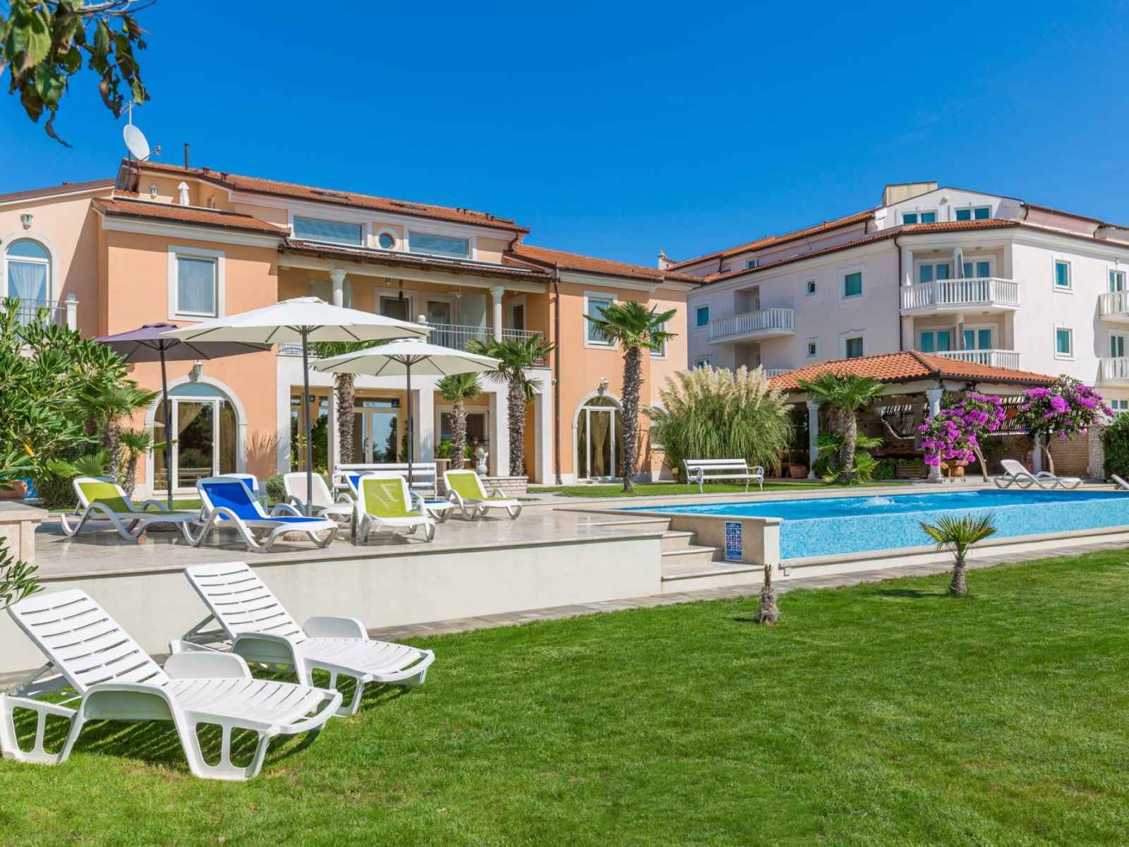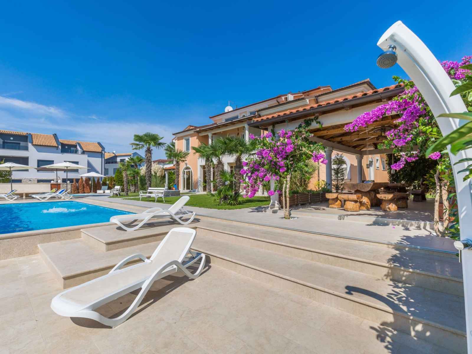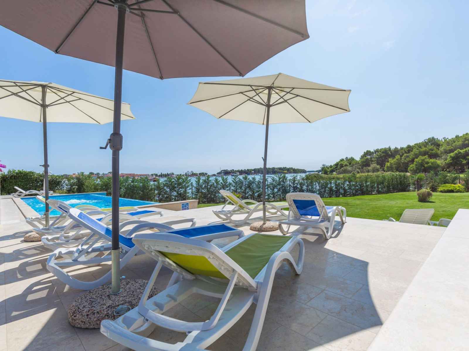Belle petite résidence accueillante "villa vizula", de 3 étages. À 500 m du centre de medulin, situation ensoleillée, à 10 m de la mer, à 250 m de la plage. en commun: terrain 1'000 m2 (clôturé), piscine rectangulaire (11 x 4 m, 40 m2, profondeur 140 cm, disponibilité saisonnière: 01.jun. - 01.oct.). douche extérieure, terrasse (20 m2),