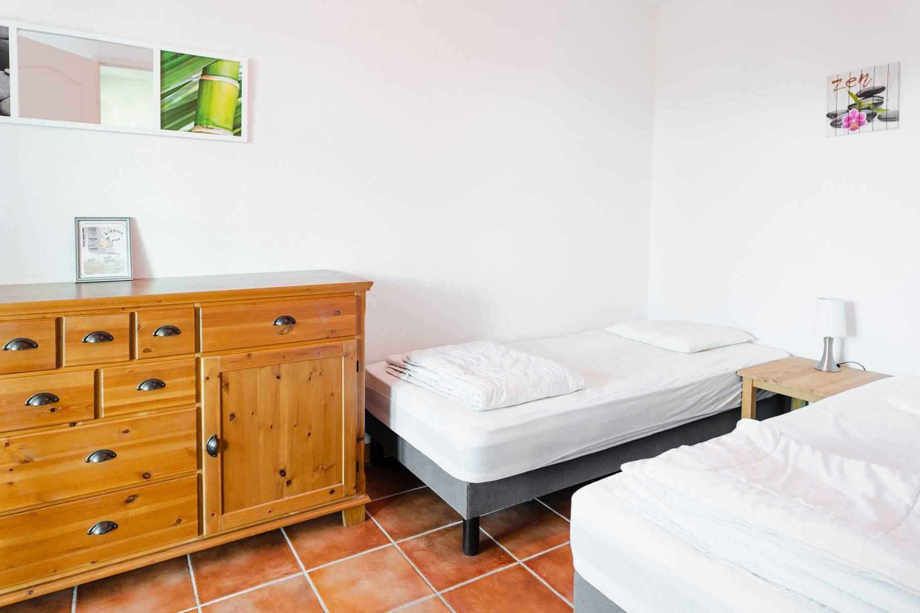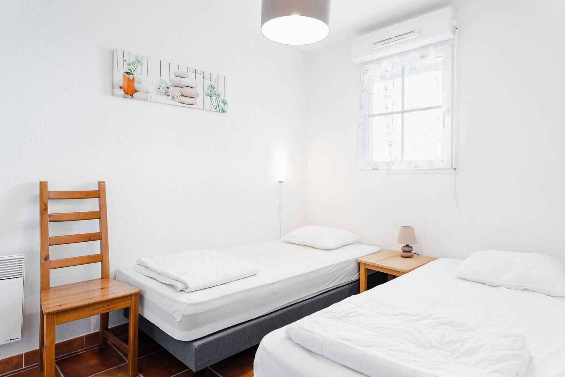 2 chambres avec 2 petits lits (90x190cm). Balcon de 15 m² avec salon de jardin et 2 chiliennes.
