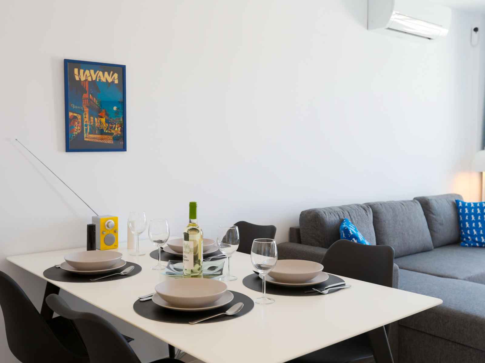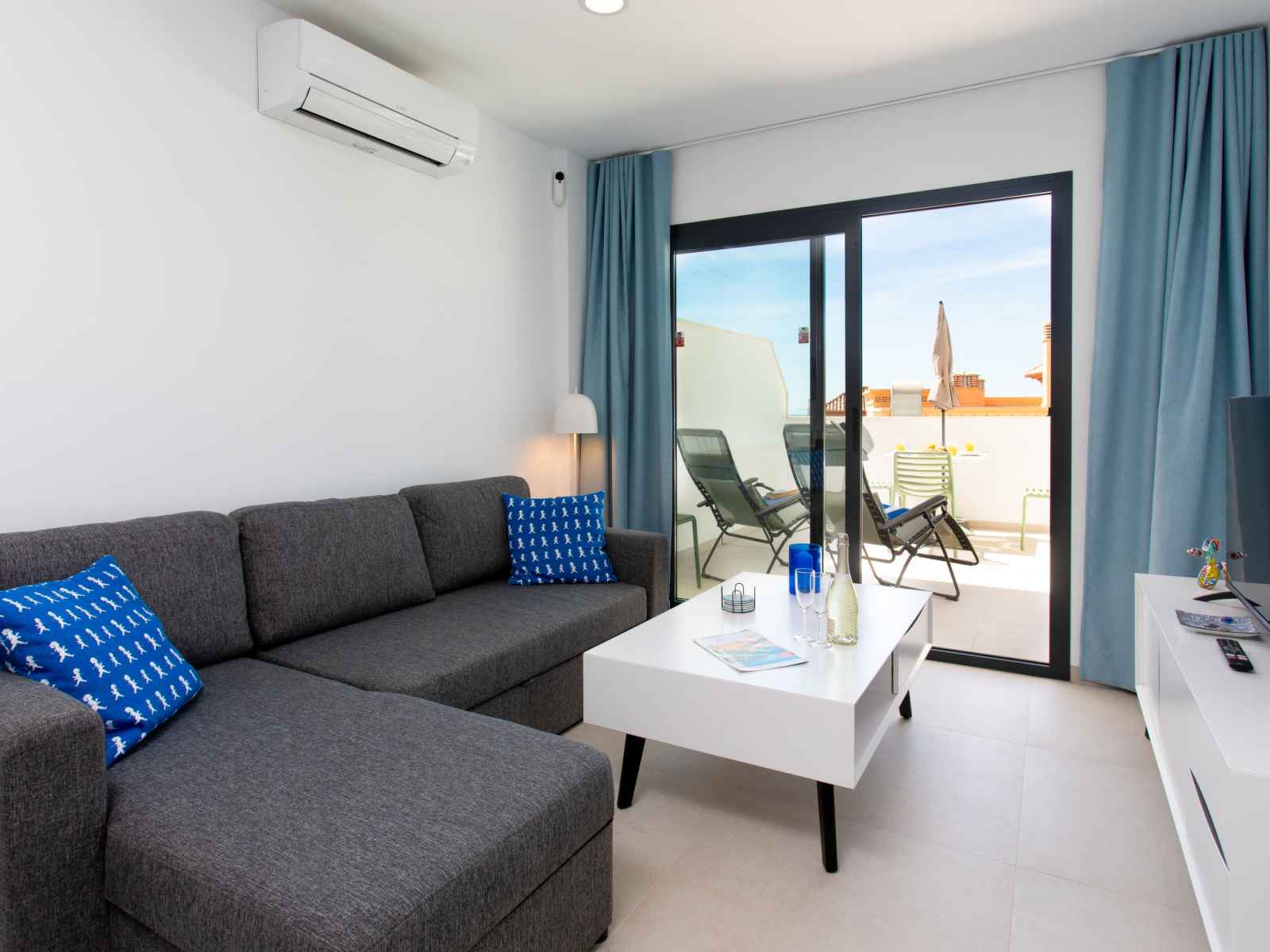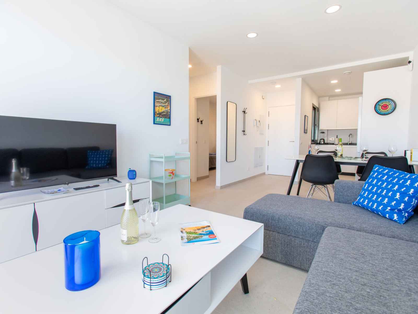 "colina alta", apt 3 pièces 56 m2, situation sud. clair, aménagement très fonctionnel et confortable: séjour/salle à manger avec table pour les repas, télévision numérique, chaînes de tv internationales, écran plat, air-conditionné et chauffage à air chaud. sortie sur la terrasse. 1 chambre avec 1 grand-lit (160 cm, longueur 190 cm),