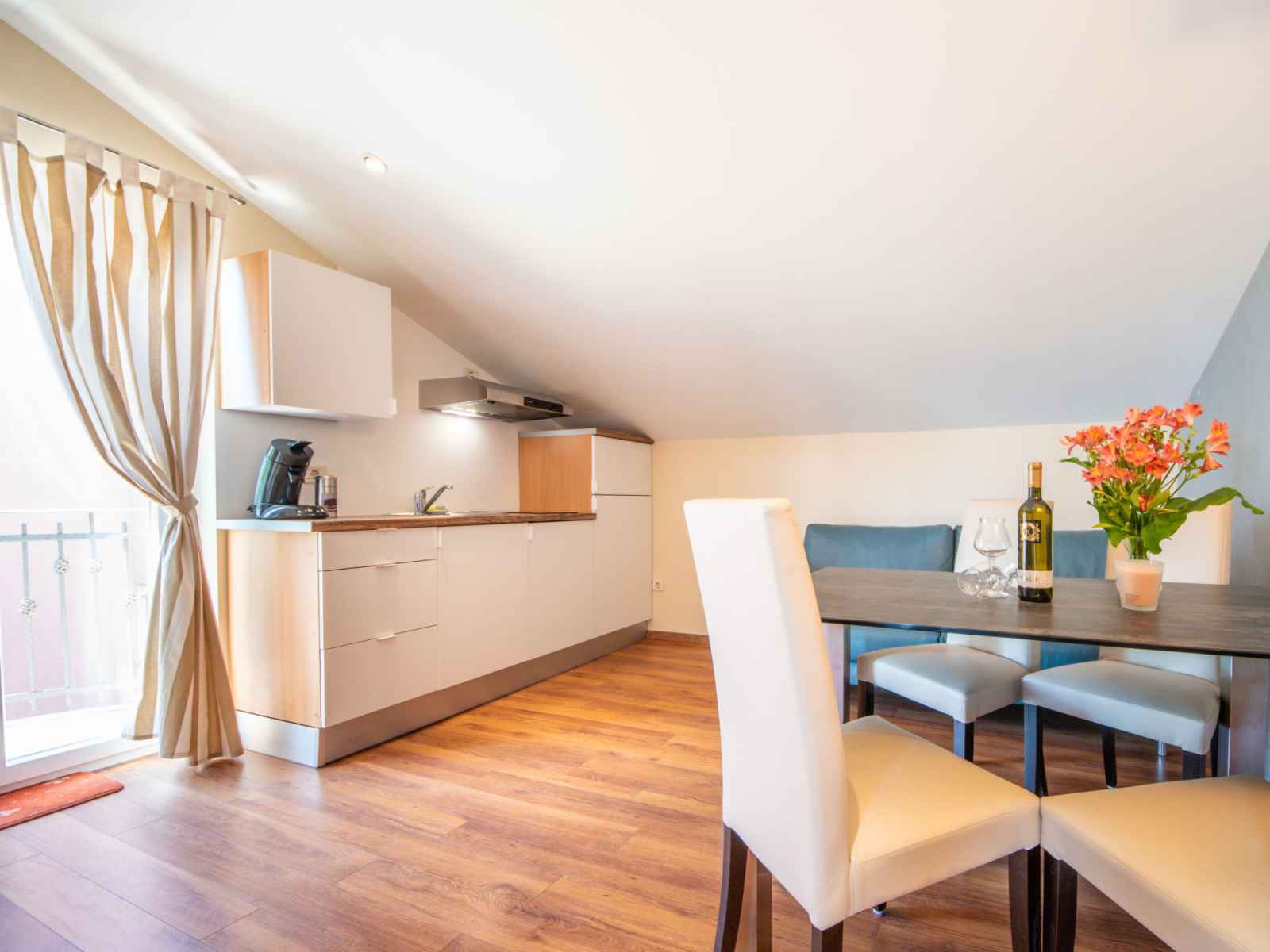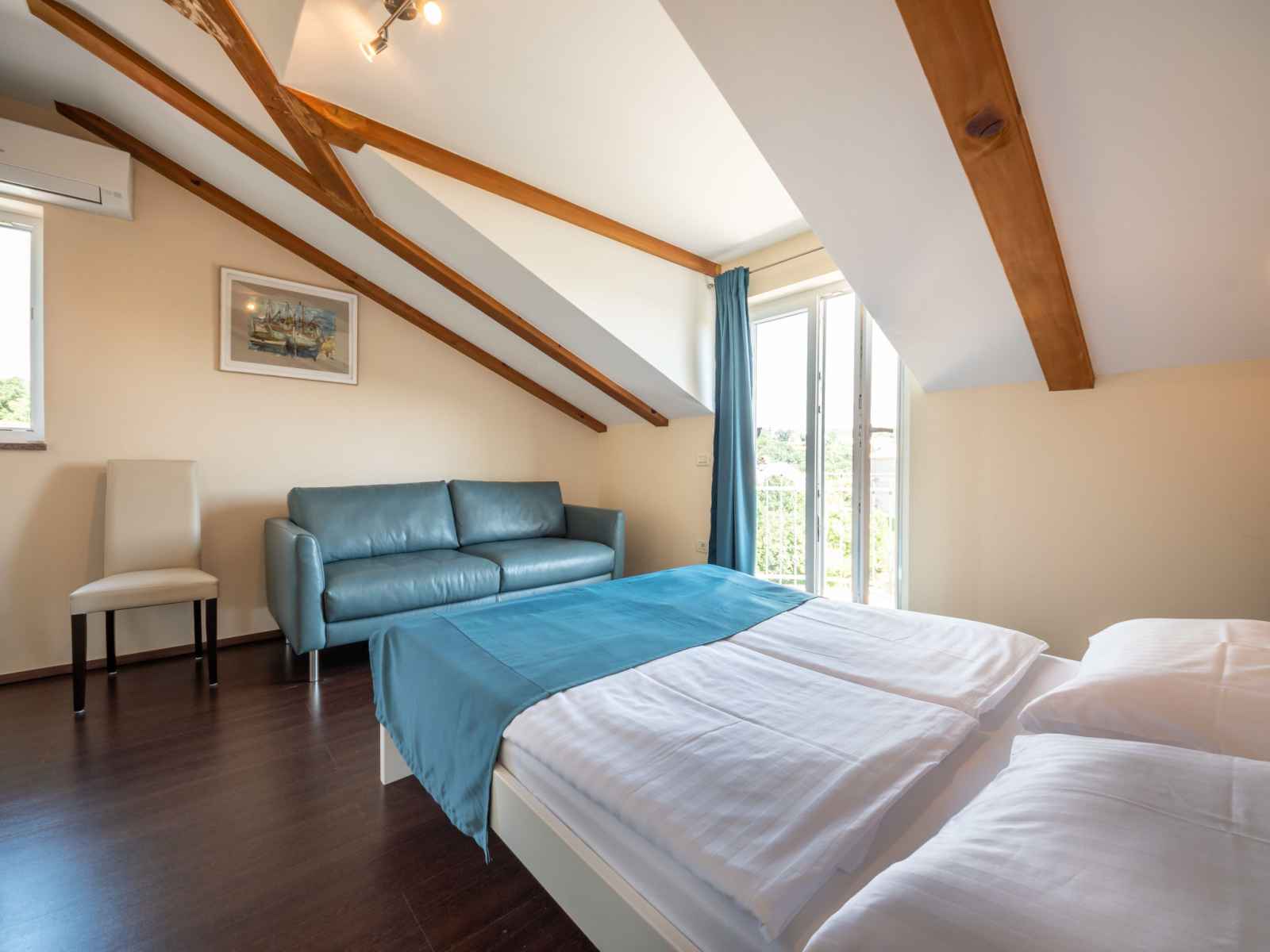 Apt 3 pièces 68 m2, sous le toit, situation sud. séjour/salle à manger mansardé hauteur plafond 140 - 250 cm avec tv (satellite) (écran plat). sortie sur le balcon. 1 chambre mansardée hauteur plafond 140 - 250 cm avec 1 grand-lit (140 cm, longueur 200 cm), air-conditionné. sortie sur la terrasse. 1 chambre mansardée hauteur plafond 130 -