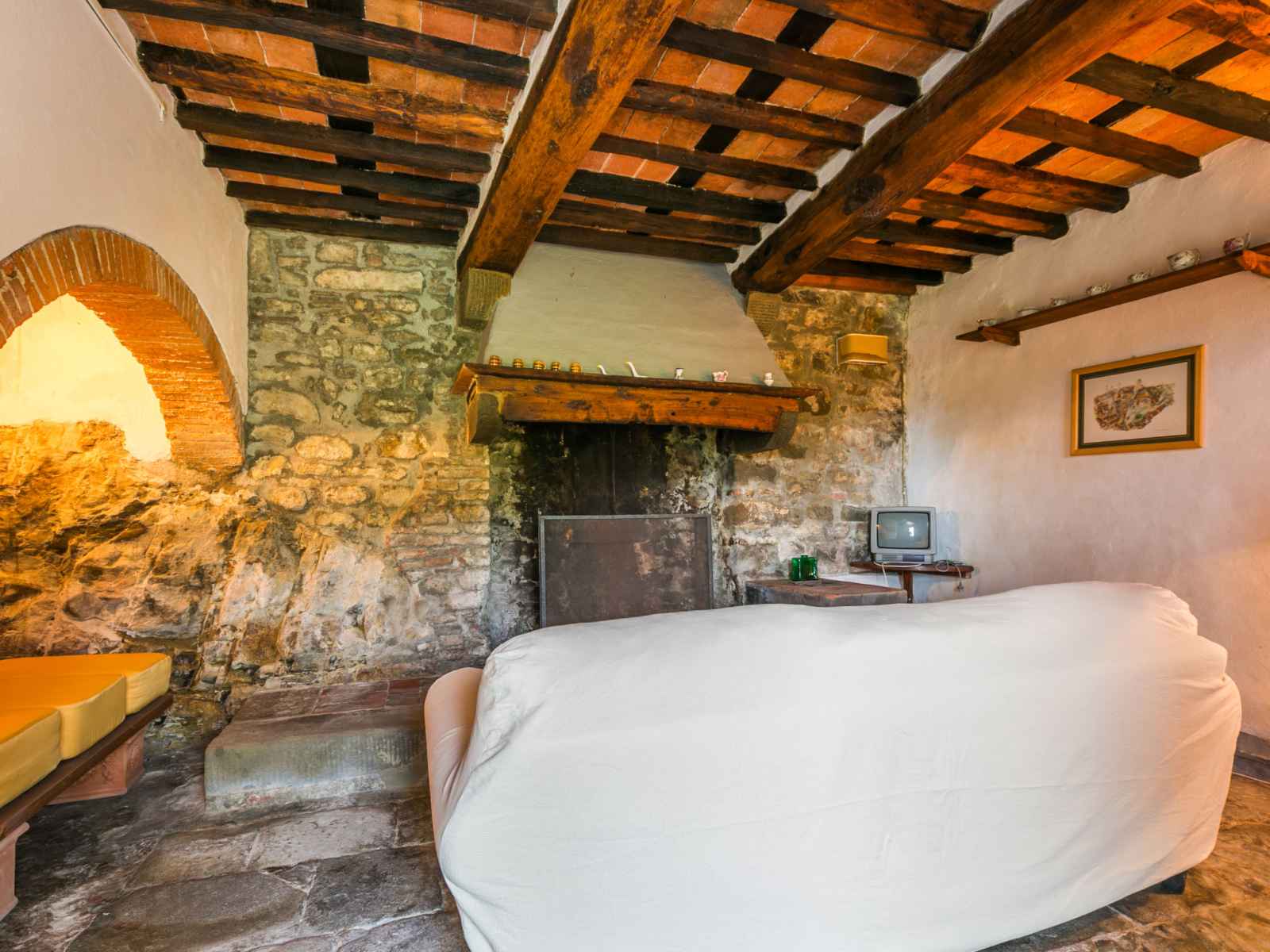 "podere villa/apt. mezzo", apt 3 pièces 65 m2 sur 2 niveaux. aménagement simple et rustique: séjour avec cheminée et tv (satellite). À l'étage supérieur: 1 chambre double. 1 chambre avec 2 lits. cuisine/séjour (four, 4 feux, cafetière électrique) avec table pour les repas. sortie sur le jardin. douche/wc. chauffage au gaz. jardinet.