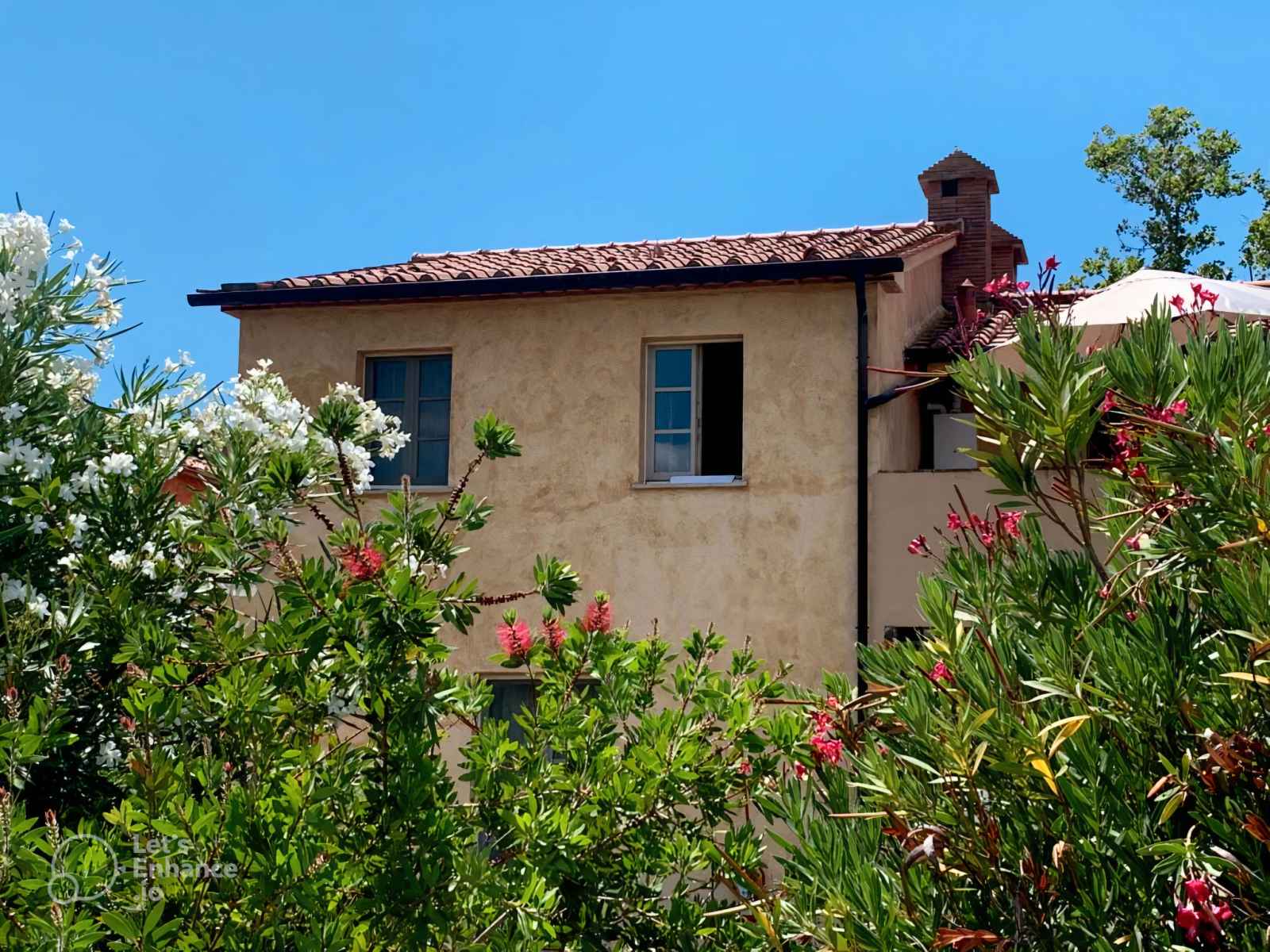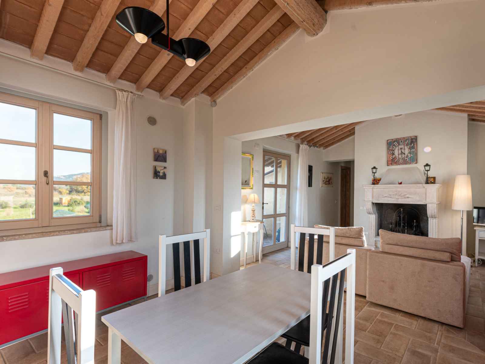 "quercia alta", apt 3 pièces 90 m2 au 1er étage. spacieux, complètement rénové en 2022, aménagement de bon goût et plaisant: à l'étage supérieur: (escalier extérieur) séjour/salle à manger ouvert avec cheminée, table pour les repas, tv (satellite) et air-conditionné. sortie sur la terrasse. 1 chambre double avec air-conditionné. 1