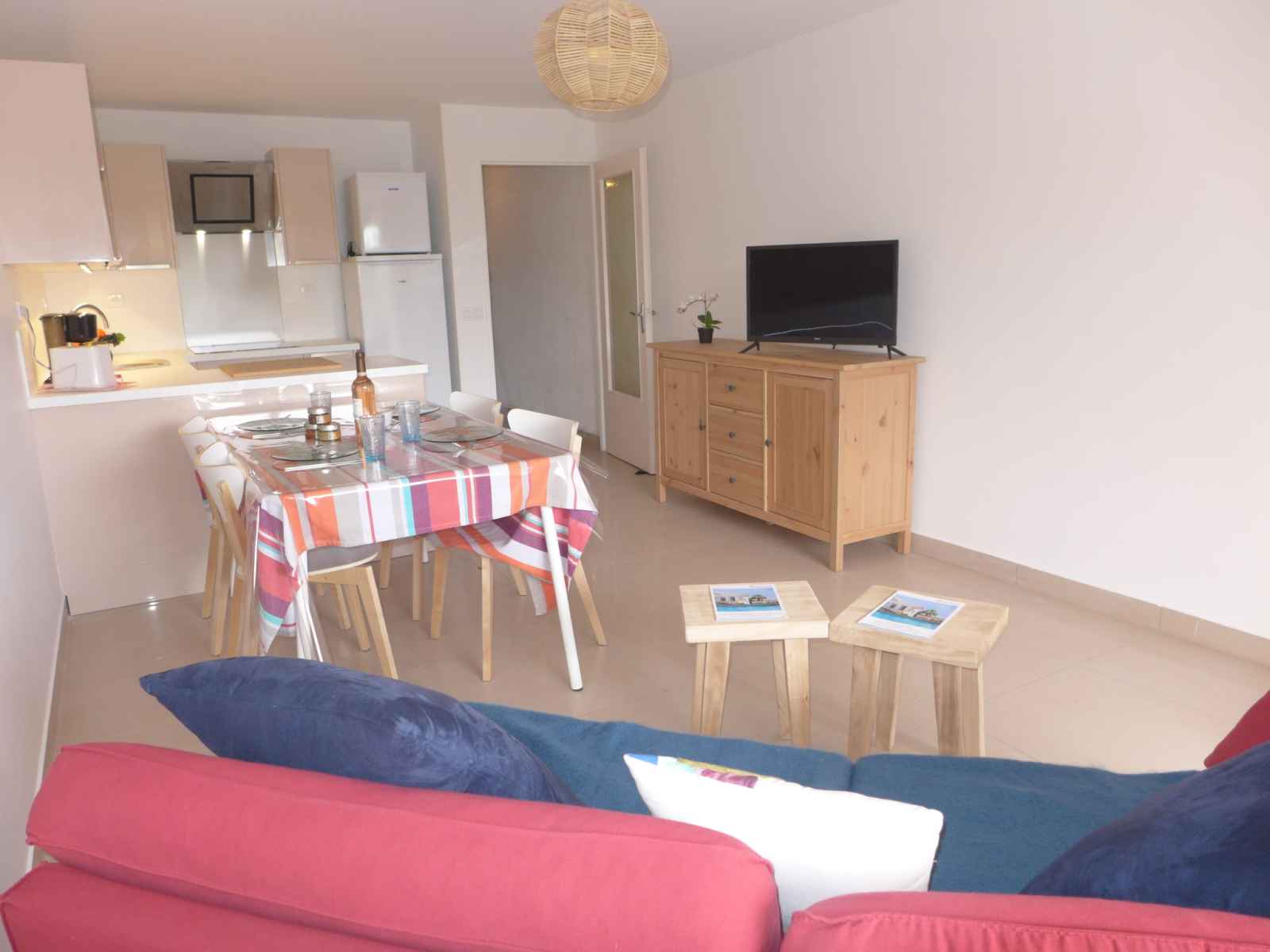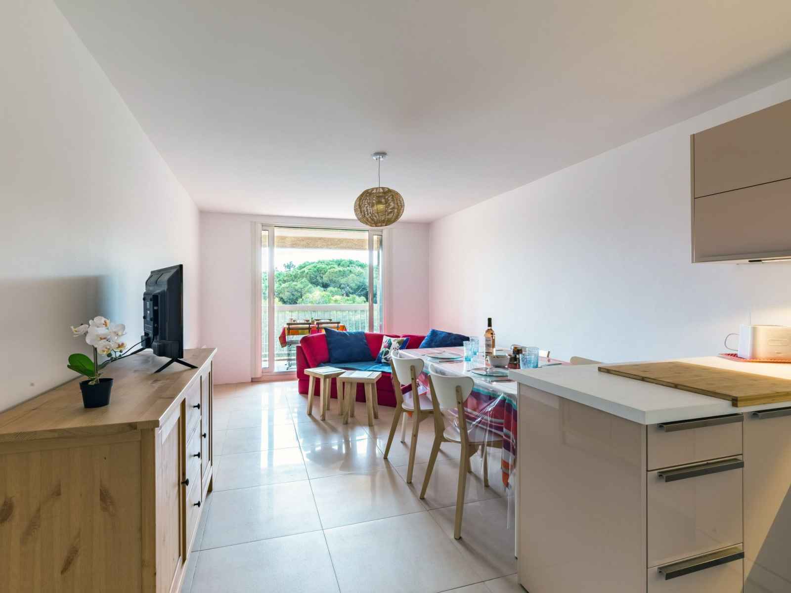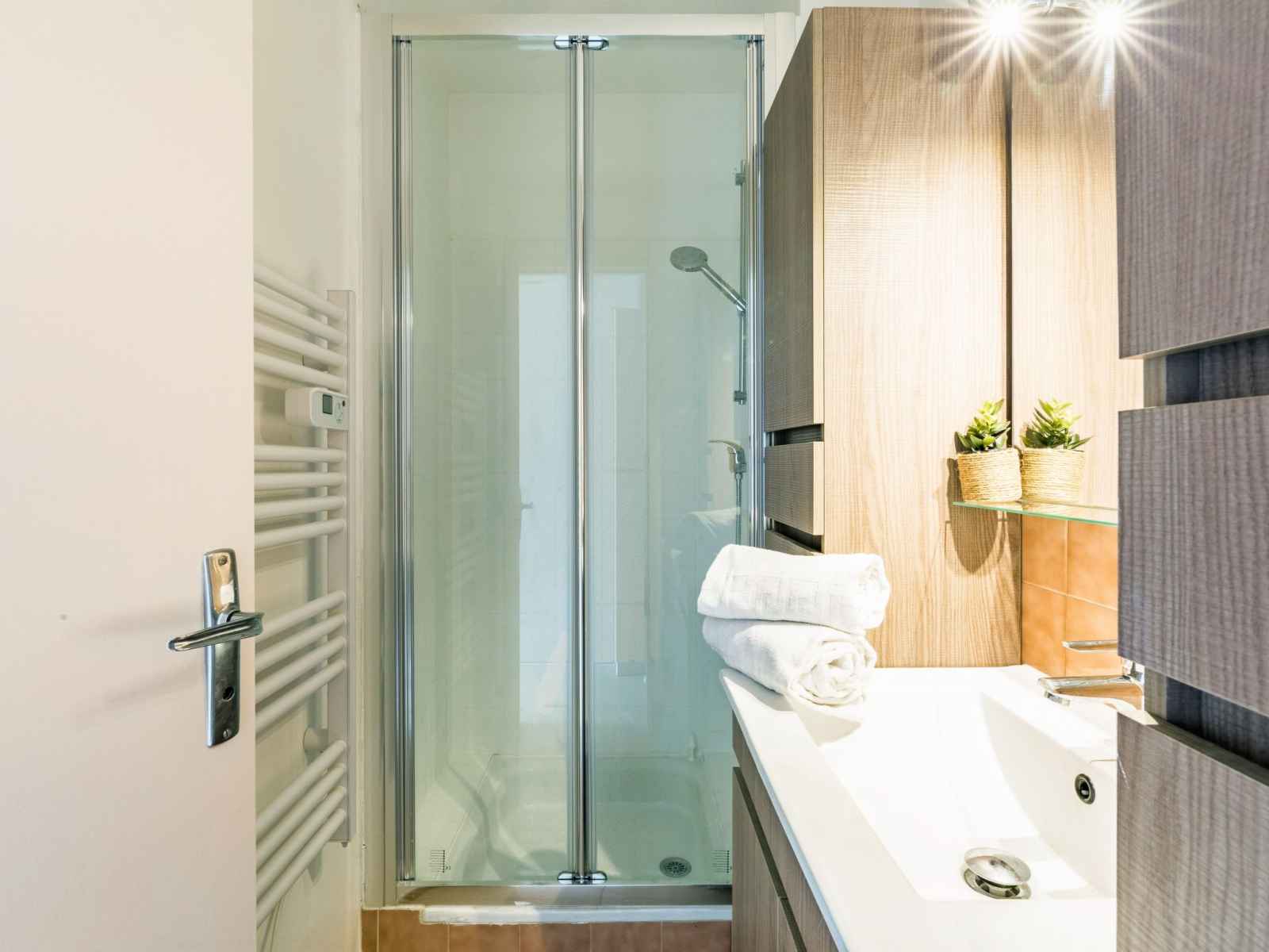Apt 3 pièces 57 m2 au 2ème étage, situation sud. spacieux, complètement rénové en 2022, aménagement confortable et agréable: séjour/salle à manger avec baie vitrée avec tv (écran plat). sortie sur la terrasse. 1 chambre avec 1 grand-lit (1 x 160 cm, longueur 200 cm), lavabo, douche et ventilateur. 1 chambre avec baie vitrée avec 2