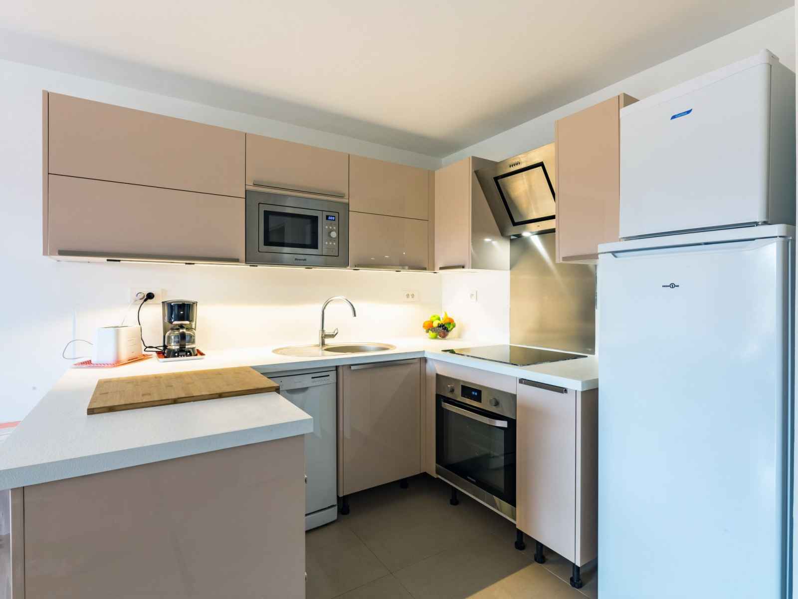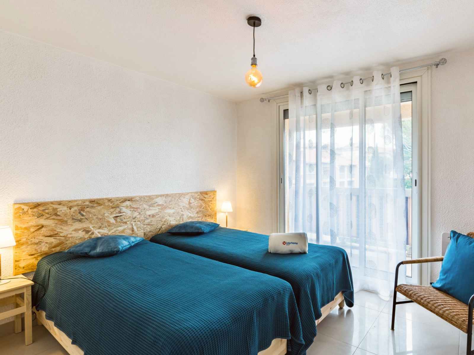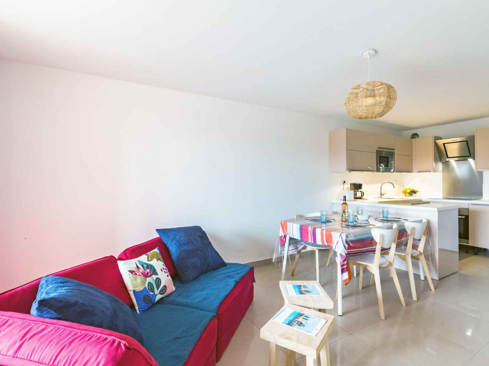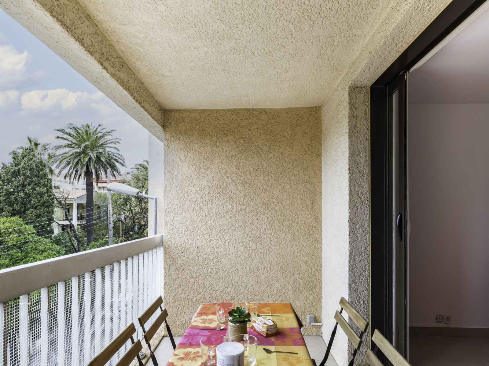 lits (80 cm, longueur 200 cm), ventilateur. Sortie sur le balcon. Cuisine ouverte (four, lave-vaisselle, 4 plaques vitrocéramiques, grille-pain, bouilloire électrique, micro-ondes, congélateur, cafetière électrique). Salle de bains, WC séparé. Chauffage électrique. Balcon 5 m2, terrasse 7 m2. Meubles de terrasse. A disposition: lave-linge, fer à repasser, sèche-cheveux. Internet (Connexion WIFI, gratuit). Garage No 222. Veuillez noter: TV seulement FR. Détecteur de fumée. FJF1950HTO