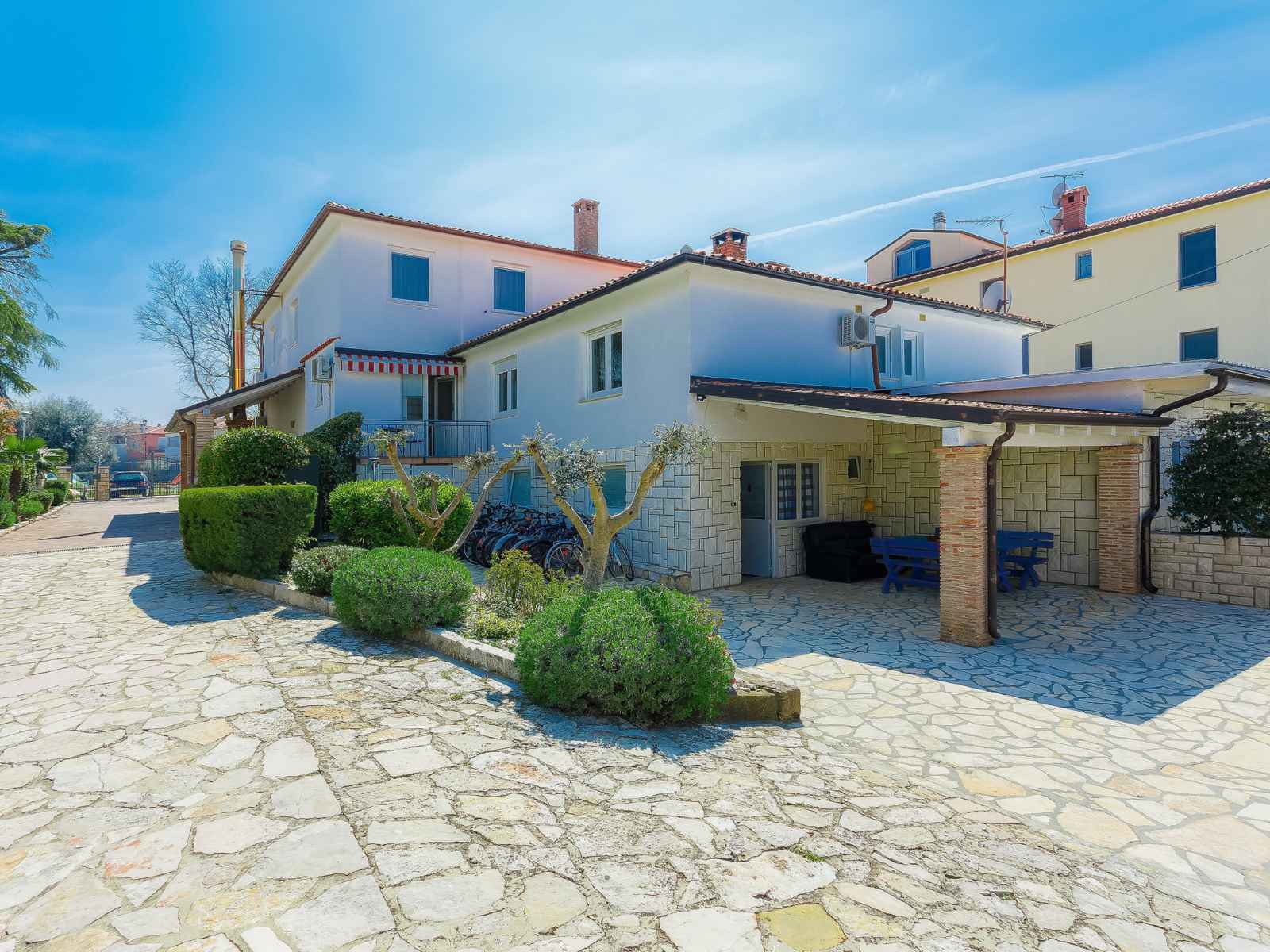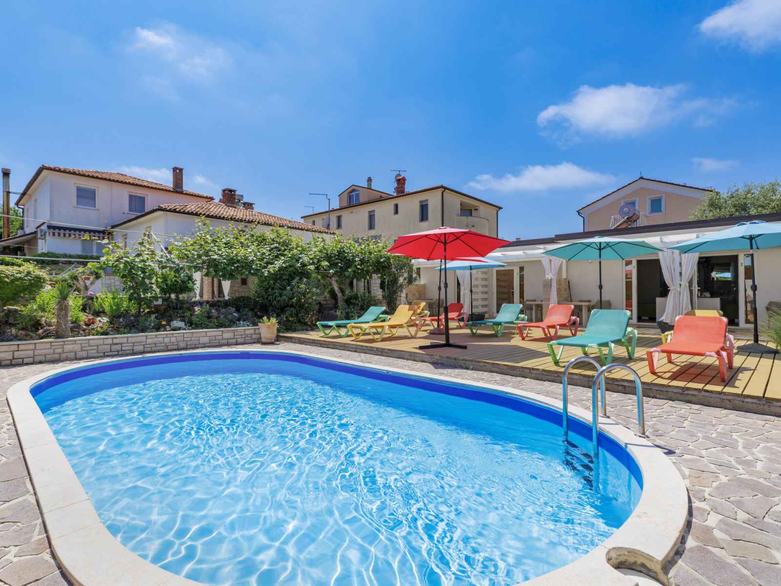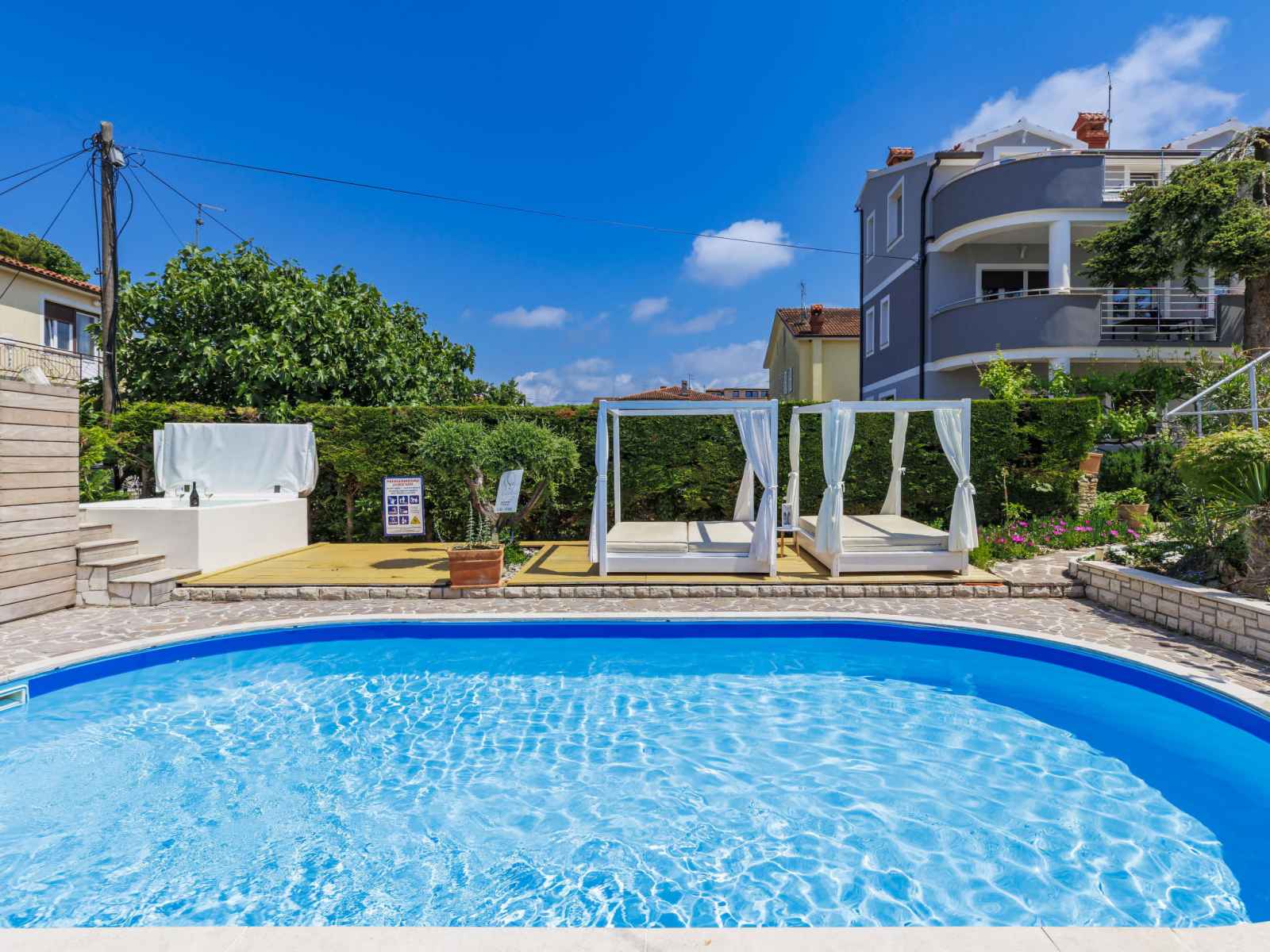 Immeuble "nika". dans le quartier de punta, à 2 km du centre d'umag, situation ensoleillée, à 300 m de la mer, à 300 m de la plage. en commun: terrain 1'500 m2 (clôturé), jardin entretenu, piscine (8 x 4 m, profondeur 135 cm, disponibilité saisonnière: 25.avr. - 19.sep.). douche extérieure, bain à remous , barbecue. infrastructures de