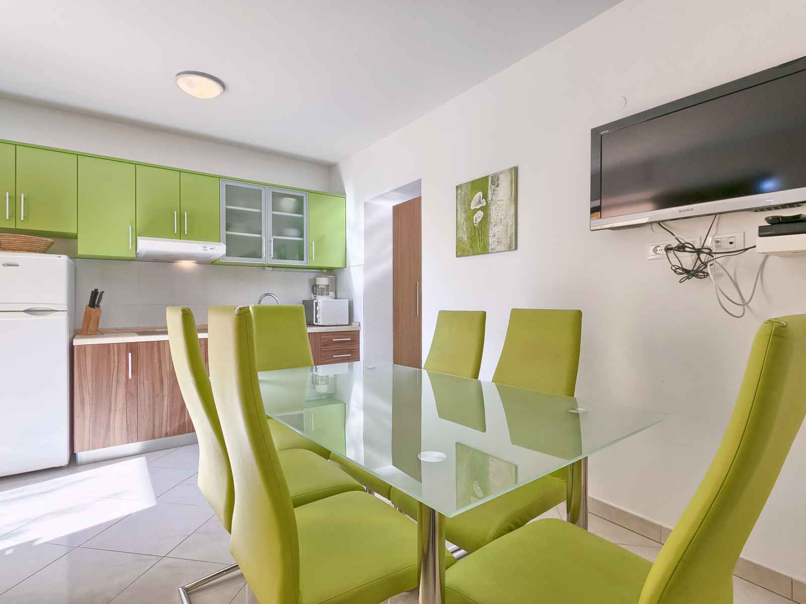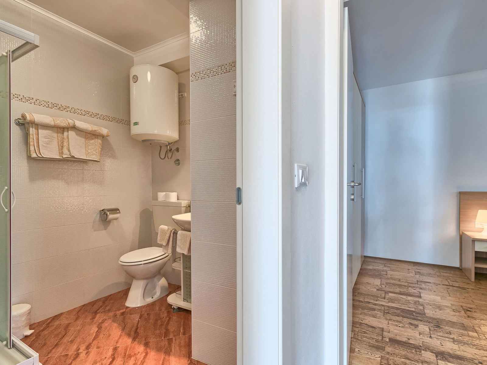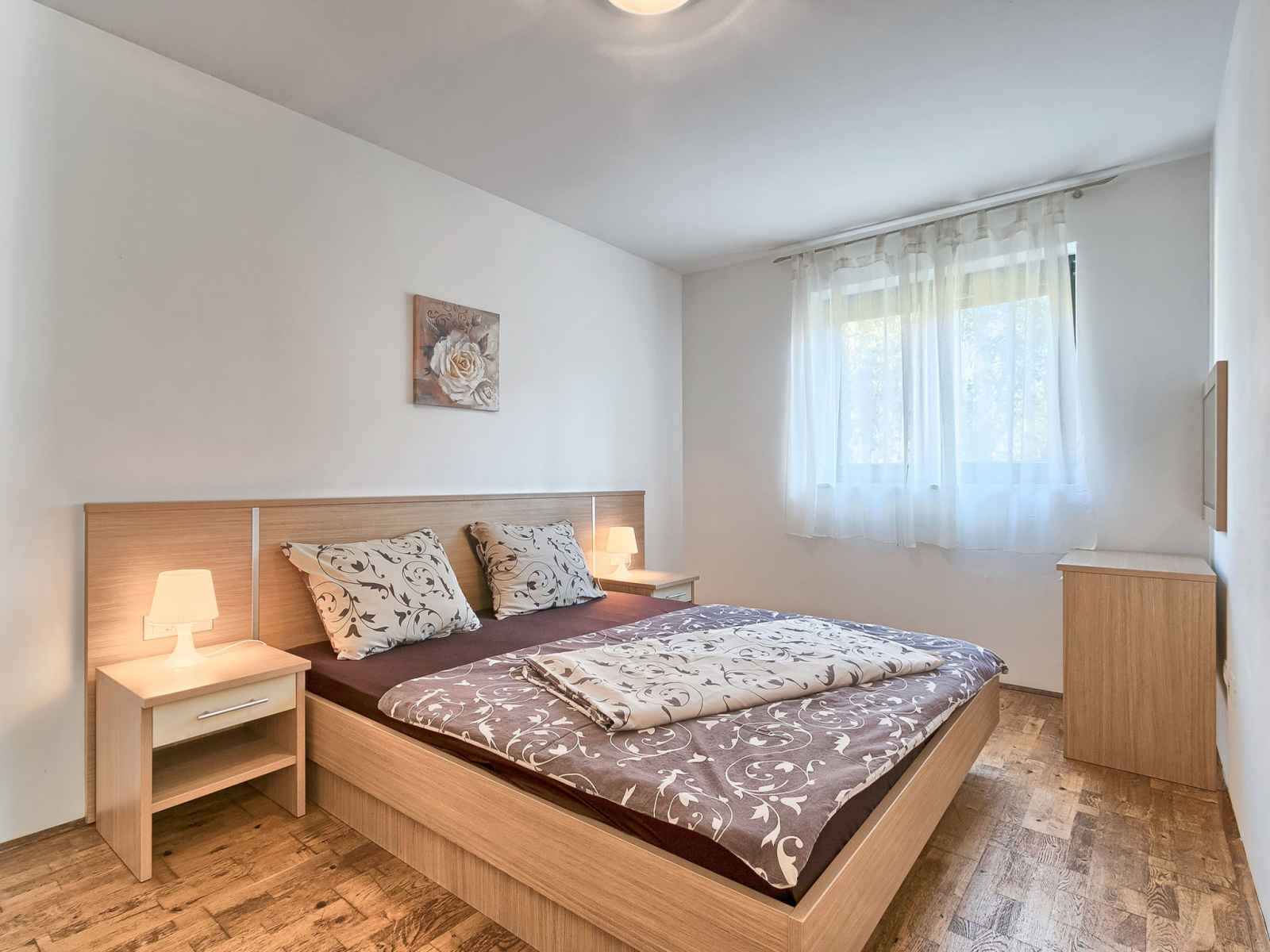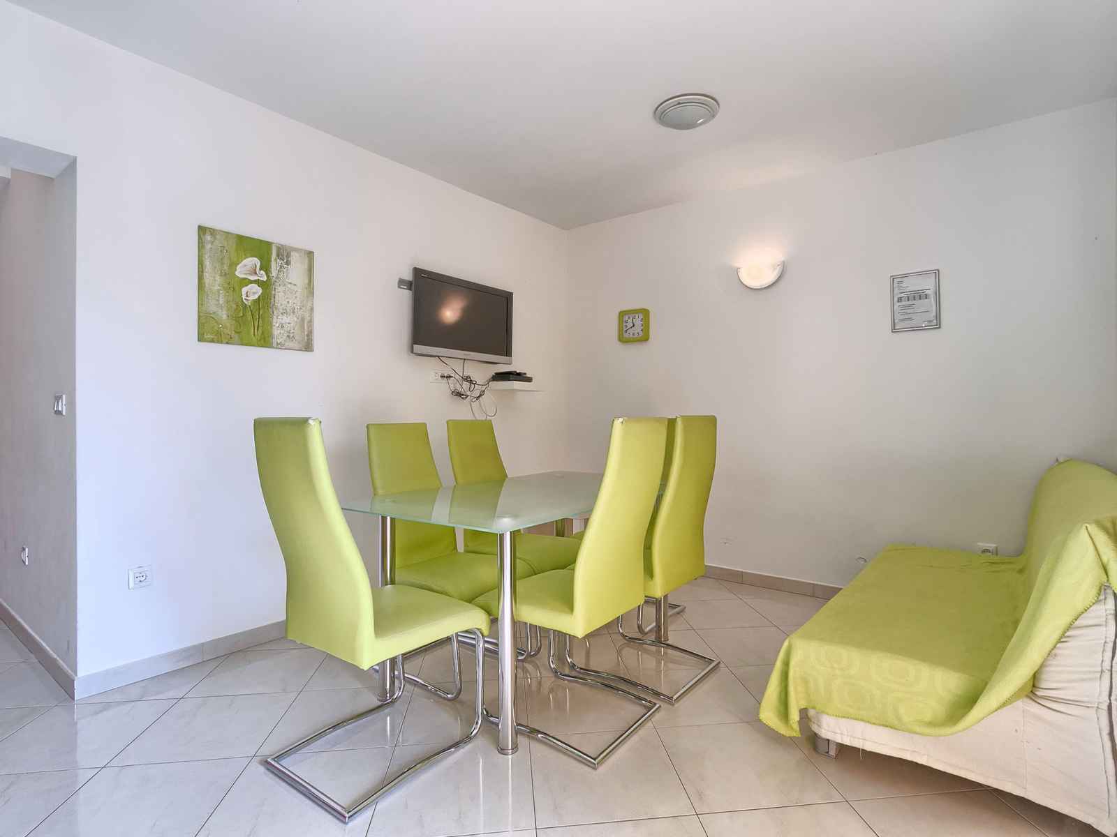Apt 3 pièces 52 m2, au rez-de-chaussée. séjour/salle à manger avec 1 divan-lit double et tv (satellite) (écran plat), air-conditionné. sortie sur la terrasse. 2 chambres, chaque chambre avec: 1 lit double (2 x 80 cm, longueur 200 cm). cuisine ouverte (2 plaques vitrocéramiques, micro-ondes, congélateur). douche/wc. terrasse 6 m2, couverte.