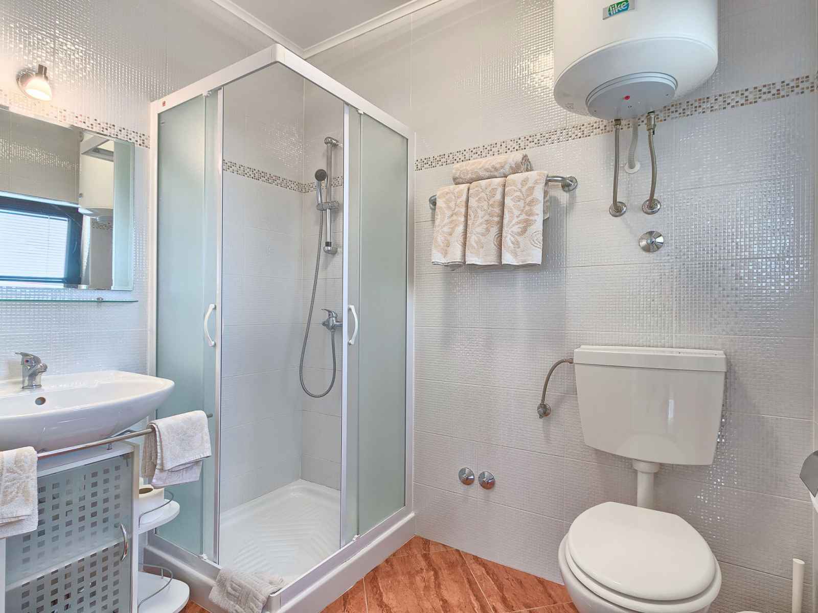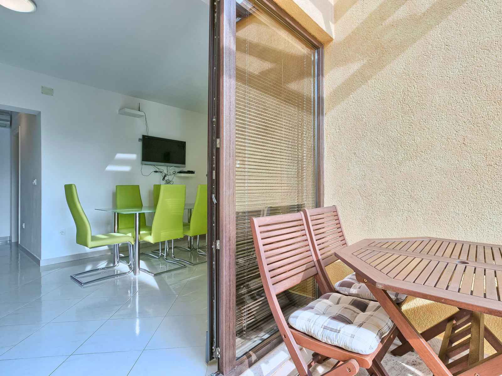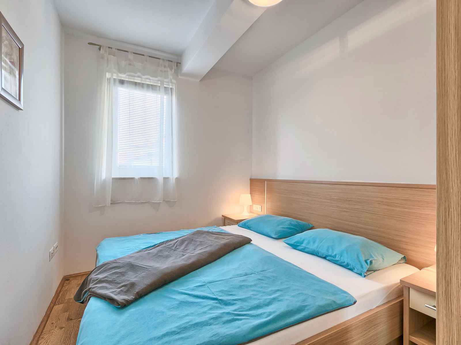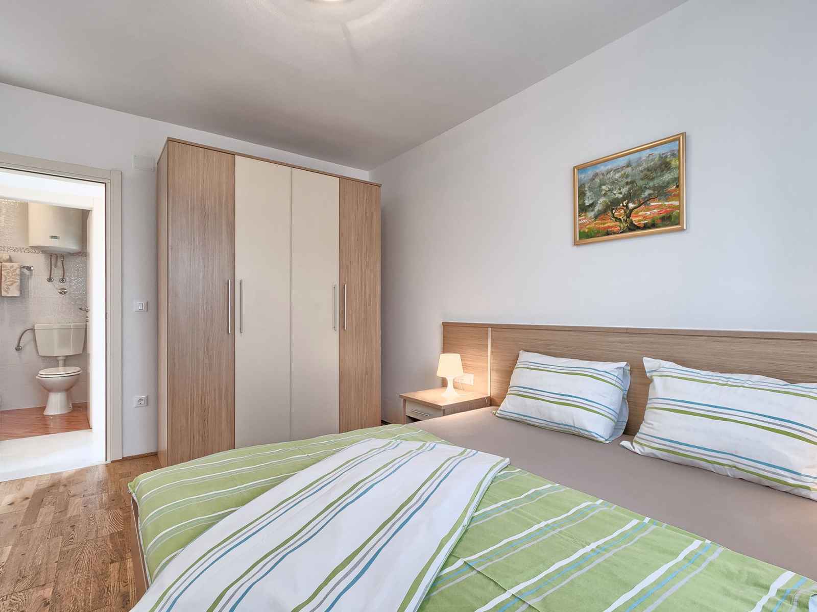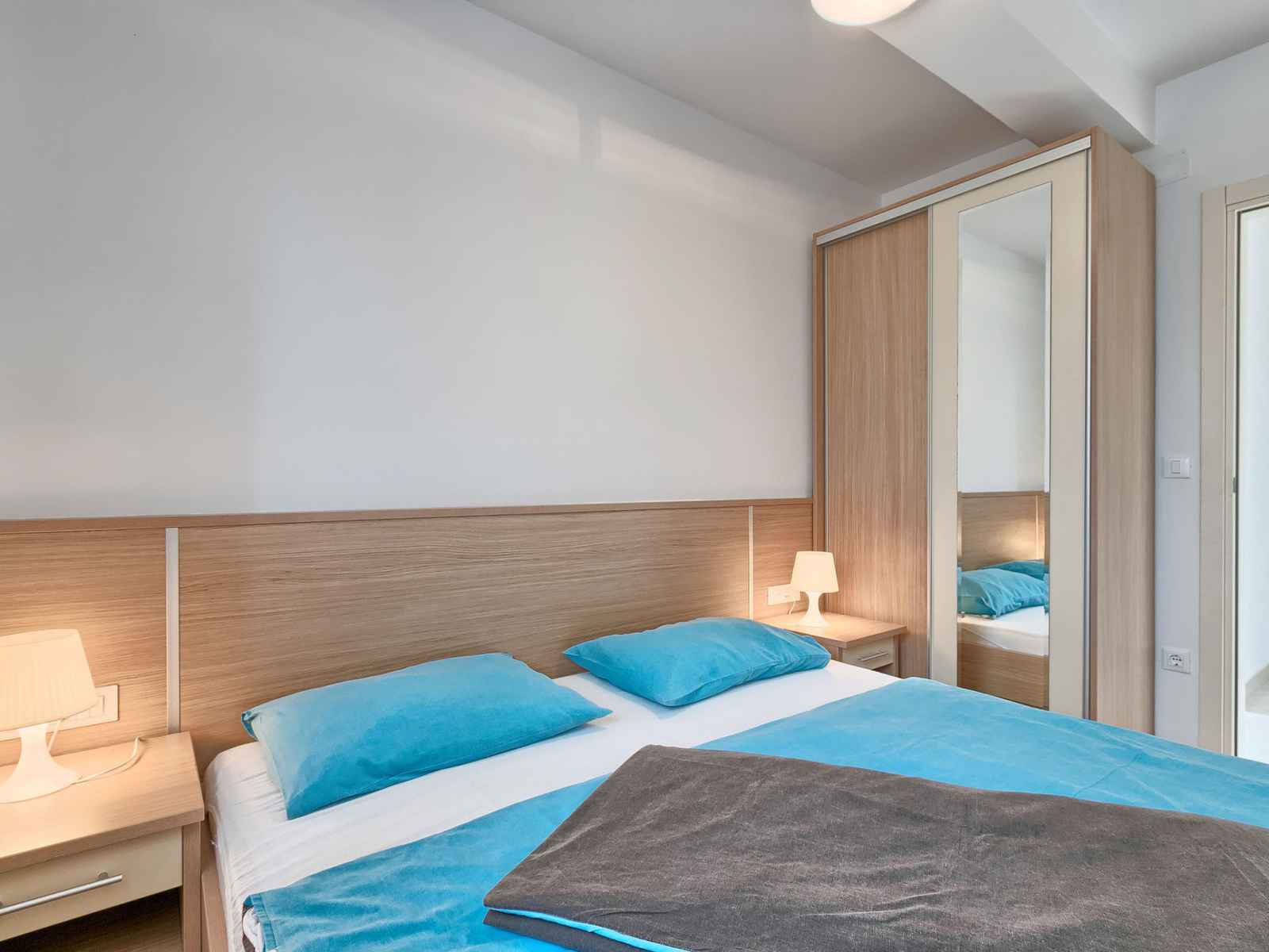 Apt 3 pièces 52 m2 au 1er étage. séjour/salle à manger avec 1 divan-lit double et tv (satellite) (écran plat), air-conditionné. sortie sur la terrasse. 2 chambres, chaque chambre avec: 1 lit double (2 x 80 cm, longueur 200 cm). cuisine ouverte (2 plaques vitrocéramiques, micro-ondes, congélateur). douche/wc. terrasse 6 m2. meubles de