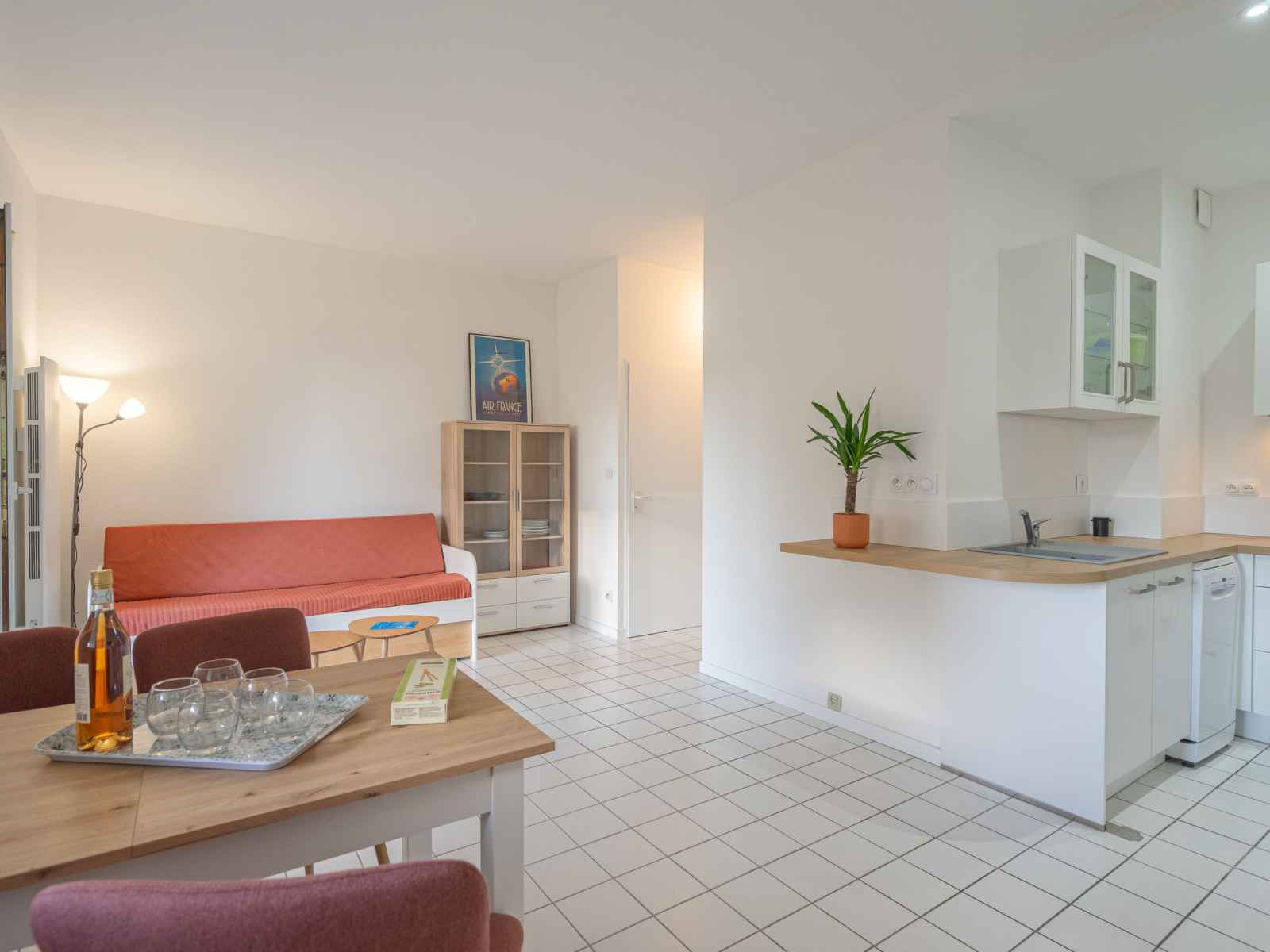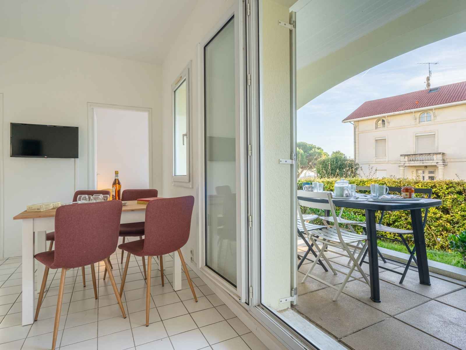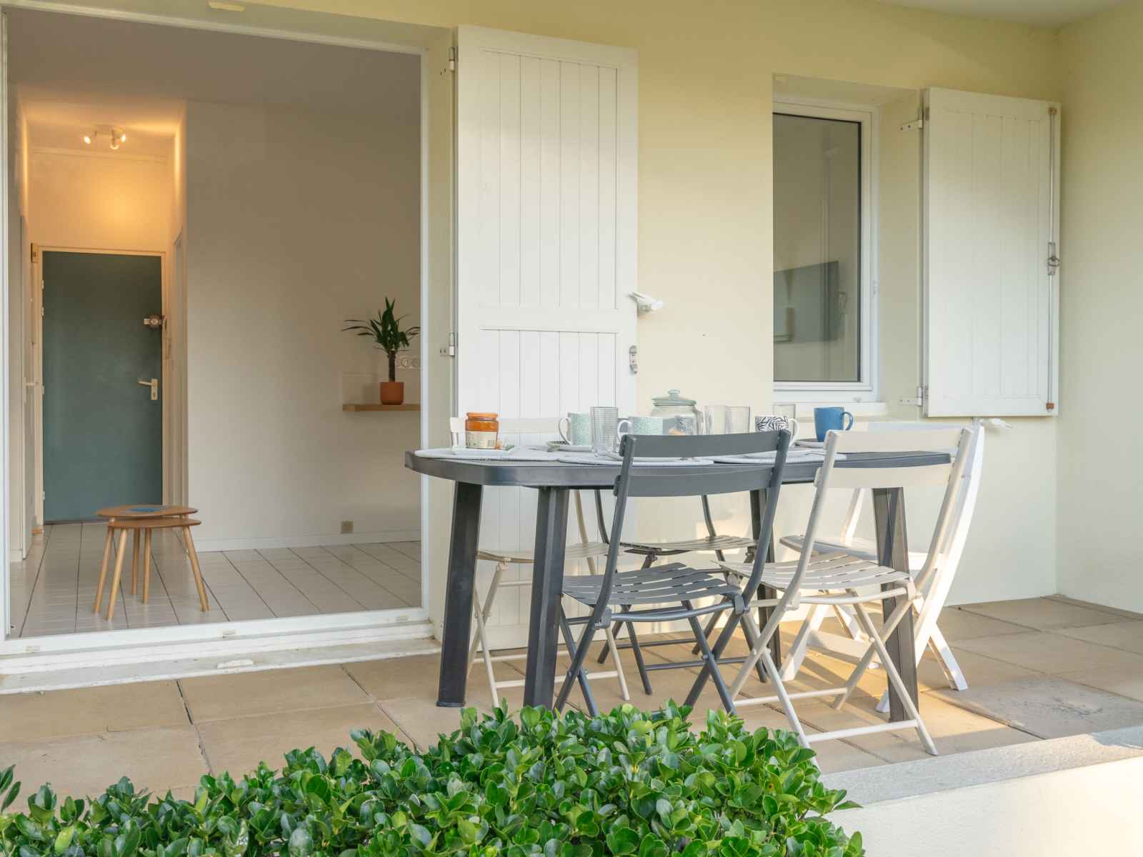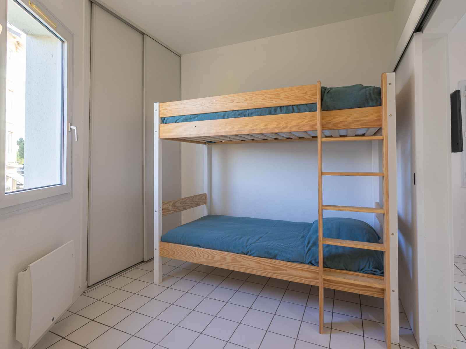 Apt 3 pièces 47 m2, rez-de-chaussée surélevé. rénové en 2023: séjour avec 1 divan-lit (80 cm, longueur 190 cm), tv (écran plat). sortie sur la terrasse. 1 chambre avec 1 grand-lit (1 x 140 cm, longueur 190 cm). 1 chambre avec 1 x 2 lits superposés (90 cm, longueur 190 cm). coin cuisine (lave-vaisselle, grille-pain, bouilloire électrique,